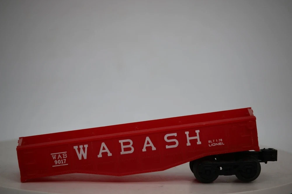 Lionel Trains O 027 Scale Model Train Wabash Gondola #9017 SKU#009291 PLEASE READ BEFORE PURCHASING Condition: Please carefully review all photos for details on the item's condition. Photos are part of the description, and any notable flaws will be highlighted. Combined Shipping: If purchasing multiple items, please request a revised invoice before paying to ensure accurate combined shipping costs. eBay's system may not calculate this correctly, which could lead to overcharges. Lighting Disclaimer: Photos are taken under bright lighting to highlight details, which may cause slight variations in color or hue depending on your lighting. If you need additional photos (e.g., in natural light) or more details, please ask before purchasing. As-Is Items: Items marked "AS-IS" are untested and sold at a discount. These items may work but could also be better suited for parts. Refunds will cover only the item price, not shipping. What’s Included: Only the items shown in the photos and described in the listing are included in the purchase. We strive to describe items thoroughly and provide clear photos. If you have any questions or concerns not addressed in the listing, feel free to ask before purchasing. Thank you for shopping with us!
