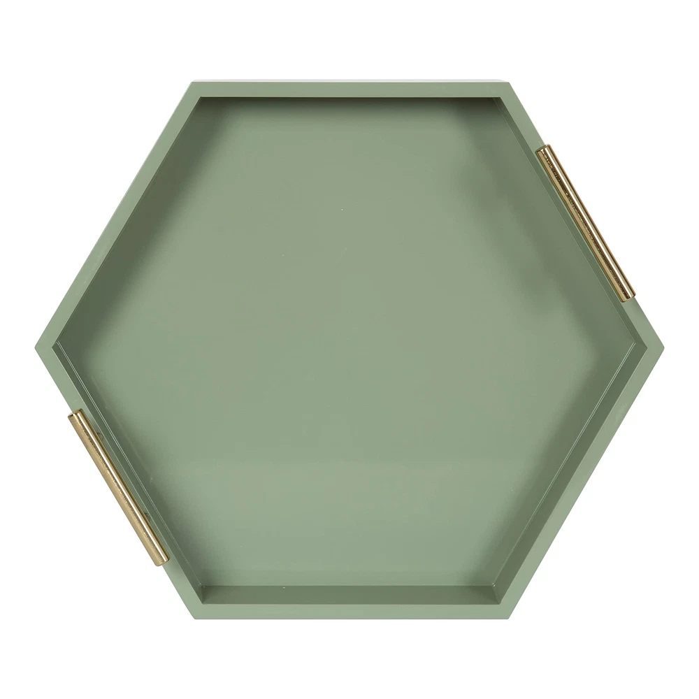Modern Design: This Lipton tray features a geometric hexagon shape with a sage green finish, making it a standout accent piece for a console, ottoman, or vanity Robust Handles: The Lipton tray features metal handles with a gold finish for a bold yet handy detailing that makes carrying from room to room a breeze Ample Size: The overall dimensions of this serving tray are 18 inches wide by 3.25 inches tall by 18 inches deep, making it fantastic for a variety of surfaces Versatile: Use the Lipton tray to serve drinks on coasters, showcase your favorite plants, or your favorite makeup and beauty supplies Protective Bottom: Felt pads are attached to the bottom of this tray to prevent damage to your hard surfaces