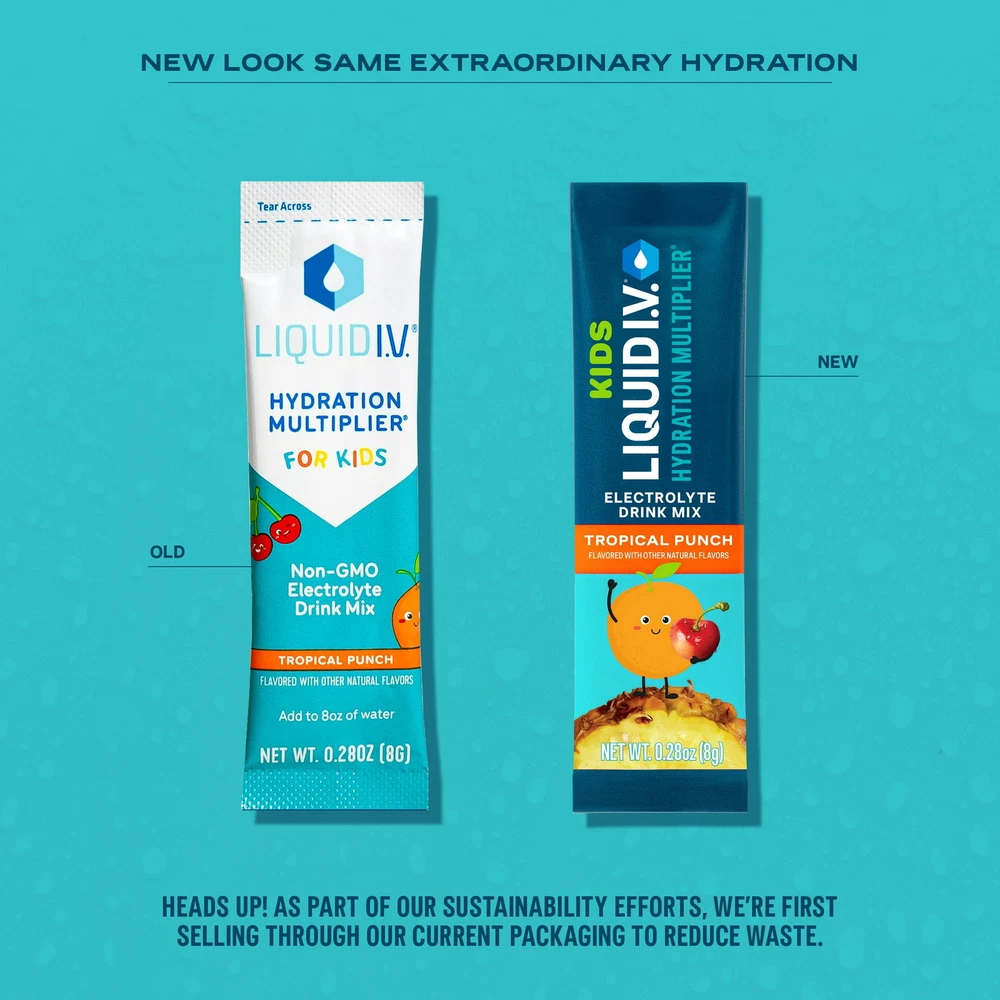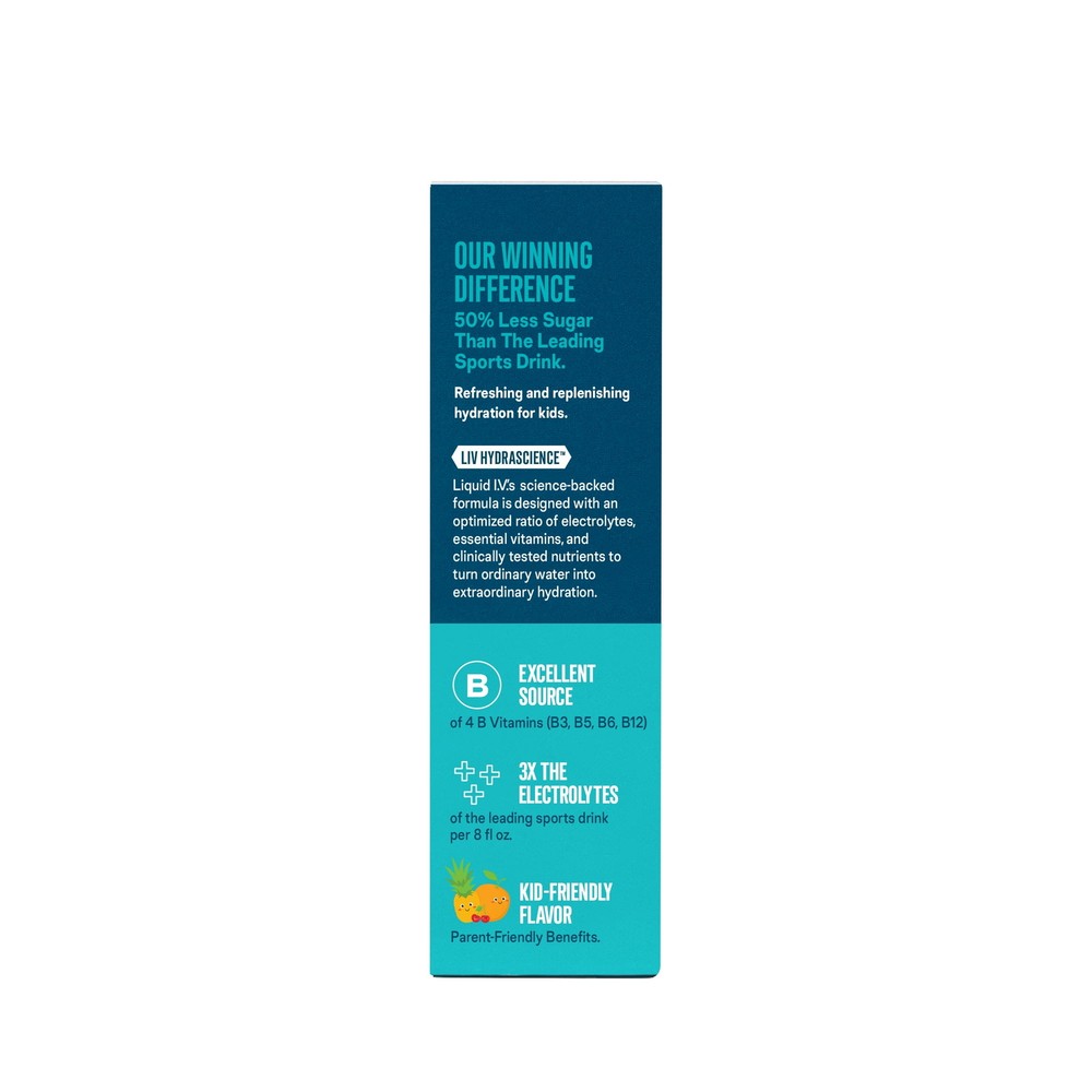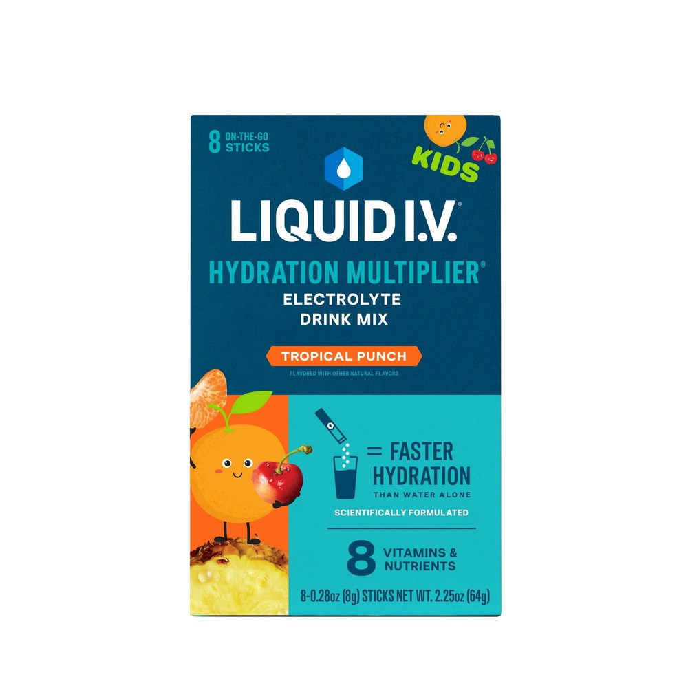 Shipping, arrives tomorrow Liquid I.V.® Cotton Candy Hydration Multiplier® for Kids Powdered Electrolyte Drink Mix, 8 Count Packets Rollback Liquid I.V.® Cotton Candy Hydration Multiplier® for Kids Powdered Electrolyte Drink Mix, 8 Count Packets Add +2 options Available in additional 2 options $7.98 current price $7.98 $10.98 Was $10.98 $3.47/oz Liquid I.V.® Cotton Candy Hydration Multiplier® for Kids Powdered Electrolyte Drink Mix, 8 Count Packets 129 4.2 out of 5 Stars. 129 reviews Save with Walmart Plus Shipping, arrives tomorrow Liquid I.V.® Crisp Apple Hydration Multiplier® for Kids Powdered Electrolyte Drink Mix, 8 Count Packets Rollback Liquid I.V.® Crisp Apple Hydration Multiplier® for Kids Powdered Electrolyte Drink Mix, 8 Count Packets Add +2 options Available in additional 2 options $7.98 current price $7.98 $10.98 Was $10.98 $3.47/oz Liquid I.V.® Crisp Apple Hydration Multiplier® for Kids Powdered Electrolyte Drink Mix, 8 Count Packets 36 4.4 out of 5 Stars. 36 reviews Save with Walmart Plus Shipping, arrives tomorrow Liquid I.V.® Lemon Lime Hydration Multiplier® Powdered Electrolyte Drink Mix, 3 Count Packets Liquid I.V.® Lemon Lime Hydration Multiplier® Powdered Electrolyte Drink Mix, 3 Count Packets Add $8.01 current price $8.01 $2.67/ea Liquid I.V.® Lemon Lime Hydration Multiplier® Powdered Electrolyte Drink Mix, 3 Count Packets 10 4.5 out of 5 Stars. 10 reviews Shipping, arrives in 3+ days RITZ Peanut Butter Sandwich Crackers, 8 - 1.38 oz Packs Best seller RITZ Peanut Butter Sandwich Crackers, 8 - 1.38 oz Packs Add +2 options Available in additional 2 options $3.97 current price $3.97 31.9 ¢/oz RITZ Peanut Butter Sandwich Crackers, 8 - 1.38 oz Packs 774 4.4 out of 5 Stars. 774 reviews Save with Walmart Plus Pickup today Delivery today COFFEE MATE Caramel Latte Powder Coffee Creamer 15 Oz. Canister | Non-dairy, Lactose Free Creamer COFFEE MATE Caramel Latte Powder Coffee Creamer 15 Oz. Canister | Non-dairy, Lactose Free Creamer Add +2 options Available in additional 2 options $4.98 current price $4.98 33.2 ¢/oz COFFEE MATE Caramel Latte Powder Coffee Creamer 15 Oz. Canister | Non-dairy, Lactose Free Creamer 321 4.2 out of 5 Stars. 321 reviews Save with Walmart Plus Pickup today Delivery today Shipping, arrives tomorrow Kool-Aid Sugar-Sweetened Cherry Artificially Flavored Powdered Soft Drink Mix, 63 oz Canister Kool-Aid Sugar-Sweetened Cherry Artificially Flavored Powdered Soft Drink Mix, 63 oz Canister Add +2 options Available in additional 2 options $8.48 current price $8.48 13.4 ¢/oz Kool-Aid Sugar-Sweetened Cherry Artificially Flavored Powdered Soft Drink Mix, 63 oz Canister 101 4.7 out of 5 Stars. 101 reviews Save with Walmart Plus Shipping, arrives tomorrow Kool-Aid Unsweetened Tropical Punch Artificially Flavored Powdered Drink Mix, 0.16 oz. Packet Best seller Kool-Aid Unsweetened Tropical Punch Artificially Flavored Powdered Drink Mix, 0.16 oz. Packet Add $0.38 current price $0.38 $1.90/oz Kool-Aid Unsweetened Tropical Punch Artificially Flavored Powdered Drink Mix, 0.16 oz. Packet 1793 4.2 out of 5 Stars. 1793 reviews Save with Walmart Plus Pickup today Delivery today RITZ Bits Cheese Sandwich Crackers, 8.8 oz Best seller RITZ Bits Cheese Sandwich Crackers, 8.8 oz Add +3 options Available in additional 3 options $3.46 current price $3.46 $3.88 Was $3.88 39.3 ¢/oz RITZ Bits Cheese Sandwich Crackers, 8.8 oz 387 4.2 out of 5 Stars. 387 reviews Save with Walmart Plus Pickup today Delivery today Milo’s Famous Sweet Iced Tea, 100% Natural, 20 fl oz Bottle Best seller Milo’s Famous Sweet Iced Tea, 100% Natural, 20 fl oz Bottle Add +3 options Available in additional 3 options $2.60 current price $2.60 2.7 ¢/fl oz Milo’s Famous Sweet Iced Tea, 100% Natural, 20 fl oz Bottle 4302 4.5 out of 5 Stars. 4302 reviews Save with Walmart Plus Pickup today Delivery today About this item Nutrition information Product details Hydration Multiplier® +Kids is a great-tasting, non-GMO electrolyte drink mix powered by LIV HYDRASCIENCE™ to deliver hydration faster than water alone. Our formula is designed with an optimized ratio of electrolytes and clinically tested nutrients to turn ordinary water into extraordinary hydration. Hydration Multiplier® +Kids has 3x the electrolytes and 50% less sugar than the leading sports drink*, and 8 vitamins and nutrients. *per 8 fl oz, Hydration Multiplier® for Kids has 6g sugar; the leading sports drink has 14g of sugar. Two sticks per day is recommended for children 3 years and older. At Liquid I.V.®, we believe a healthier world for all begins with equitable access to clean and abundant water. We partner with leading water, humanitarian, and community-based organizations to advance innovative solutions that help communities protect their water and their future. HYDRATION MIX: A great-tasting, non-GMO electrolyte drink mix for kids that delivers hydration faster than water alone. KID-FRIENDLY FLAVORS: Tropical Punch has tangy notes of tangerine, pineapple and cherry flavors that kids love. SCIENCE-BACKED FORMULA: Powered by LIV HYDRASCIENCE™, Liquid I.V.® is designed with an optimized ratio of electrolytes and clinically tested nutrients. EXTRAORDINARY HYDRATION: Hydration Multiplier® +Kids has 3x the electrolytes and 50% less sugar than the leading sports drink*, and 8 vitamins and nutrients. Gluten-free, soy-free, and dairy-free. *per 8 fl oz, Hydration Multiplier® for Kids has 6g sugar; the leading sports drink has 14g of sugar. CONVENIENCE: Single-serving, travel-friendly packets are easy to enjoy on-the-go. Pour one easy-to-open packet into 8 oz of water, mix or shake, and hydrate. HYDRATION AID: Since 2015, we have donated over 55 million servings of Liquid I.V.® to those in need around the globe, and donate over 1% of our revenue to our Impact programs. Two sticks per day is recommended for children 3 years and older.