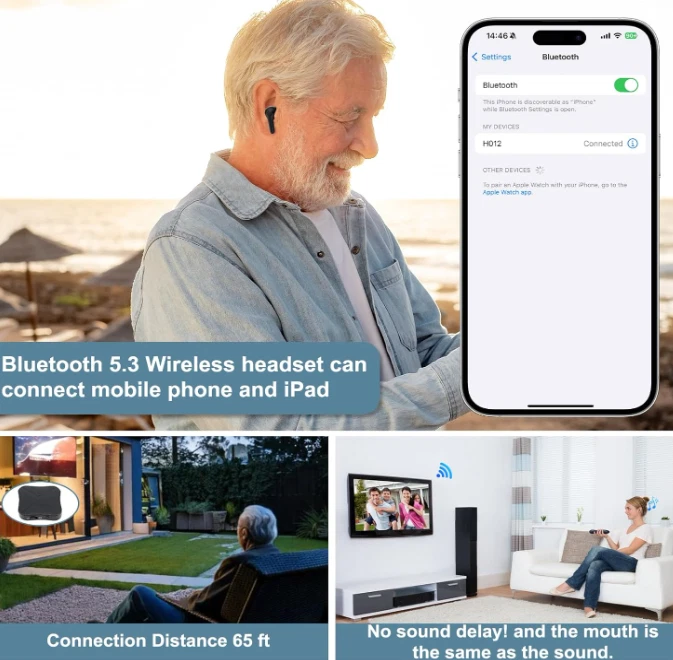 Get Fast! Fast Delivery! Clear Voice & Intelligent noise reduction】Wireless headphones for TV offer superior audio clarity with advanced 16-channel digital sound processing.Wireless headphones for TV allow users to easily adjust the volume,3-level volume easy adjustment and enjoy clear sound.Intelligent chip noise reduction technology can suppress howling and restore clear sound quality without interference in noisy environment. These are also great for people with hearing impairments. 【No Sound Delay】TV headphones wireless feature Wireless transmission technology and offer ultra-low latency of <15ms,there will be no difference in mouth shape and voice. With this technology, the signal transmission distance of TV earbuds is longer, more stable, and not easily disconnected.Wireless TV headphones for seniors have a connection range of up to 20M/70FT. The wireless headset is specially designed with unique sound amplification function,can amplify the sound for daily communication with the outside world. 【EASY Operation】TV wireless headphones TX transmission technology, simply plug the audio cables into the ports on the transmitter and TV and power on everything to start using your wireless earbuds for TV. Wireless headphones are equipped with 2 audio cables: AUX 3.5mm, and RCA input options, are compatible with virtually every TV on the market.Headphones for elderly with Wireless transmission technology can make it easy to connect with devices such as mobile phones,can listen to music or make calls. 【LONG PLAY TIME & Immersive Viewing】The battery life of headphones for TV watching is up to 20 hours, allowing you to watch and listen for extended periods of time without needing to charge. When the wireless headphones does need recharging, you can simply place the headphones in the charging case,just 1 hour is needed to quickly replenish energy,charging case can be used for more than 15 hours. Wireless headphones are designed to provide a private, comfortable home entertainment experience,make your TV or Games time more enjoyable.without disturbing family or neighbors. [Warm Gift] TV headphones are a perfect warm gift to express your love for your family. Whether watching TV at home or chatting with family and friends to amplify the sound, wireless headphones are definitely a great gift for those in need! If you have any questions after purchase, please contact us and we will reply you within 10 hours. Tip: Our wireless headphones are suitable for adults with mild to moderate voice loss.
