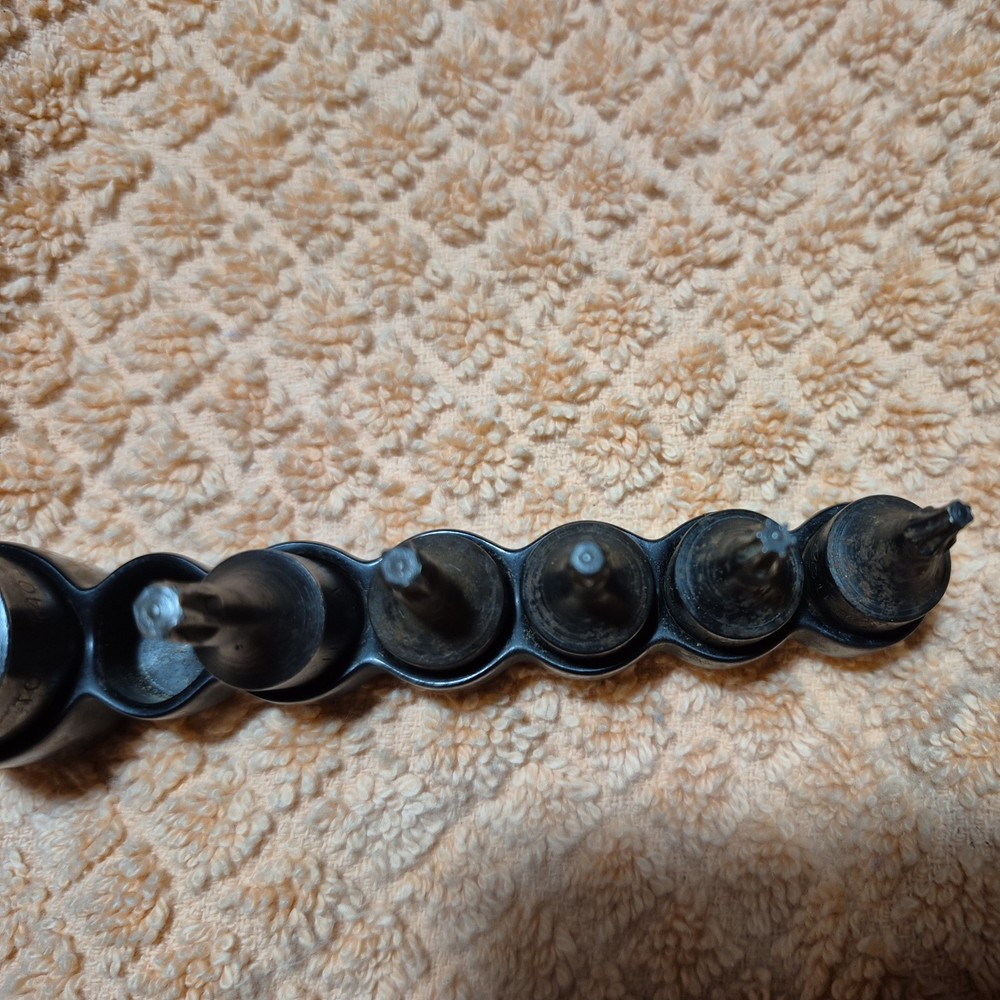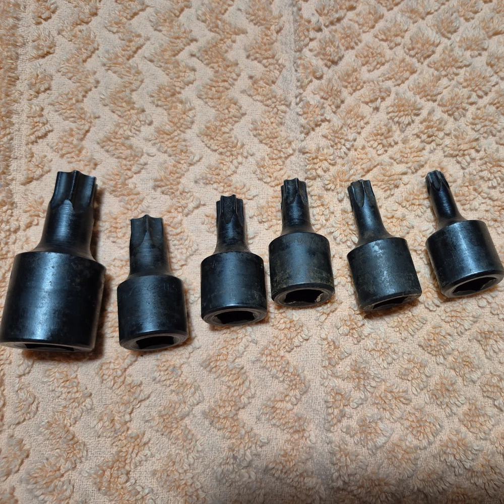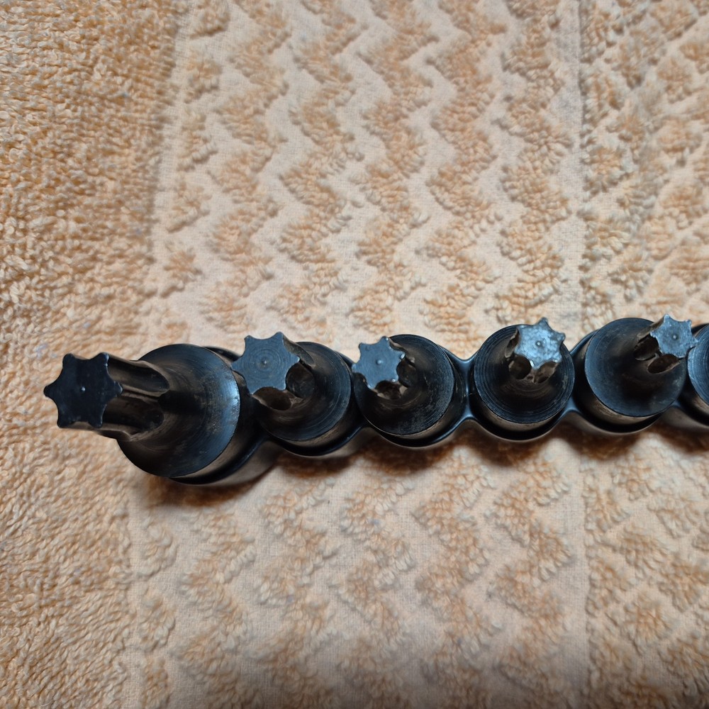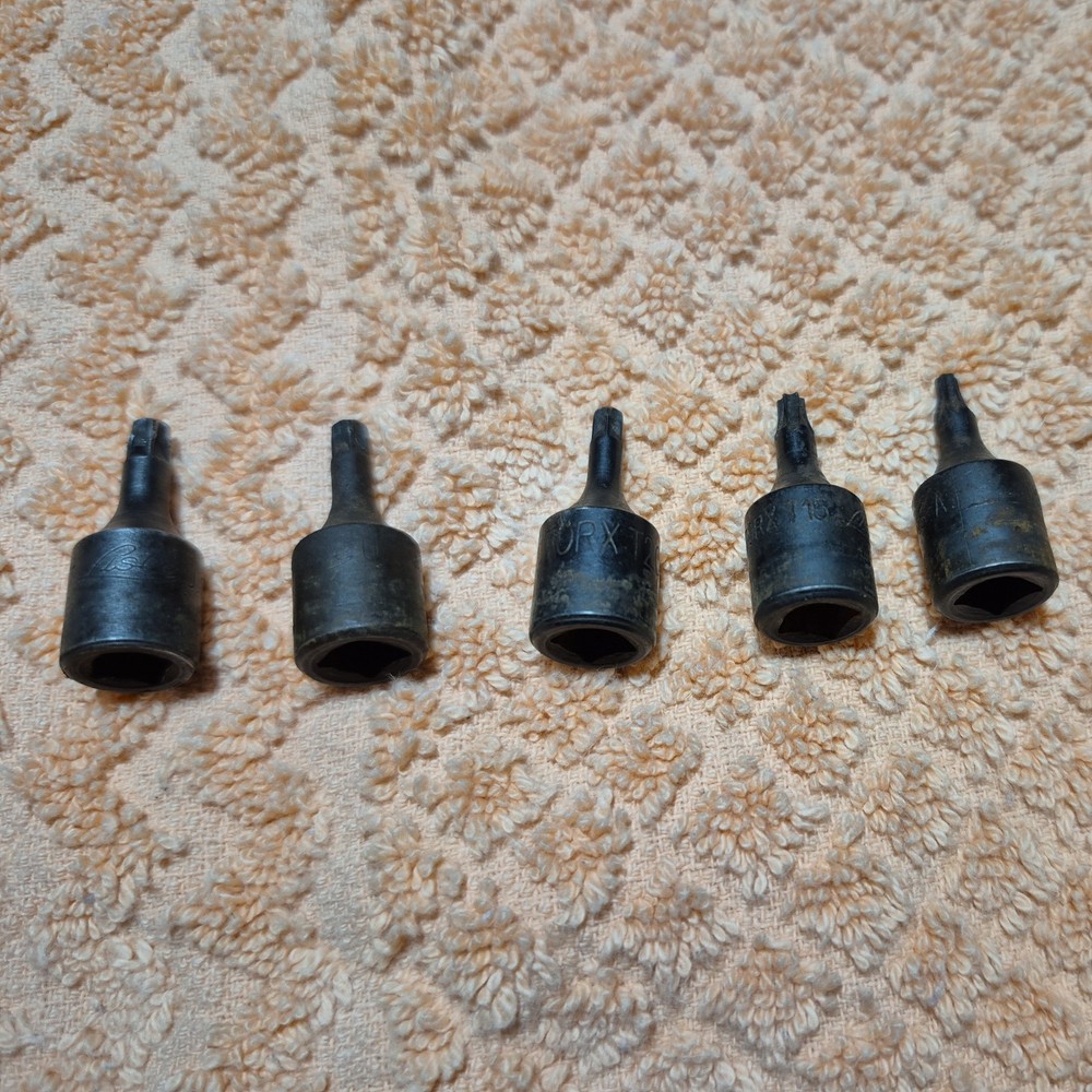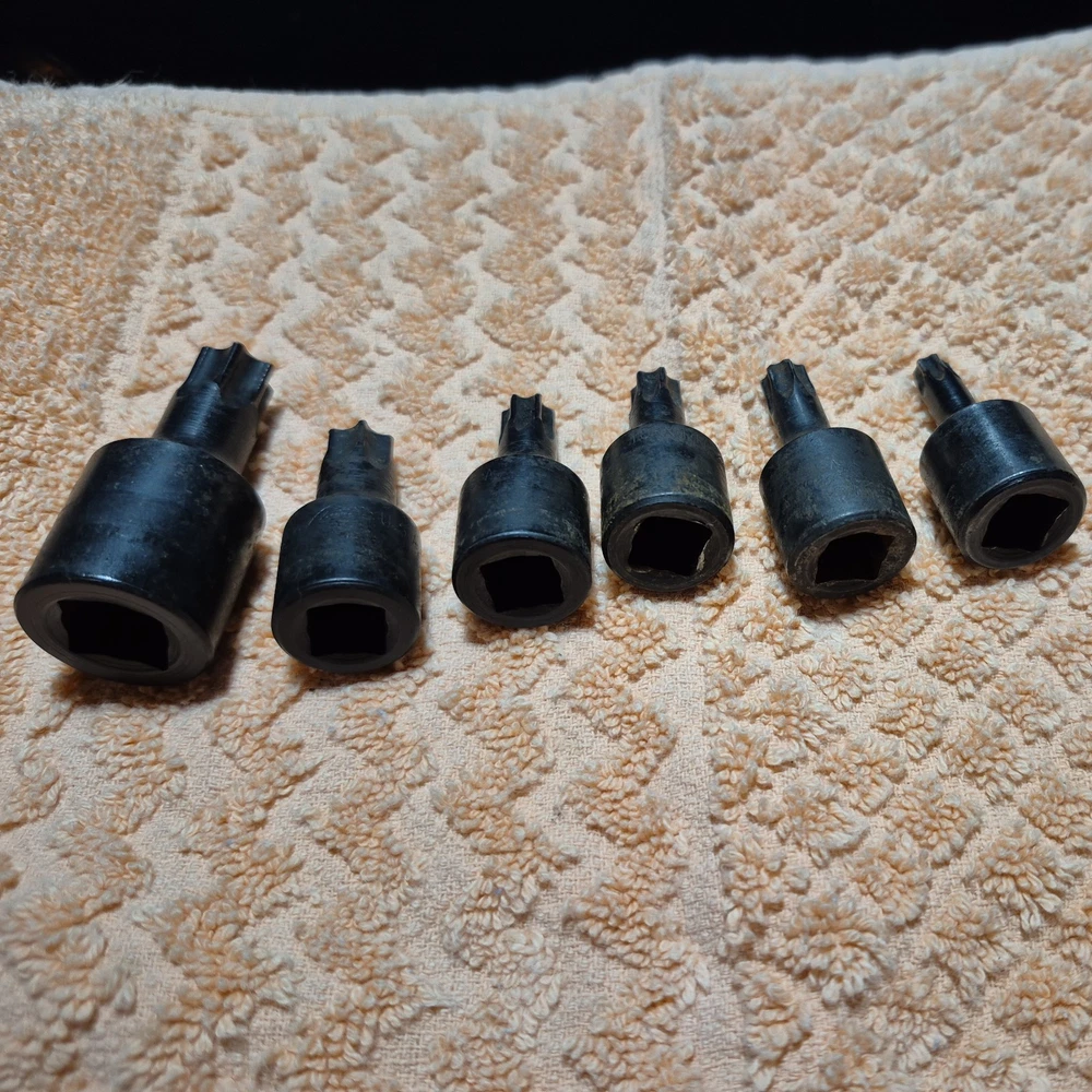 The Lisle Torx Bit Sockets are a set of 11 pieces designed for standard Torx drive types, specifically 3/8 and 1/4 drive sizes. Made in the United States by Lisle, these specialty sockets are included in a convenient holder for easy organization and storage. Ideal for automotive use, these high-quality hand tools are essential for professionals and DIY enthusiasts alike who require precision and reliability in their work. Good Used Shop Condition. 11 pieces plus holder. T 30 was not included from original set as the tip was busted .
