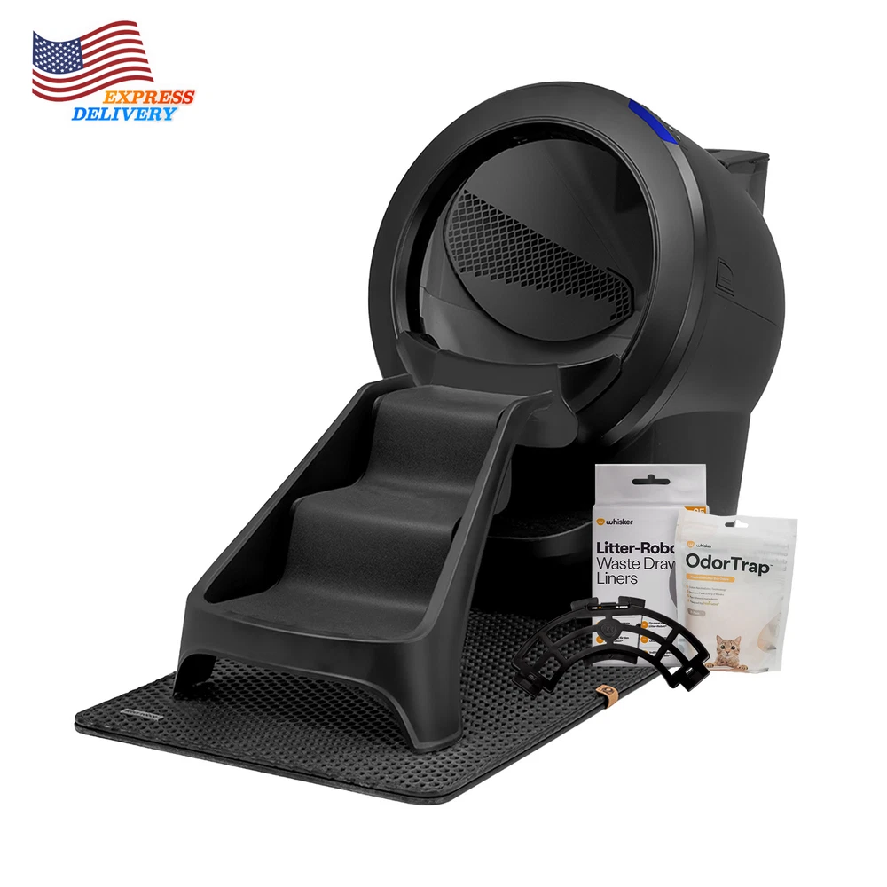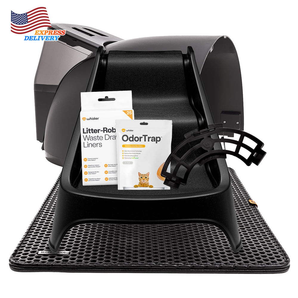 Stop scooping cat litter, neutralize litter box odors, and give your cat a clean bed of litter every time with Litter-Robot 4®. Our quietest self-cleaning litter box features advanced litter-sifting technology, reduced litter tracking, a larger waste drawer for greater capacity, and real-time monitoring of waste and litter levels. Track your cat’s weight and litter box activity in the Whisker app. The Litter-Robot 4 LitterHopper® handles the task of refilling litter to optimal levels so you don’t have to, whether you’re home or away. WARNING: This product can expose you to chemicals including Carbon Black, which are known to the State of California to cause cancer. For more information go to: www.P65Warnings.ca.gov . Product Features: Automatic sifting technology provides a clean bed of litter with each go; use with almost any clumping litter OdorTrap® Packs and a tightly sealed waste drawer help neutralize litter box odors while LitterHopper® automatically dispenses litter into the globe as needed Comfortably accommodates up to 4 cats. Cats must weigh 3+ lbs to use in automatic mode Track litter and waste drawer levels, litter box activity, and your cat’s weight right from your phone WhiskerCare™ Warranty covers Litter-Robot® free for three years with USA service, assembly, and design Includes: Litter-Robot 4 Self-Cleaning Cat Litter Box Litter-Robot 4 Fence LitterHopper Litter-Robot 4 Ramp Litter-Robot LitterTrap Mat OdorTrap Holder OdorTrap 6 Pack 25 Waste Drawer Liners 3-Year WhiskerCare Extended Warranty Specifications: Product Dimension: 22” x 29” x 30”