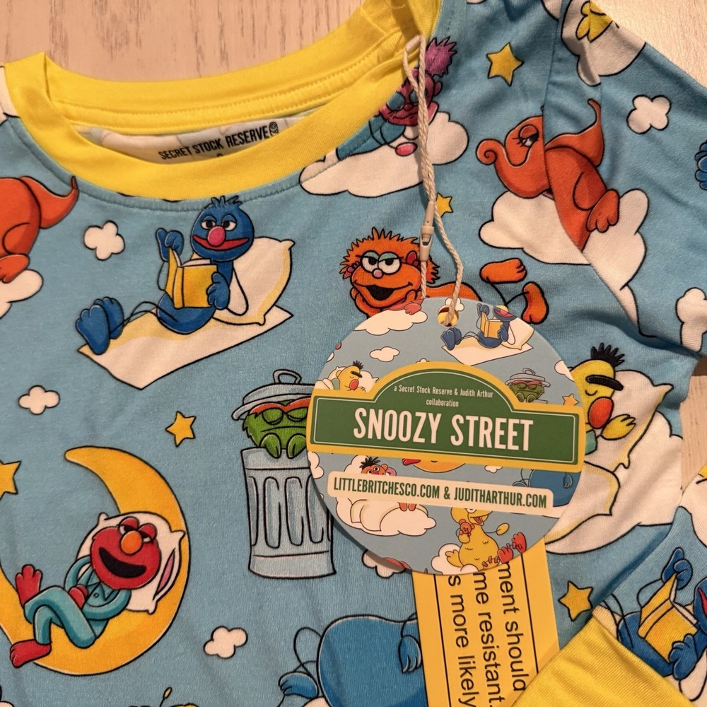 Adorable 2-piece bamboo pajama set from Little Britches Boutique Secret Stock Reserve in collaboration with Judith Arthur. This fun print features beloved Sesame Street characters including Elmo, Big Bird, Bert, Ernie, and Grover relaxing on clouds and moons. Made from ultra-soft bamboo viscose fabric, this set is breathable, stretchy, and comfortable for sleep or lounging. Details • Size: 3T unisex • 2-piece pajama set • Long sleeve top with elastic waist pants • Soft and stretchy bamboo fabric • Colorful Snoozy Street Sesame Street print • From the Secret Stock Reserve collaboration with Judith Arthur • New with tags Perfect for bedtime, lounging, or a gift for any Sesame Street fan. Ships same or next business day from my store South Peach Trends.