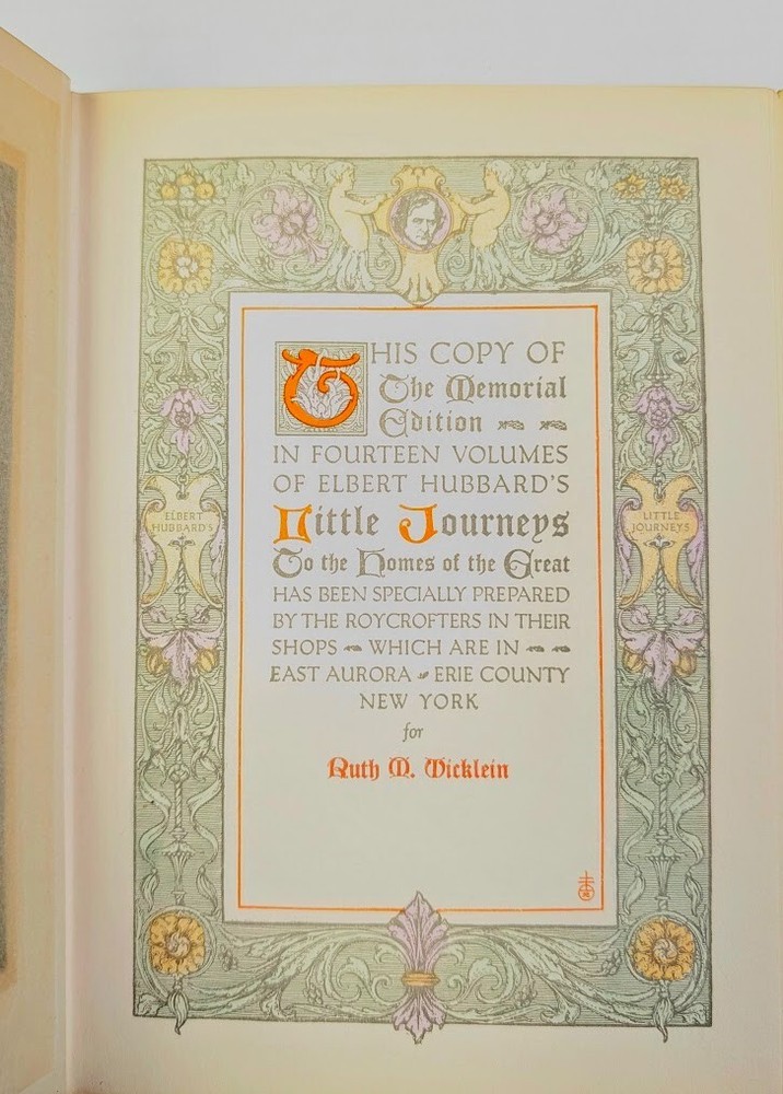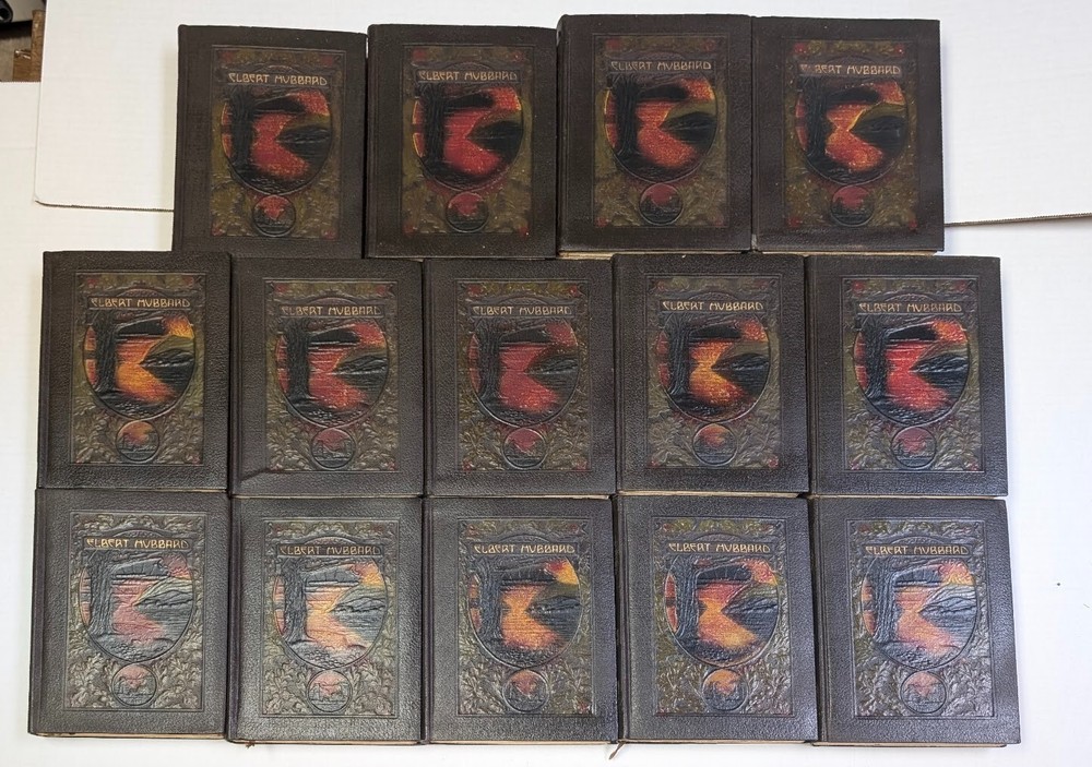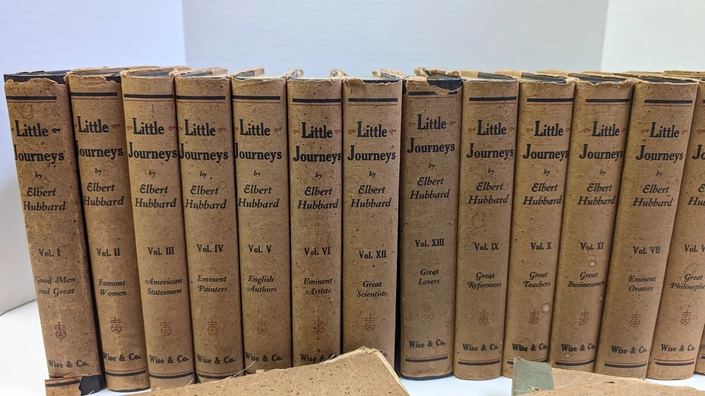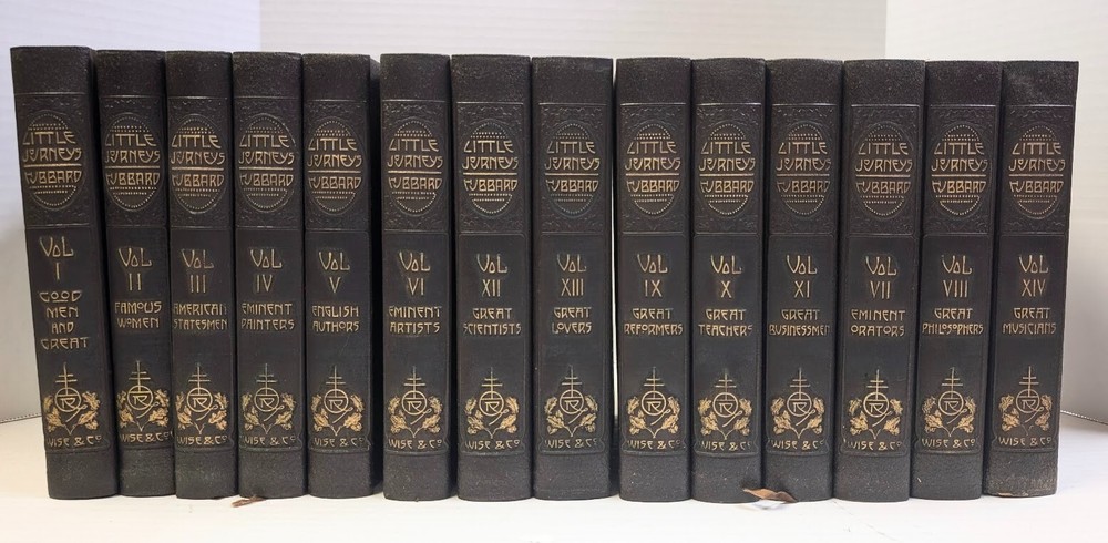 Complete set of 14 little journeys PLUS the guidebook and two notebooks. All leather-bound books come in their original dust jackets and feature gilded, deckle-edged paper. Memorial edition prepared for "Ruth M Wicklein" as seen on the first page of the first volume. Printed in 1916. The accompanying guidebook was printed in 1926. Kept in a climate-controlled room, smoke free home.