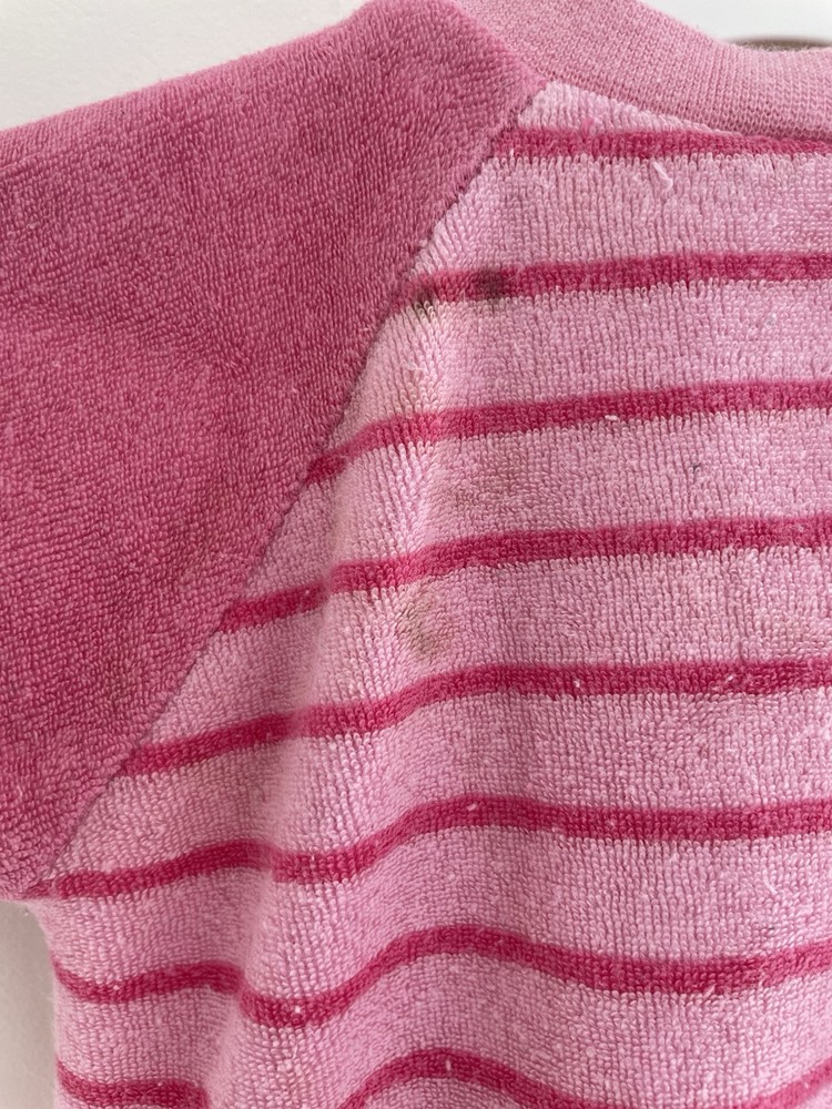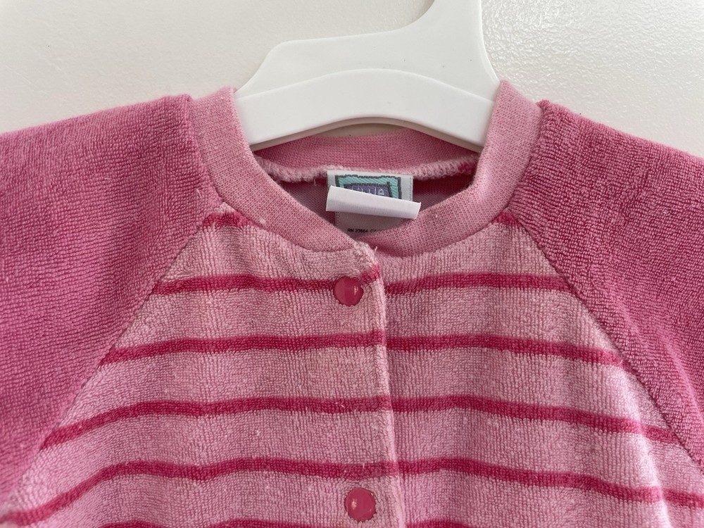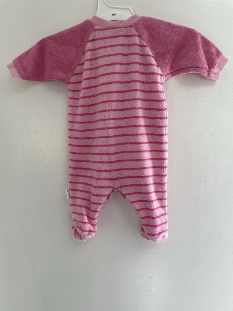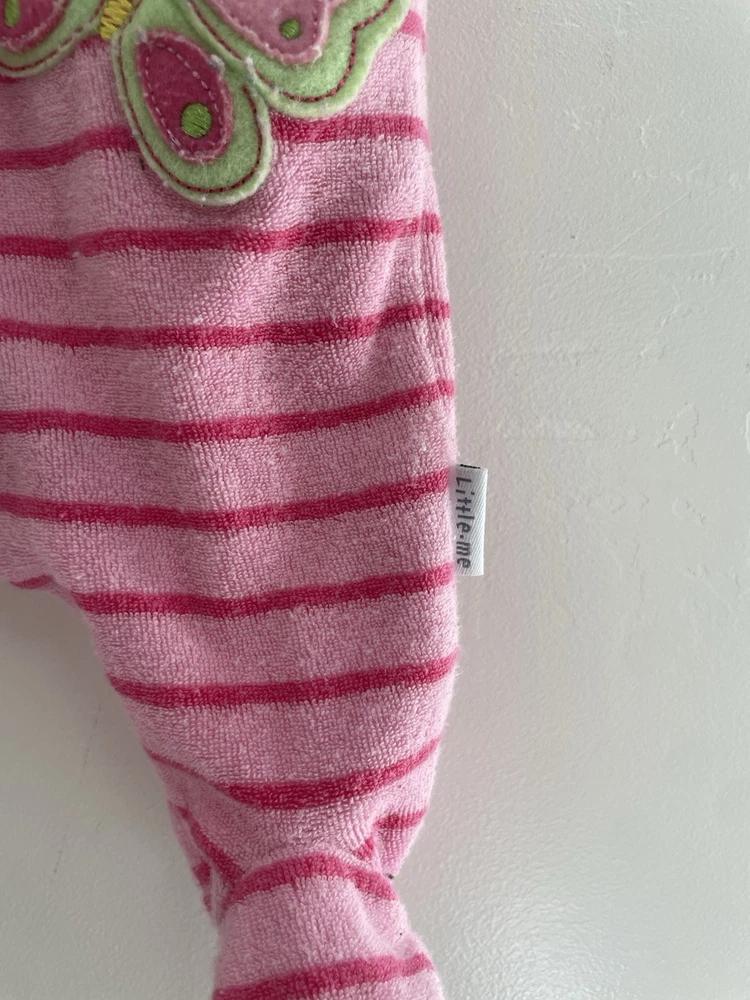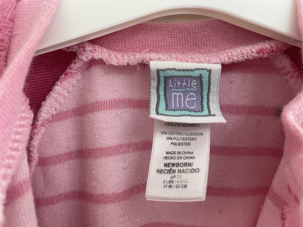 Number of Pieces: 1 Piece Country of Origin: China Occasion: Casual Color: Pink Material: 80% cotton, 20% polyester Size: Newborn Theme: Animals, Butterfly, Flower Seller Notes: “In good condition. There are light stains on the back. Free of rips.” Fabric Type: Terry Department: Girls Type: One-Piece Brand: Little Me Features: Comfort, Easy Care, Lightweight, Stretch Garment Care: Machine Washable Accents: Embroidered Sleeve Length: Long Sleeve Season: Fall, Spring, Summer, Winter Style: Sleep & Play Closure: Snap Pattern: Striped