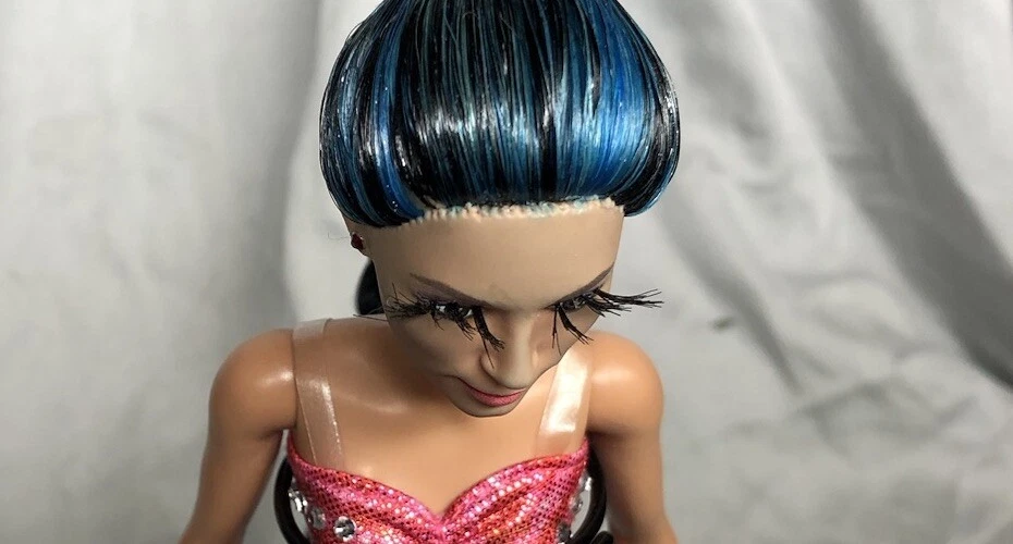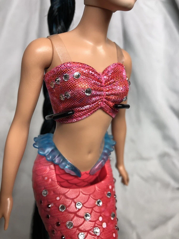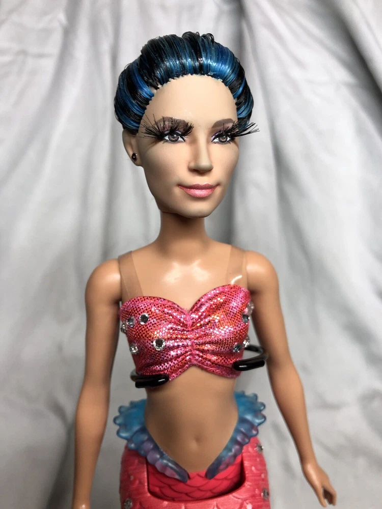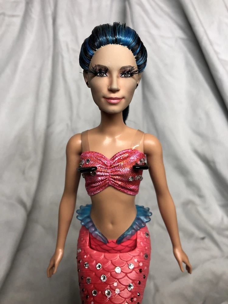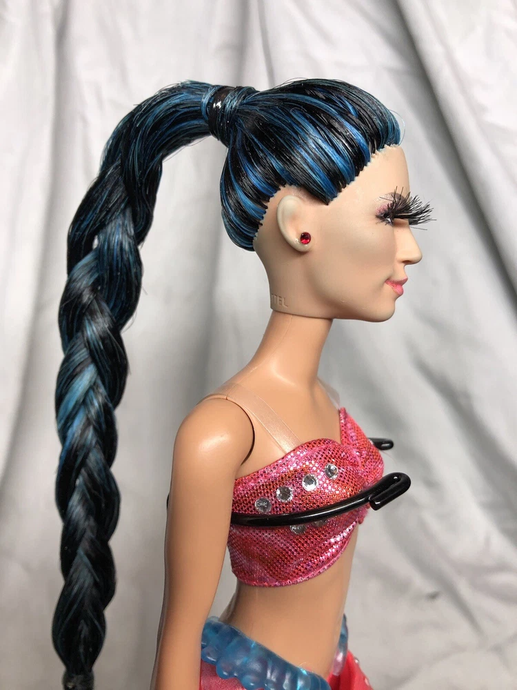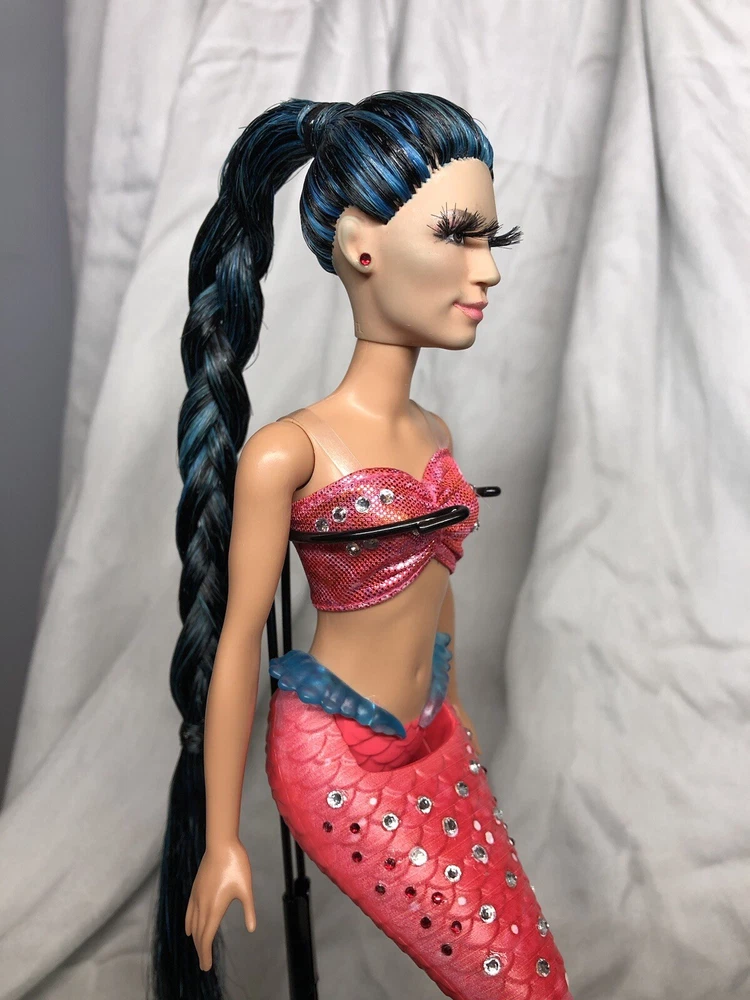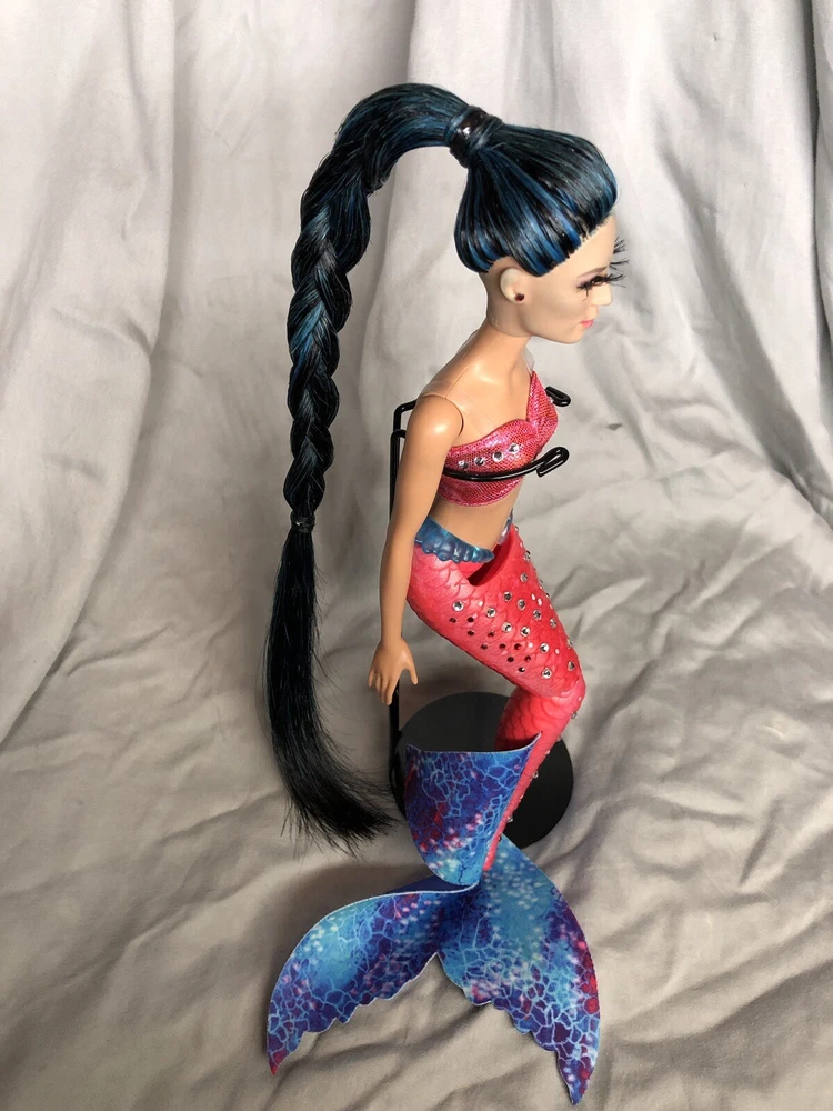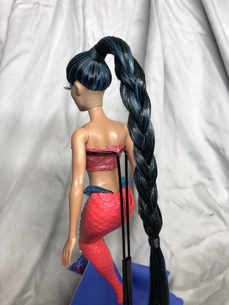 Perla OOAK Doll, from the beloved Disney movie, The Little Mermaid - Live Action. This limited edition doll is a must-have for any Disney fan or collector. The doll is rerooted with human hair, black & custom dyed blue. She has rooted lashes. I added rhinestones to her tail. She also has rhinestones for earring studs. I will include a couple spare rhinestones. STAND INCLUDED. *The hair line on the forehead is ripped but it is fully secure with glue*