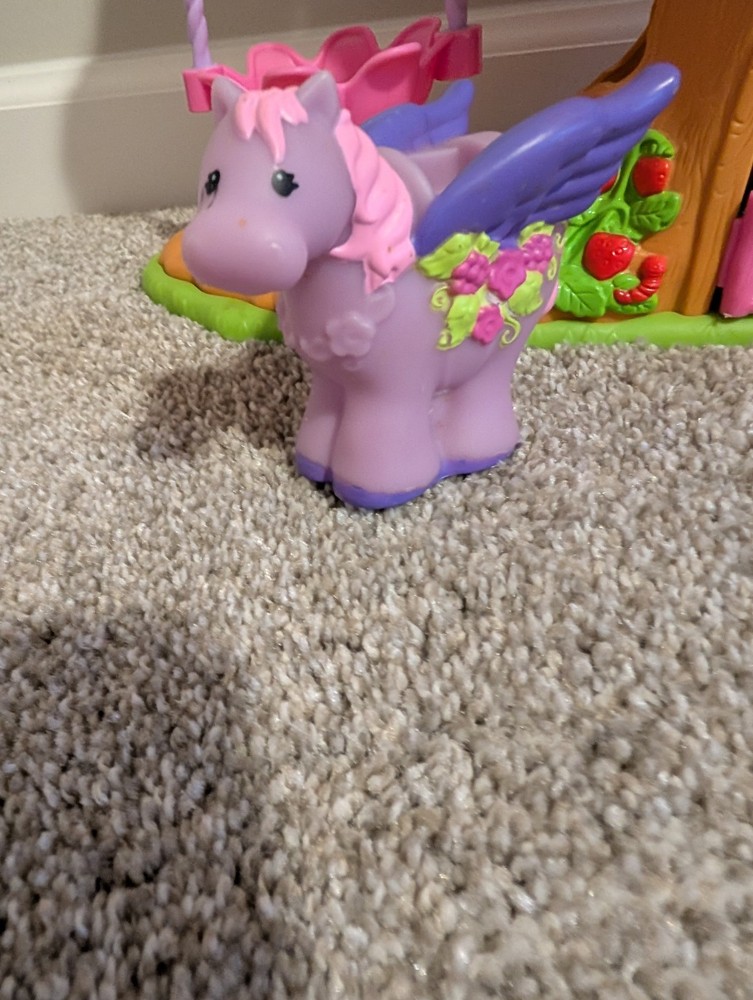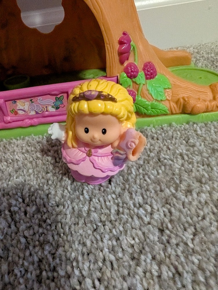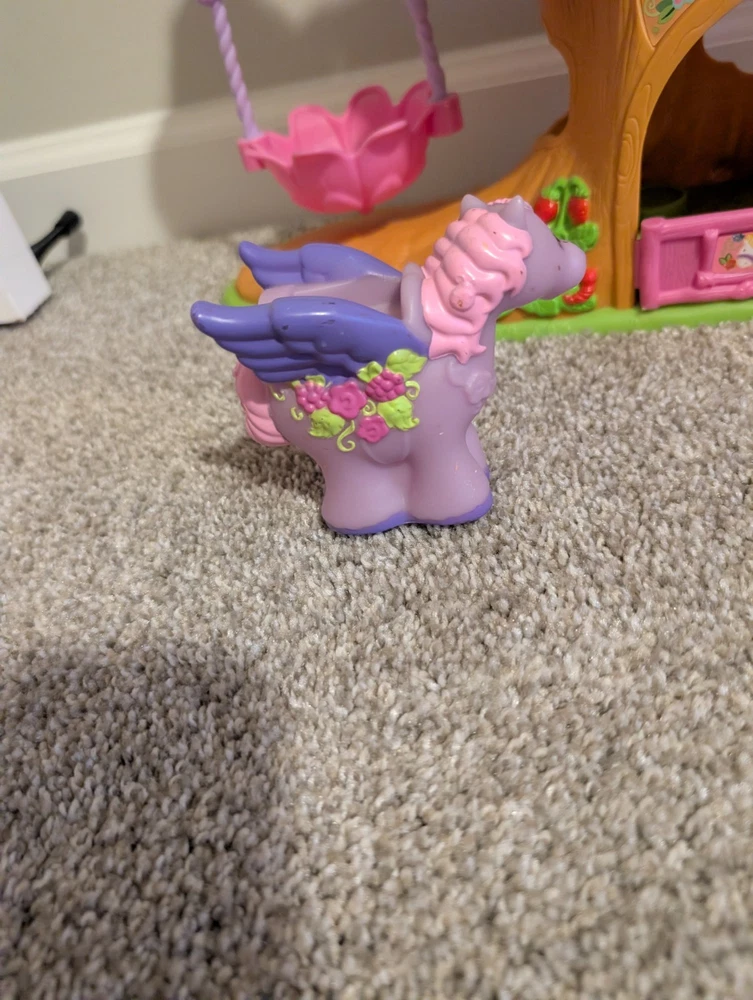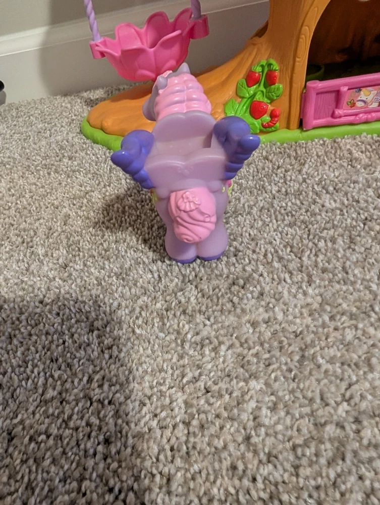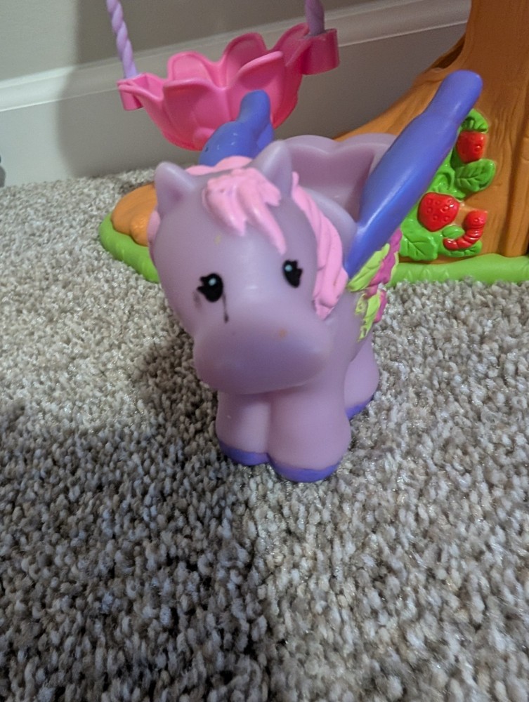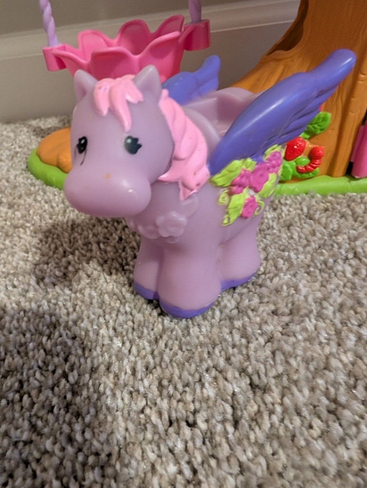 The Little People Fairy Treehouse is a preschool toy from the Fisher-Price brand, released in 2009. Designed for children aged 3-4 years, this toy allows kids to engage in imaginative play by creating their own fairy tales in a whimsical treehouse setting. With its charming design and interactive features, it provides hours of entertainment and creative play for young children. The fairy with the wand has damage shown and the pegueas has a mark by the eye.
