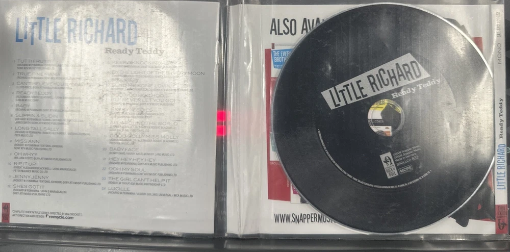 Little Richard ‘Ready Teddy’ CD came from my father’s private music collection. The CD is pretty much flawless, no scratching maybe a spot mark or two. The inlay has no handling damage. Overall it’s excellent condition and a fine buy at $5.