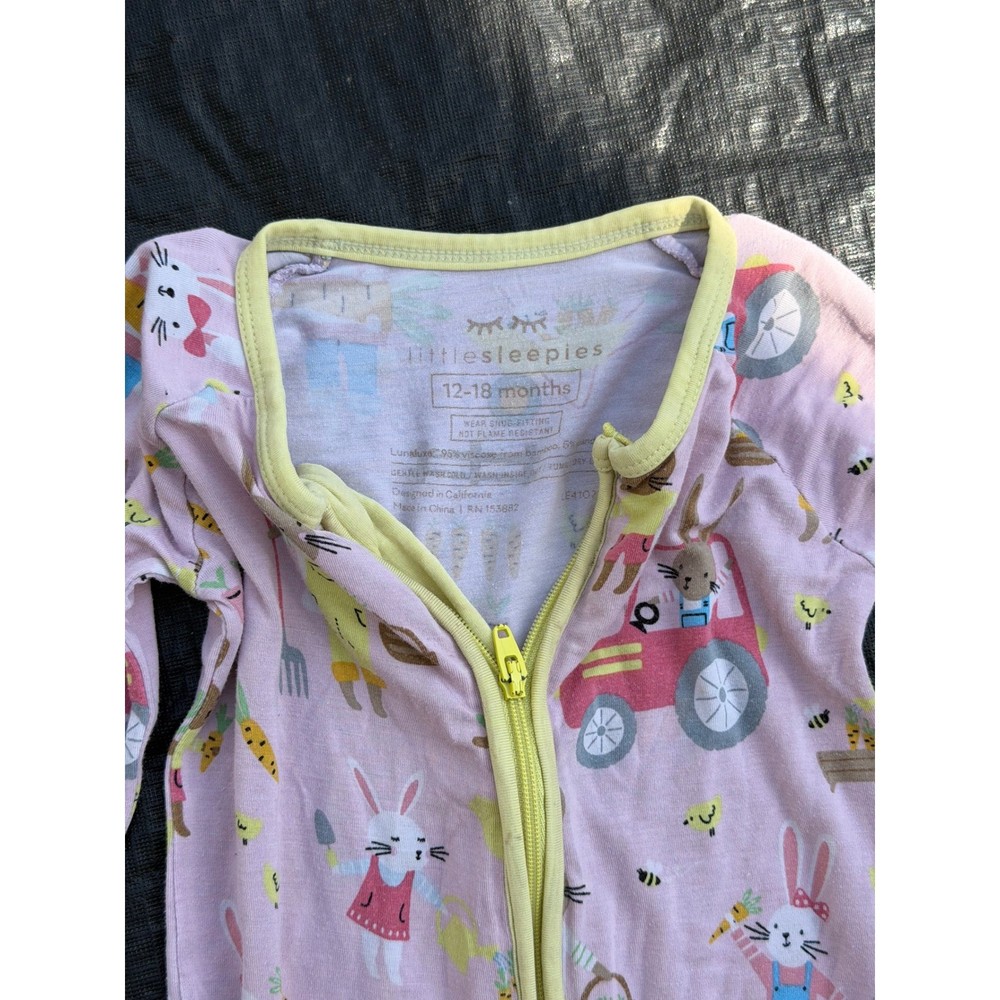 Little Sleepies Zippy pajamas in the adorable Bunny Garden print feature a soft pink base with whimsical rabbits, tractors, and garden motifs. Crafted from signature Lunaluxe bamboo viscose, this one-piece romper offers a snug fit with a convenient two-way double zipper for easy changes. The design includes fold-over cuffs on both the sleeves and feet, allowing for a versatile transition from footless to footed sleepers. Contrast yellow trim adds a bright pop to the neckline and cuffs, ensuring your little one stays comfortable and stylish through the night. Please reference all photos for condition/flaws.