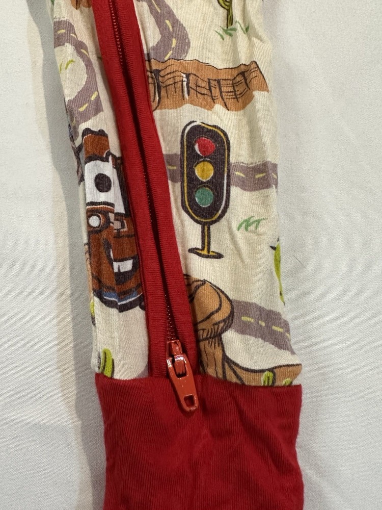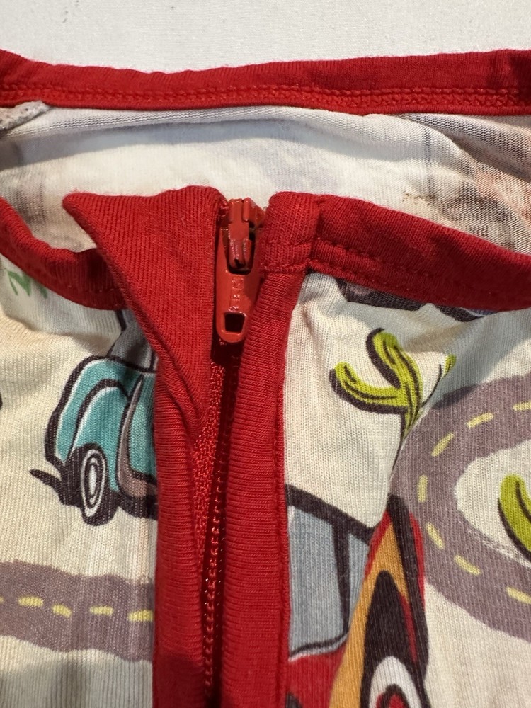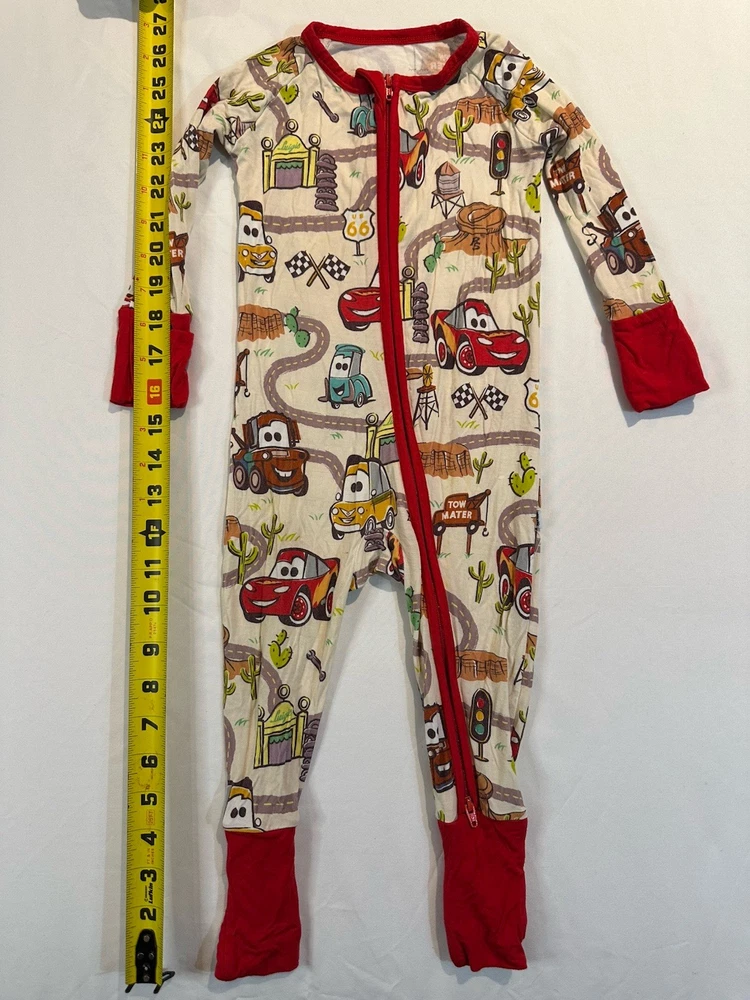 Rev up for bedtime with this limited edition Little Sleepies "Radiator Springs" Zippy! This ultra-soft one-piece features a vibrant, all-over print of your favorite Cars characters like Lightning McQueen and Tow Mater zooming through Route 66. Buttery Soft: Made from signature Lunaluxe™ bamboo fabric that is breathable, moisture-wicking, and perfect for sensitive skin. Designed for Growth: Fits longer than average pajamas due to the stretchy fabric and fold-over foot cuffs that transition from footie to romper. Easy Changes: The convenient two-way zipper makes diaper changes a breeze. The pjs have been worn but still remain in a good quality condition. No visible stains. See all pictures for details and measurements.