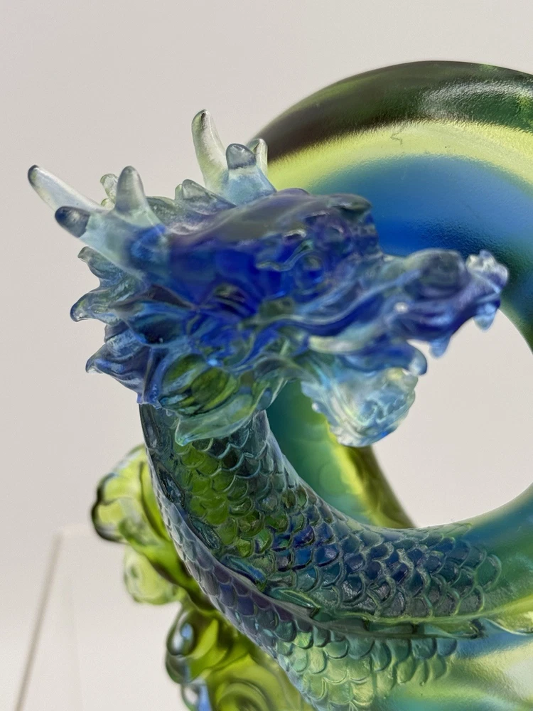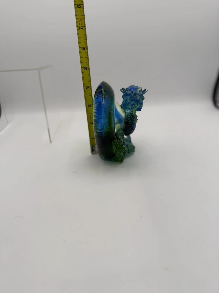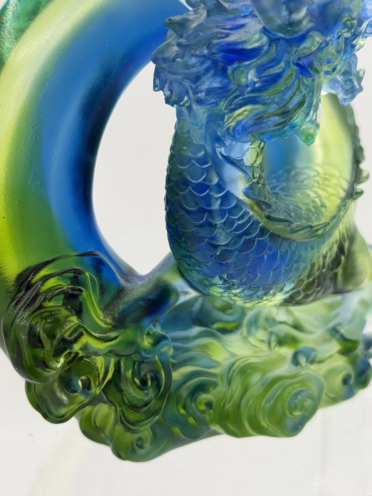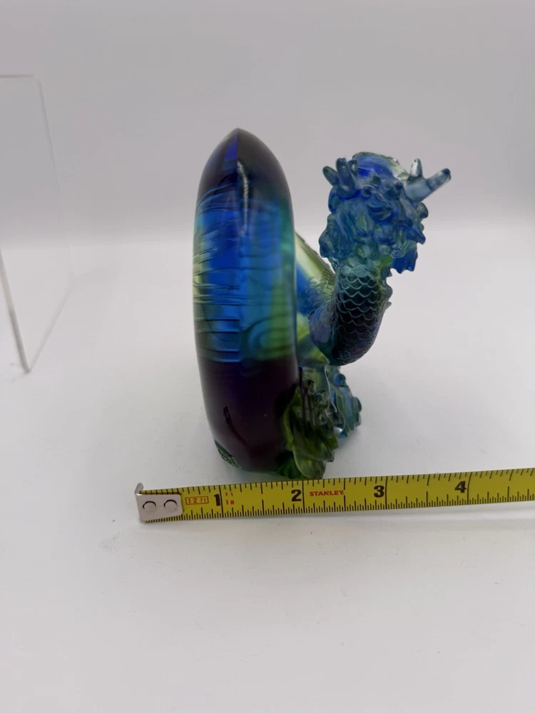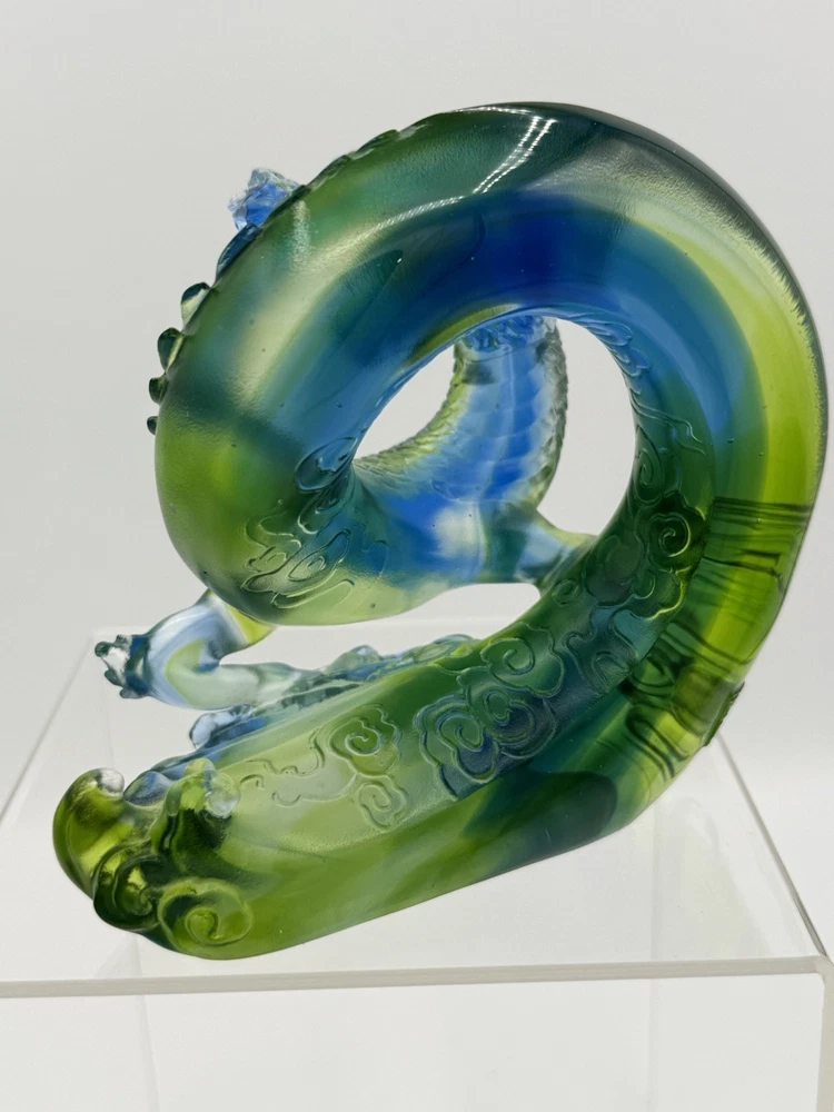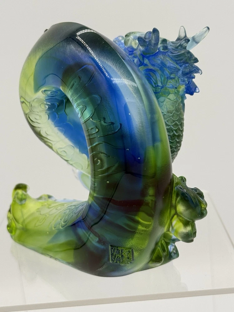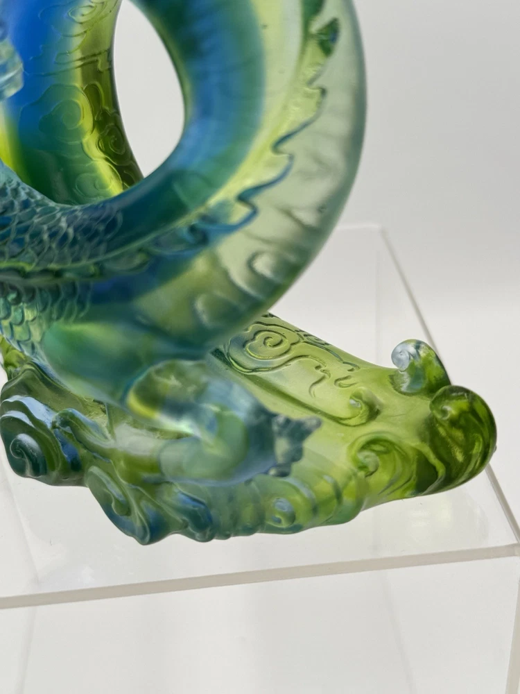 The Liuli Crystal Glass Dragon Serpent Sea Smoke Feng Shui piece is a stunning and intricate home décor item originating from China. Made from Liuli Crystal Glass, this multicolor piece features a majestic dragon character, embodying the powerful and mythical creature in traditional Chinese culture. The dragon design is intricately crafted, making it a unique and eye-catching addition to any home décor setting. The use of glass and crystal materials adds a touch of elegance and sophistication, making this piece a standout piece for feng shui enthusiasts or collectors of unique home décor items. See photos for measurements.