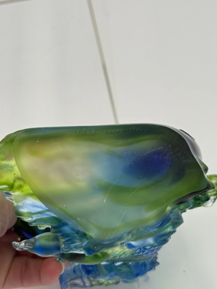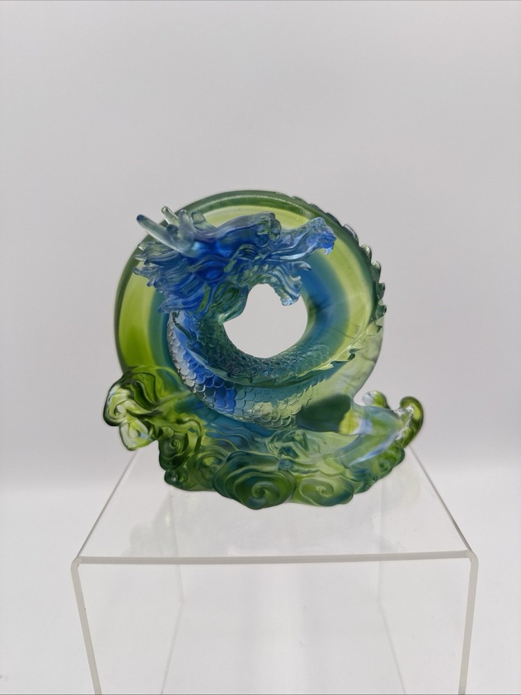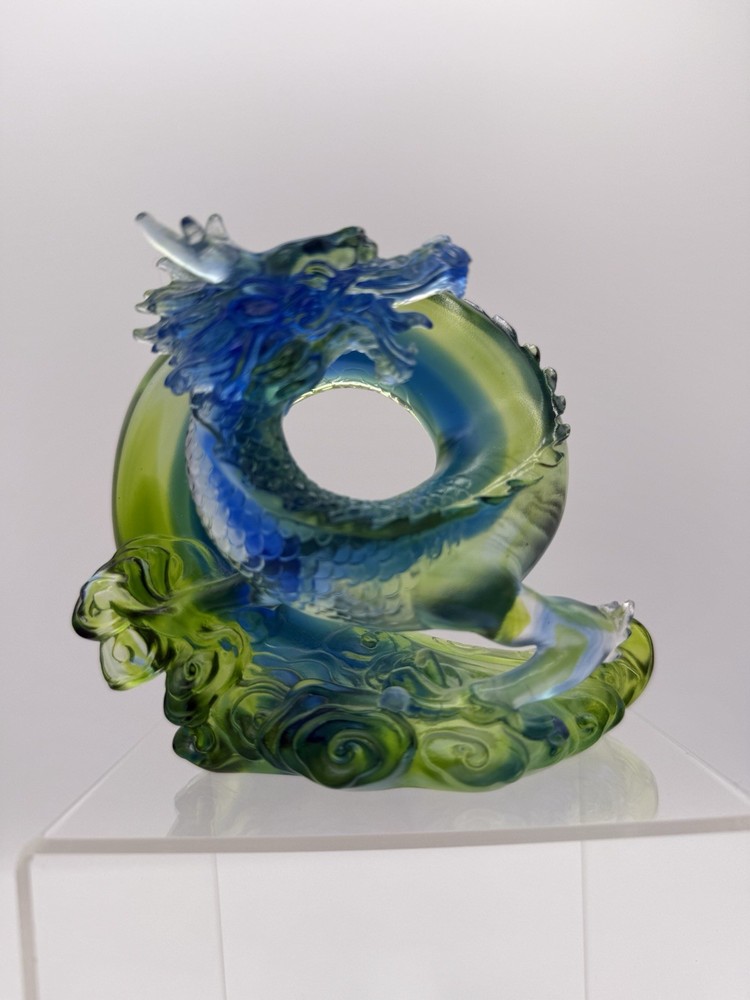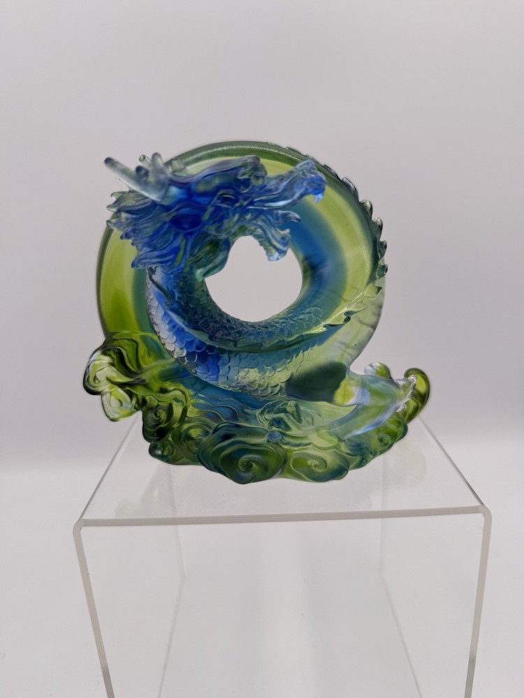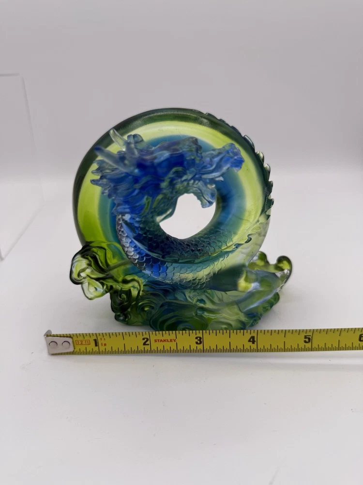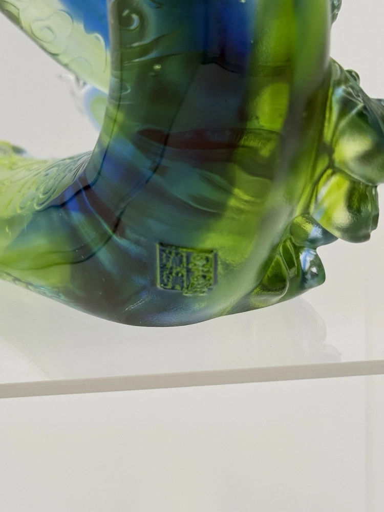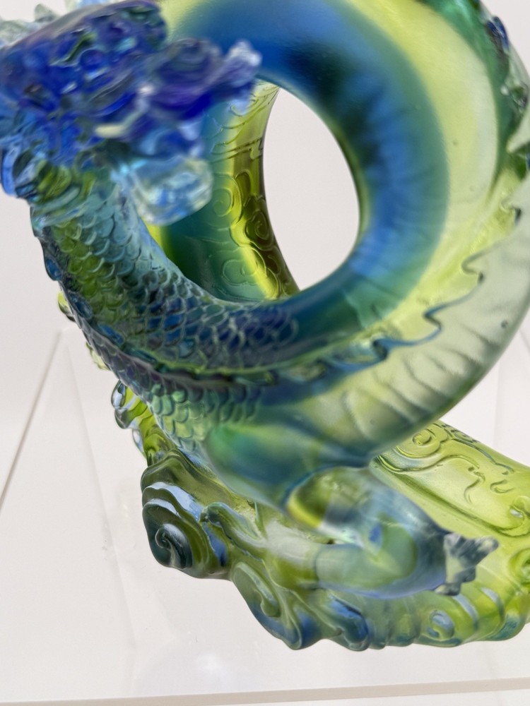 The Liuli Crystal Glass Dragon Serpent Sea Smoke Feng Shui piece is a stunning and intricate home décor item originating from China. Made from Liuli Crystal Glass, this multicolor piece features a majestic dragon character, embodying the powerful and mythical creature in traditional Chinese culture. The dragon design is intricately crafted, making it a unique and eye-catching addition to any home décor setting. The use of glass and crystal materials adds a touch of elegance and sophistication, making this piece a standout piece for feng shui enthusiasts or collectors of unique home décor items. See photos for measurements.