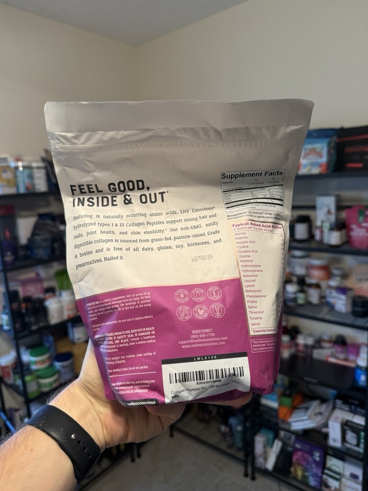 Live Conscious Collagen Peptides is a 16 oz powder product formulated to support hair, skin, nail, and joint health. With active ingredients including Collagen Type III and Type I, this all-in-one product is designed to promote overall wellness and vitality. Packed with essential amino acids like Alanine, Arginine, and Aspartic Acid, it is gluten-free, unsweetened, and hormone-free, making it a versatile and safe option for those seeking natural support for their beauty and mobility.