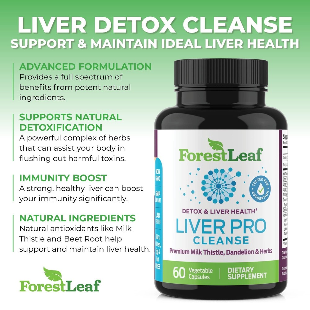Liver Cleanse Detox & Repair - Fatty Liver Repair Detox Complex Supplement w/Choline, Zinc, Milk Thistle, Dandelion Root, Turmeric, Burdock, Artichoke - Liver Support Supplement | 60 Caps Product Details Brand: ForestLeaf Item Form: Capsule Manufacturer: ForestLeaf Item Package Quantity: 1 Package Information: Bottle Package Dimensions : 4.29 x 2.09 x 2.09 inches; 2.89 ounces Date First Available : April 8, 2022 Manufacturer : ForestLeaf Best Sellers Rank: #66,403 in Health & Household (See Top 100 in Health & Household) #200 in Milk Thistle Herbal Supplements #200 in Milk Thistle Herbal Supplements Customer Reviews: 4.2 4.2 out of 5 stars 397 ratings Liver Pro Cleanse - Liver cleanse supports liver health and vitality and promotes a strong functioning liver. Formulated with antioxidant herbs that may clear and protect liver cells from damage* Fatty Liver Repair - Benefit from liver cleansing & repair fatty liver with a concentrated formula full of organic ingredients and natural botanicals. Supports to stimulate the growth of new liver cells* Milk Thistle & Herbs - This liver supplement contains 80% Silymarin Milk Thistle Seed Extract, Organic Turmeric Root, Organic Burdock Root, Organic Beet Root Juice Powder, Artichoke Extract, Dandelion, Chanca Piedra, and more* Immune Support - Our liver support supplement offers reliable and safe immune support as well as kidney support through natural, plant-based ingredients and a commitment to the highest quality standards* Manufactured Safely - ForestLeaf fatty liver supplements are made with vegetable capsules and are dairy, gluten, egg, and nut free. All of our products and pills are tested for maximum absorption*