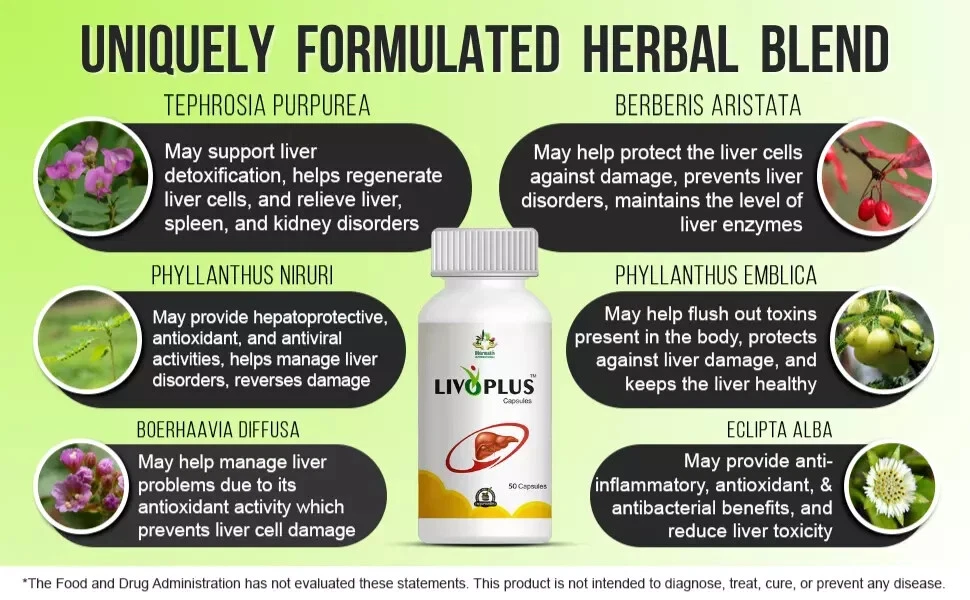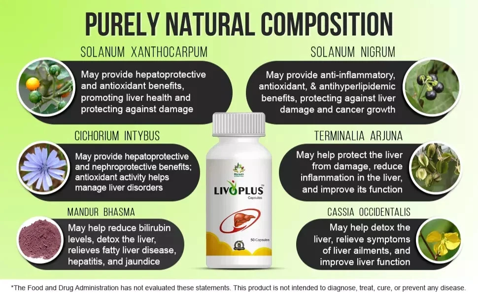 Livoplus capsule with its powerful liver toning herbs ensure optimum liver function through the protection of the hepatic parenchyma, and by way of its potent antioxidant properties, it acts as a powerful detoxification agent. Livoplus capsule neutralizes all kinds of toxins from the food, water, air and medications, all sources of detrimental effects on the liver. Counteracting those hard-to-avoid toxins and therefore protecting one of the body's most important organs, Livoplus capsule has massive health benefits for everyone. Its balanced combination prevents liver diseases and helps maintain good health. Livoplus capsule is one of the most effective liver support formulas. Alcohol users in particular found Livoplus capsule helpful in maintaining a healthier liver. Livoplus capsule facilitates rapid elimination of acetaldehyde, the toxic intermediate metabolite of alcohol metabolism, and ensures protection from alcohol-induced hepatic damage. It diminishes the lipotropic activity in chronic alcoholism, and prevents fatty infiltration of the liver. In pre-cirrhotic conditions, Livoplus capsule arrests the progress of the disease and prevents further liver damage. Livoplus capsule is all-natural, complex multi-ingredient formula. It is safe and effective in protecting the liver against harmful toxins from drugs, alcohol, food and water. Livoplus capsule helps regulate levels of enzymes and optimizes assimilation. Livoplus capsule has also been found to be associated with an increase in serum albumin, which is another indication of the liver protection it provides. It also has cholesterol-regulating action and helps maintain healthy levels of serum cholesterol, lipoproteins, phospholipids and triglycerides. Livoplus capsule is the ONLY natural and safe solution to cleanse and detoxify the liver! You can expect the following from Livoplus capsules: Improves the functional efficiency of the liver Increases bile secretion and support a healthy liver Neutralizes toxins from food, water, air and medications 100% herbal, affordable and effective No chemicals, no negative side effects Livoplus capsule is all-in-one powerful herbal liver support supplement. It is formulated from the time tested ayurvedic herbs that help strengthen the liver. It is helpful in preventing and protecting the liver from alcoholic liver disease, enlargement of liver, cirrhosis of liver and hyperacidity, hepatitis and jaundice, viral hepatitis, pre-cirrhotic conditions and early cirrhosis, protein energy malnutrition, anemia and dyspepsia and loss of appetite or anorexia. Ingredients Livoplus capsule is a natural formulation of the finest herbs that work highly effectively against alcoholic liver disease, enlargement of liver, cirrhosis of liver, hepatitis and jaundice, viral hepatitis, pre-cirrhotic conditions and early cirrhosis, protein energy malnutrition and loss of appetite. The natural ingredients that are used in this supplement are the highest quality and purest form to provide an ideal all-around solution for optimum liver functioning. Each pack of Livoplus capsule contains 50 capsules. Livoplus capsules consist of the following potent ingredients: Kantkari (Solanumxanthocarpu), Amrta (Tinispora Cordifolia), Makoy (Solanum Nigrum), Kasni (Cichorium Intybus), Palihari (Tephrosia Purpur), Arjun (Terminalia Arjuna), Mandur Bhasam, Kasmard (Cassia Occidentalis), Santhi (Boerhaavia Diffusa), Bhangra (Eclipta Alba), Bhui Aamla (Phyllanthus Niruri), Aamla (Phyllanthus Emblica), Daru Hald (Berberis Aristata), Chitrak (Plumbago Zeylanica), Vaivading (Emblica Ribes), Haritki (Terminalia Chebula) Frequently Asked Questions What is Livoplus capsule? Livoplus capsule is a unique combination of valuable herbs such as boerhaavia diffusa, tinospora cordifolia, etc. Livoplus capsule is an effective herbal remedy for liver diseases and disorders such as alcoholic liver disease, hepatitis and jaundice, enlargement of liver, cirrhosis of liver, viral hepatitis, pre-cirrhotic conditions and early cirrhosis, protein energy malnutrition and loss of appetite. Can I use Livoplus capsule? If you are looking for a natural and safe solution to prevent liver diseases and to maintain healthy liver functioning, then this product is for you. Livoplus capsules help in the prevention: 1. Viral hepatitis 2. Alcoholic liver disease 3. Pre-cirrhotic conditions and early cirrhosis 4. Protein energy malnutrition 5. Loss of appetite 6. Radiation and chemotherapy-induced liver damage In addition to taking Livoplus capsules, eliminate alcohol and smoking completely. Include fresh fruits, juices and vegetables in your diet and drink plenty of water. Is Livoplus capsule safe? Livoplus capsule has been prepared with the foremost care and detail. The herbs that went into the preparation of this product are the safest and most renowned. We follow stringent International standards in safety and hygiene in the preparation of our products. What is the dosage? Take 1 or 2 capsules twice daily with water after meals. Always follow a regular course of Livoplus capsule for 2 to 3 months to achieve optimum results. Will there be any problem if I miss a dose? If you have missed a dose, then take it as soon as you remember. Follow the course in a disciplined manner to achieve strong and permanent results. How long will it take before I begin to notice results? Typically most people will see results in 3 to 6 weeks. It is suggested that you start with a two months supply to achieve maximum benefit from this herbal product. Each pack of Livoplus capsule contains 50 capsules. 4 packs of it will last for two months. If you have missed a dose, then take it as soon as you remember. Follow the course in a disciplined manner to achieve best results. Will my privacy be respected? Your privacy is of prime concern and will be given maximum priority. Your order will be shipped to you in Discreet Plain Packet and follows International regulations that are the norm in the shippin