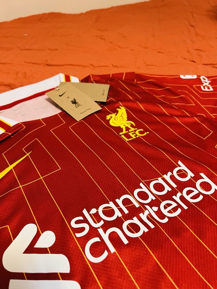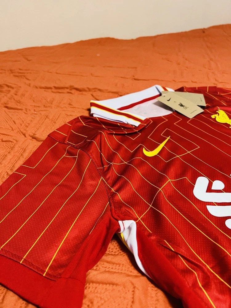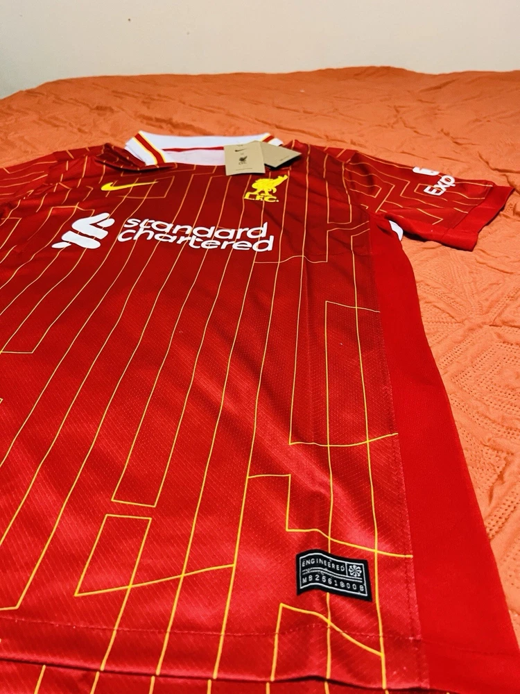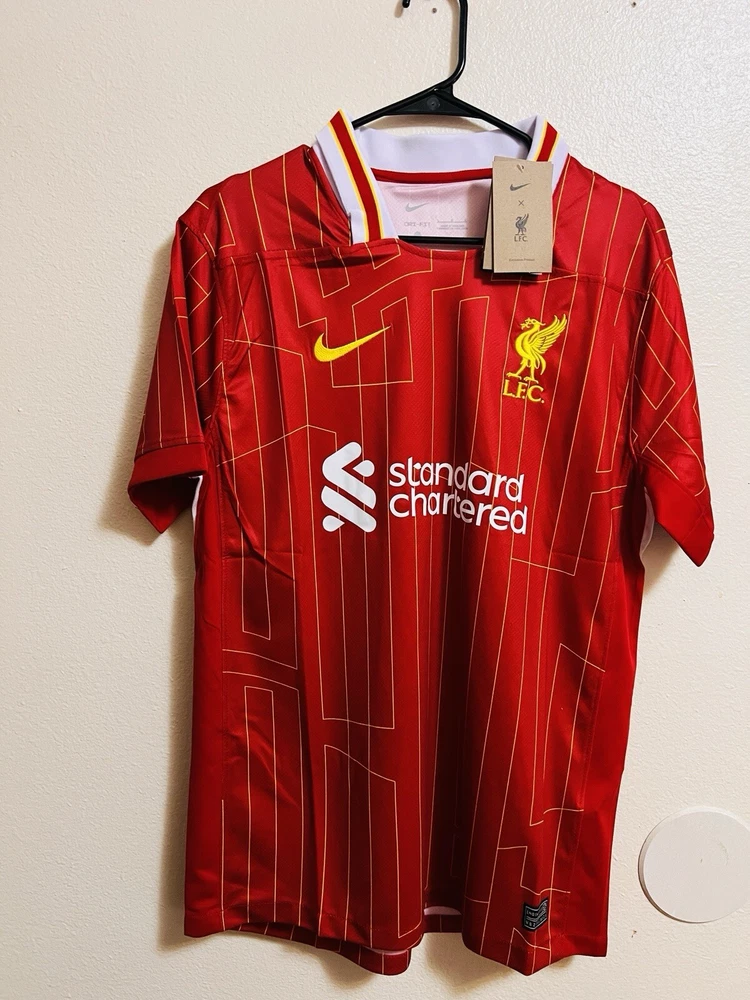 Show your support for Liverpool with this men's large red jersey for the 2024-25 season. Made by Nike, this jersey is perfect for soccer fans who want to represent their favorite team. The jersey features the iconic Liverpool team logo and is designed in the team's signature red color. Whether you're watching the game from the stands or playing a match on the field, this jersey is sure to make a statement. With its comfortable fit and durable design, you'll be able to wear it for any occasion. So why wait? Order your Liverpool jersey today and show your love for the team!