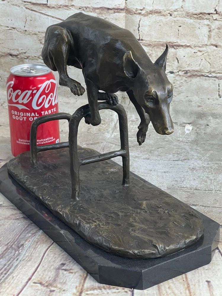 Living Bronze Doberman Pinscher Dog cast bronze statue on marble base 1994 Art Living Bronze Doberman Pinscher Dog cast bronze statue on marble base 1994 Art Condition : This sculpture is in perfect condition. Bronze Dimensions with Marble Base: Height 9" X Length 12" Marble Dimensions: 12"X 6" Height without base: 8.5" Weight: 12 LBS Inventory: 9440K13049 This high-energy dog leaps over hurdles with remarkable skill and vivacity, showcasing its talent and adventurous spirit. Crafted in bronze patina, this sculpture captures the essence of a jumping dog with exquisite details that bring out the dog's elegance and charm. The piece, signed by the artist Milo, depicts the dog gazing intently ahead, capturing a moment of pure athleticism and grace. The statuesque pose of this magnificent creature exudes aristocratic charm and grace. The intricate details of the sculpture, from the texture of the dog's fur to the muscular definition of its body, showcase the artist's dedication to capturing the true spirit of these animals. The warm brown patina finish adds depth and character to the artwork, making it a captivating addition to any space. Whether you're a dog lover, an art enthusiast, or simply appreciate the beauty of nature's creatures, this jumping dog bronze sculpture is a stunning representation of agility and elegance. Display it in your home, office, or gallery to celebrate the athleticism and grace of man's best friend. Shipping Terms : Most of our items are shipped via USPS (United States Postal Service) mail or UPS. Most orders are shipped within 24-48 hours of purchase. Please be aware that not all items are available for USPS shipping due to size and weight. We do ship to Hawaii, Alaska, Canada, Puerto Rico, APO/AE, and U.S. Virgin Islands, however, an additional charge may be required. Please contact us before making any purchases in these areas. For Non-USA customers, you may be responsible for all duty, tax, brokerage fees that may be due upon delivery (shipping costs cover freight charges only). We also ship internationally. Please refer to the "Shipping and Handling" chart for the rates for each area. Payment : We accept just about any form of payment. PayPal, Master Card, Visa or American Express credit cards. Money orders, cashiers checks, and even personal or business checks. For governmental institutions, we will also accept a purchase order. Please understand that for personal or business checks we have to wait for the check to clear (usually 7 days) before shipping. Condition : New Detailed Hand Crafted Hot Cast Bronze Satisfaction Guaranteed. This is Stock Photo, Slight Color Variation!! Listing and template services provided by inkFrog