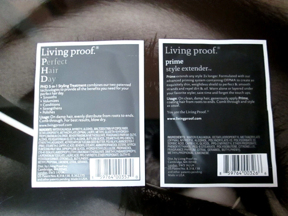 TWO PIECE SAMPLE LOT LIVING PROOF PRODUCTS! HERE IS WHAT YOU GET... ~ PRIME STYLE EXTENDER (LOCKS IN YOUR STYLE LONGER) WEIGHTLESS PERFECTING, WEATHER PROOFING, TIME SAVING HAIR PRIMER! 10mL 0.33 FL OZ SAMPLE PACKET ~ PERFECT HAIR DAY (5 IN 1 STYLING TREATMENT) STYLING CREAM 10mL 0.33 FL OZ SAMPLE PACKET IT'S A GREAT WAY TO TRY TWO PRODUCTS FROM THIS LINE WITHOUT BUYING THE FULL SIZE PACKAGE!