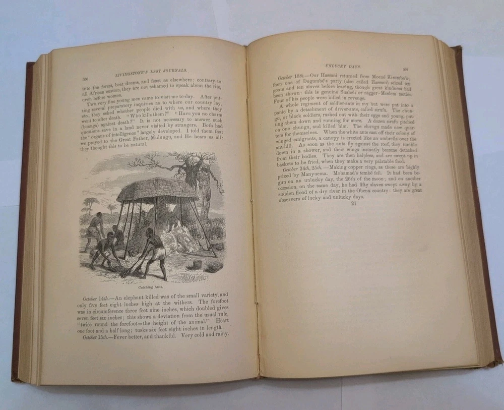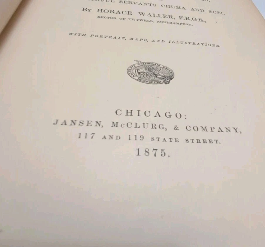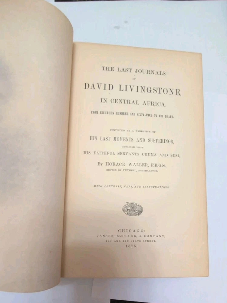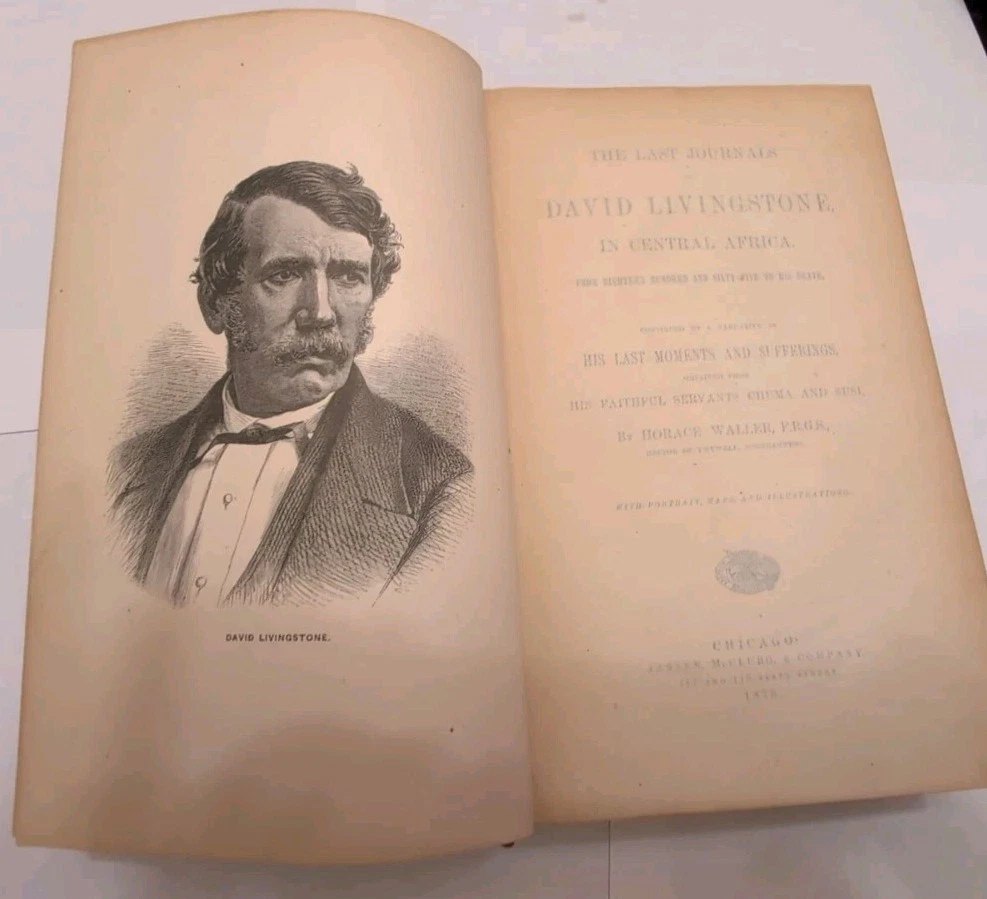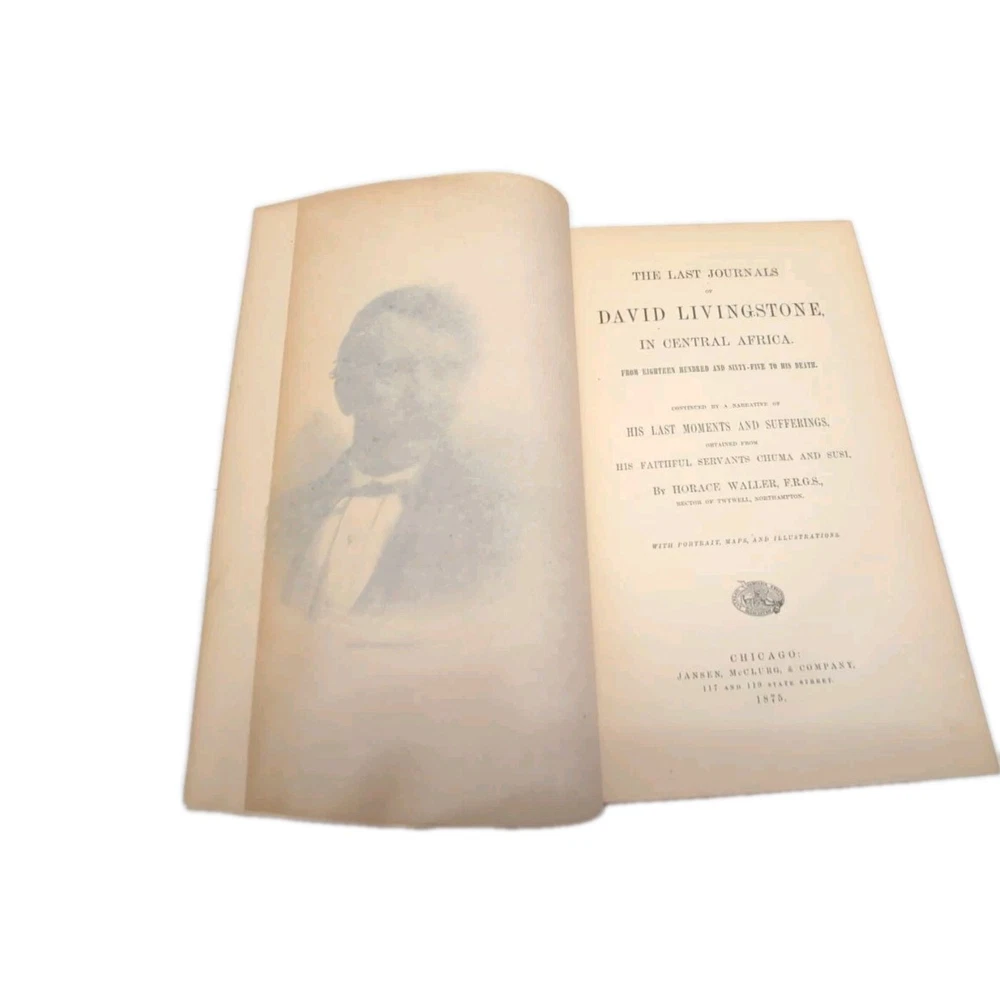 Livingstone's Last Journals In Central Africa by Horace Waller, published in 1875 by Jansen, McClurg & Company in Chicago, Illinois, is a valuable historical account of central Africa. This hardcover book includes a map and illustrations, making it a visually engaging read. Written in English, this original edition provides insight into the adventures of David Livingstone in the region, offering a unique perspective on central Africa during that time period. Perfect for collectors or those interested in African history, this book is a rare gem from the United States. Pictures still have tissue paper covering. Map has a small tear and open area where the creases meet. It is in nice condition with wear to the edges of the cover and spine. And the back lower corner of the cover is quite worn. Please look over photos. No foxing or tears are noted on the pages. All pages are very secure. Has writing on a blank page with the owners name and the date. Pages slightly yellowed with age but it is 150 years old. I believe this is the first American printed edition. Questions, please ask .