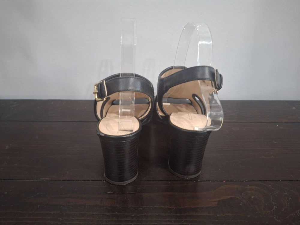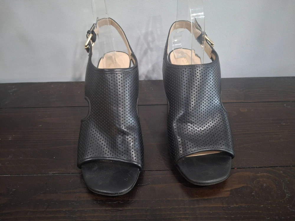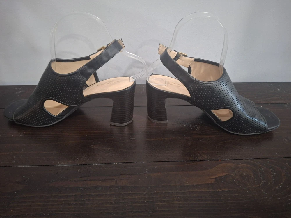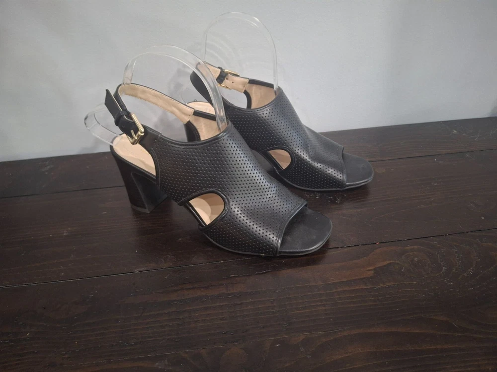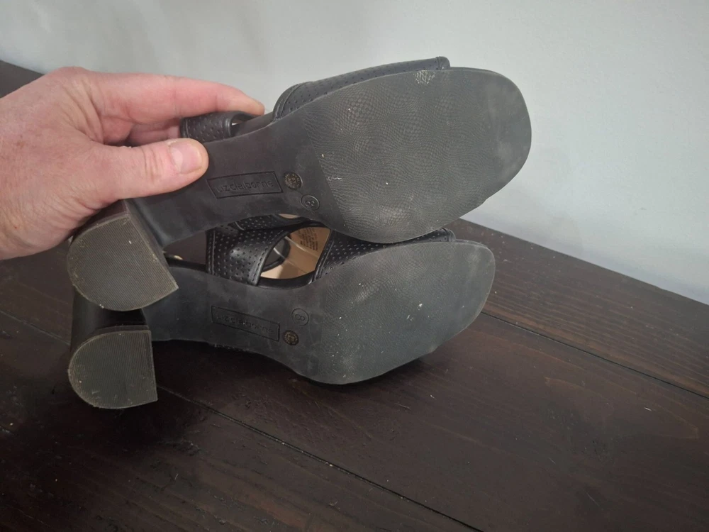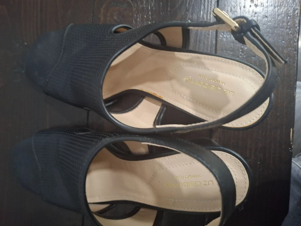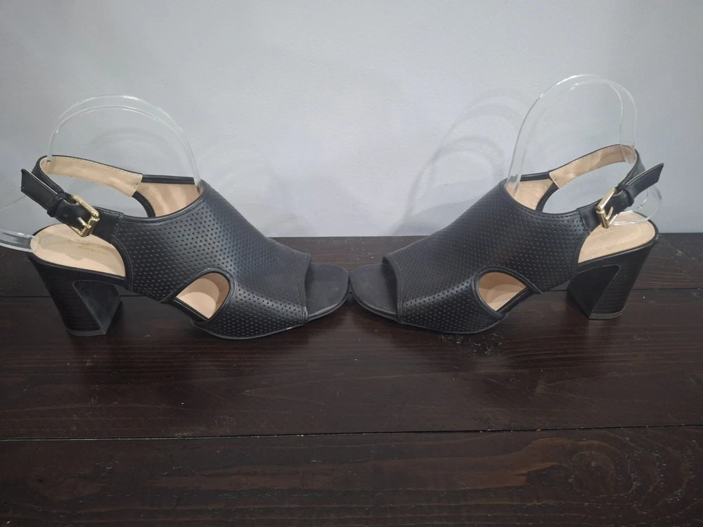 Pre-owned in excellent used condition. size 8M Product Details These Liz Claiborne women's Goldwin heeled sandals are all class. Made from smooth faux leather with a unique perforated finish, this open-toe style has a 2.75-inch stacked heel, an adjustable ankle strap closure, and a memory foam insole for your comfort. Wear them with a sleek dress or tailored pants and a short-sleeve shirt. Features: Memory Foam Closure Type: Buckle Footwear Technology: Memory Foam Insole Shoe Heel Height: 2 3/4 Inches Upper/Outer Base Material: 100% Textile Shoe Lining Material: Polyurethane Sole Material Content: 100% Thermoplastic-Rubber Toe Type: Open Toe Shoe Strap Type: Adjustable Strap Heel Style: Block Heel