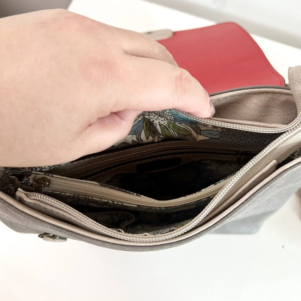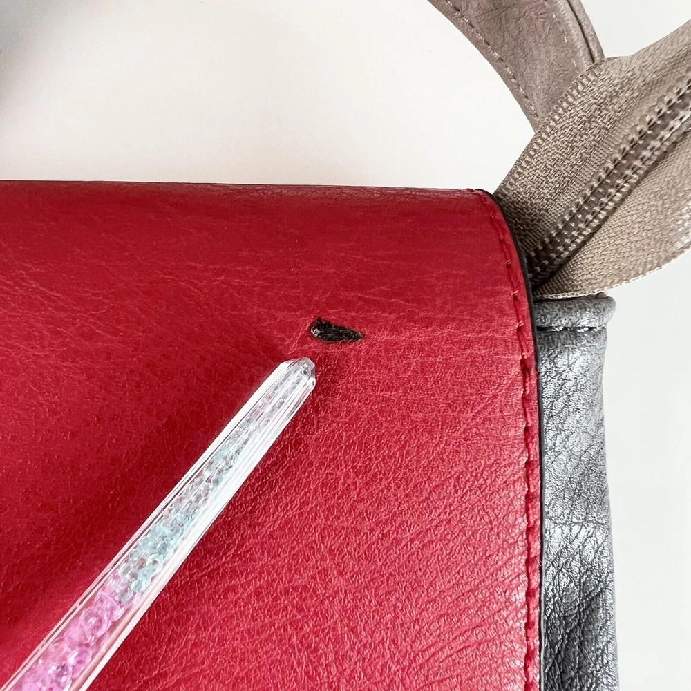 Liz Soto Amy Cross Body Handbag Vegan Leather Color Block Gray Red Zip -Brand new with *defect!*****small tear ***Please view all images & description** * PVC vegan leather, poly lining * • Exterior back zipper pocket, under flap zipper pocket, interior zipper divider with 2 pouch pockets and 1 zip pocket * • Adjustable strap, 28–49"L * • 9"H x 10"W at bottom x 2"D * • Zip closure with magnetic closure on the flap -Fr:pet-free & smoke-free home -Happy to answer your question. +Fast shipper.Most ship Next day. ———More info———- -The Amy is an adjustable cross body bag to fit all sizes. It has a secure zipper pocket under the flap plus one on the rear. There is a zipper top with a divider inside plus more pockets and another secure zipper pocket. The Amy comes with vegan leather color-blocked styling. This is the perfect go anywhere handbag with plenty of colors and contemporary styling. —————————— Tags : DIY Project Gift Summer Spring Fall Winter work everyday use must have multifunction grey office workwear vacation trip/ mue neung hoksippad