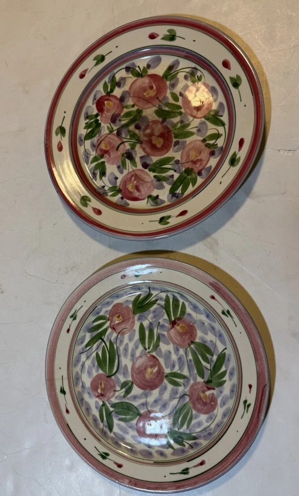 Add a touch of vintage charm to your dinner table with these beautiful Liz Vigoda fruit dinner plates. The set includes two plates, one 11-inch and one 10 3/4-inch, both featuring a vibrant fruit pattern with a contemporary style. These plates are handmade with glossy finish and made of high-quality clay material. They are perfect for all occasions and will make a great addition to your collection. Care instructions are included and recommend hand wash only. These plates are an original production with a painted backstamp. The set is a great example of art pottery from the late 20th century (1990-1999). They are in excellent condition and will be a great gift for your loved ones.