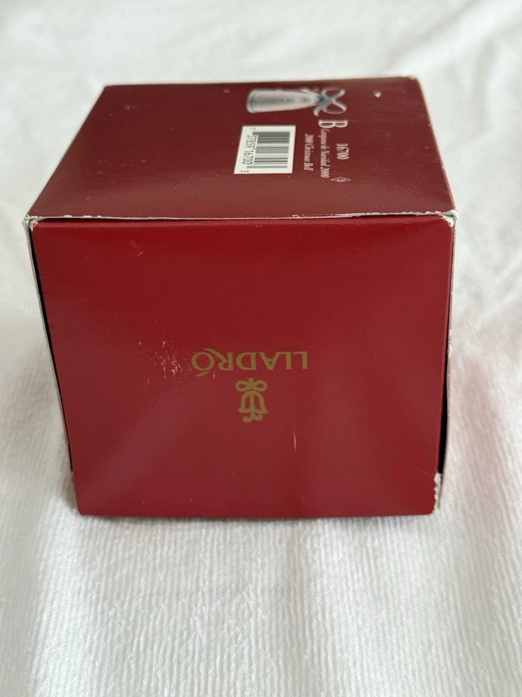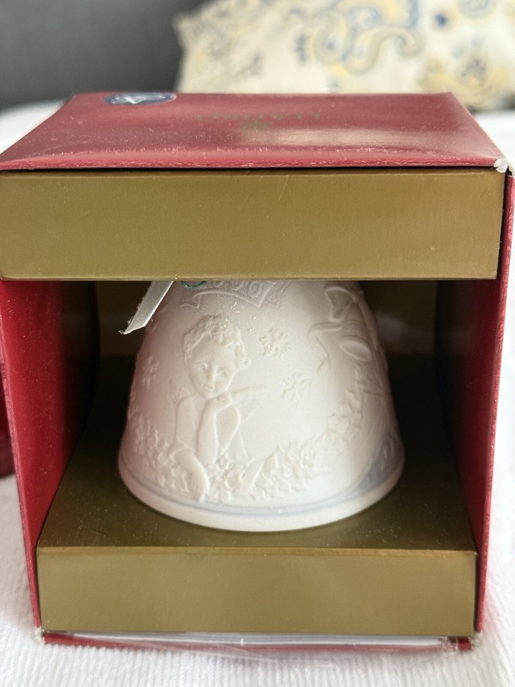 This Lladró Christmas Bell from 2000 is a small porcelain ornament with a bell shape. It features an angel design in white color and comes with its original box. The item is designed for adults and has a hanging feature. It is approximately 4 inches in length and weighs 6 oz. Perfect for Christmas decoration or as a collectible item.
