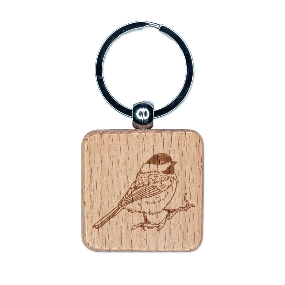 Llavero cuadrado de madera grabado en rama pájaro con tapa negra etiqueta dije
