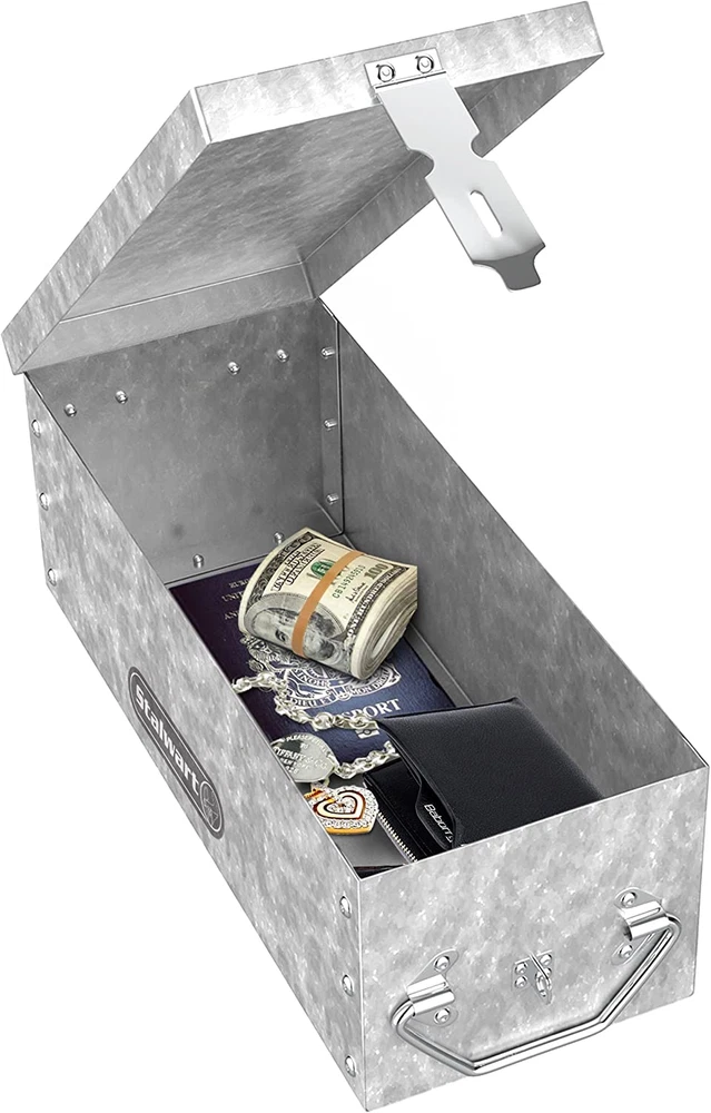 Store New Arrivals Add to Favorite View Feedback Contact Lock Box with Folding Handle - Durable Metal Storage Chest with Stackable Design to Secure Valuables, Cash, Jewelry, and Weapons by Stalwart (Silver) Description Item model number 75-005 Style Lock Box Capacity 228 Cubic Inches Pattern Solid Country of Origin China Batteries Included? No Chamber Width 12 Inches Batteries Required? No Brand Stalwart Material Metal Is Discontinued By Manufacturer No Manufacturer TRAUV Item Package Quantity 1 Water Resistance Level Waterproof Item Weight 16 ounces Size 1 Count (Pack of 1) Special Features Durability,Durable,Sturdy Special Feature Durability,Durable,Sturdy Part Number 4758599 Mounting Type Freestanding Color Silver Global Trade Identification Number 00886511807129 Shape Rectangular Chamber Depth 12 Inches Included Components Lock Box Product Dimensions 12"D x 4.75"W x 4"H Number Of Pieces 1 SECURE STORAGE- Safely secure cash, jewelry, heirlooms, passports and other valuables in this metal locking box. Keep guns, knives or medication safely locked away from children. This safe is also stackable for easy discrete storage at home or office. STURDY BUILD- This Stalwart safeguard lock box is constructed from sturdy metal material to further protect your valuables and for long lasting durability. PORTABLE- A fold down handle secured to the top of the lock-box allows for great peace of mind when traveling with valuables such as passports, cash, or even guns and ammunition. COMPACT DESIGN- Despite this box’s longest side being a foot long, it boasts a spacious 228 inch interior volume. The compact size of the lockable box makes it a great office or desk safe or even a good option to protect valuables in your car. PRODUCT DETAILS- Dimensions: 12 inch (L) x 4 inch (H) x 4.75 inch (W). Sturdy metal construction. Lock hasp attached (lock not included). The Stalwart Metal Storage Lock Box is designed to keep your valuables safe. The lockbox allows you to keep loose cash, jewelry, heirlooms, or any other valuables you may have secured within this sturdy metal lock-box. The lockbox can be used to protect your children by storing prescription medicine, small guns, knives, and ammunition inside this box and attaching a lock (not included) to the lock hasp. Made with durable meal for long lasting use, and with a spacious 228 cubic inch interior, this stackable storage lock box is an ideal option for your home, office, or car. IMPORTANT: Avoid buying counterfeit products and transacting with unauthorized sellers. Look for our logo on the packaging for every one of our products. Stalwart is a registered trademark protected by U.S. Trademark law and will be vigorously defended. ABOUT US We offer the best prices around on high quality products. Our E-store includes media such as books, movies, music and games while offering electronics, toys, sporting apparel, clothing, tools, general home, garden items and more. SHIPPING We are always working hard to ensure your package arrives as soon as possible. Please understand that some factors like weather, high postal traffic, and the performance of shipping companies are outside of our control. We offer free shipping to the lower 48 states and ship within 2 business days of payment, usually sooner. We do not accept P.O. Boxes. Please provide a physical address. RETURNS We offer a 30-Day Return Policy on items which you are not completely satisfied with. You have the option for a full-refund or an exchange of the item. No returns are available on items shipped outside of the USA. PAYMENT We accept PayPal. CONTACT US This page content is yet to come Please ad us to your favorite seller and visit again later Thank You CUSTOMER SATISFACTION We try our very best to make sure every customer is completely satisfied. If there's a problem, message us! We're happy to help.