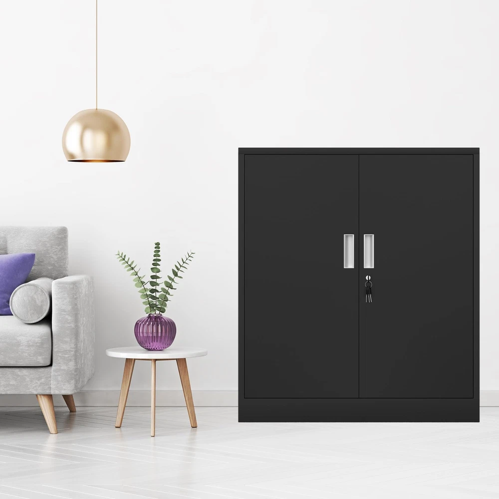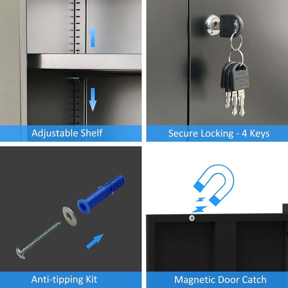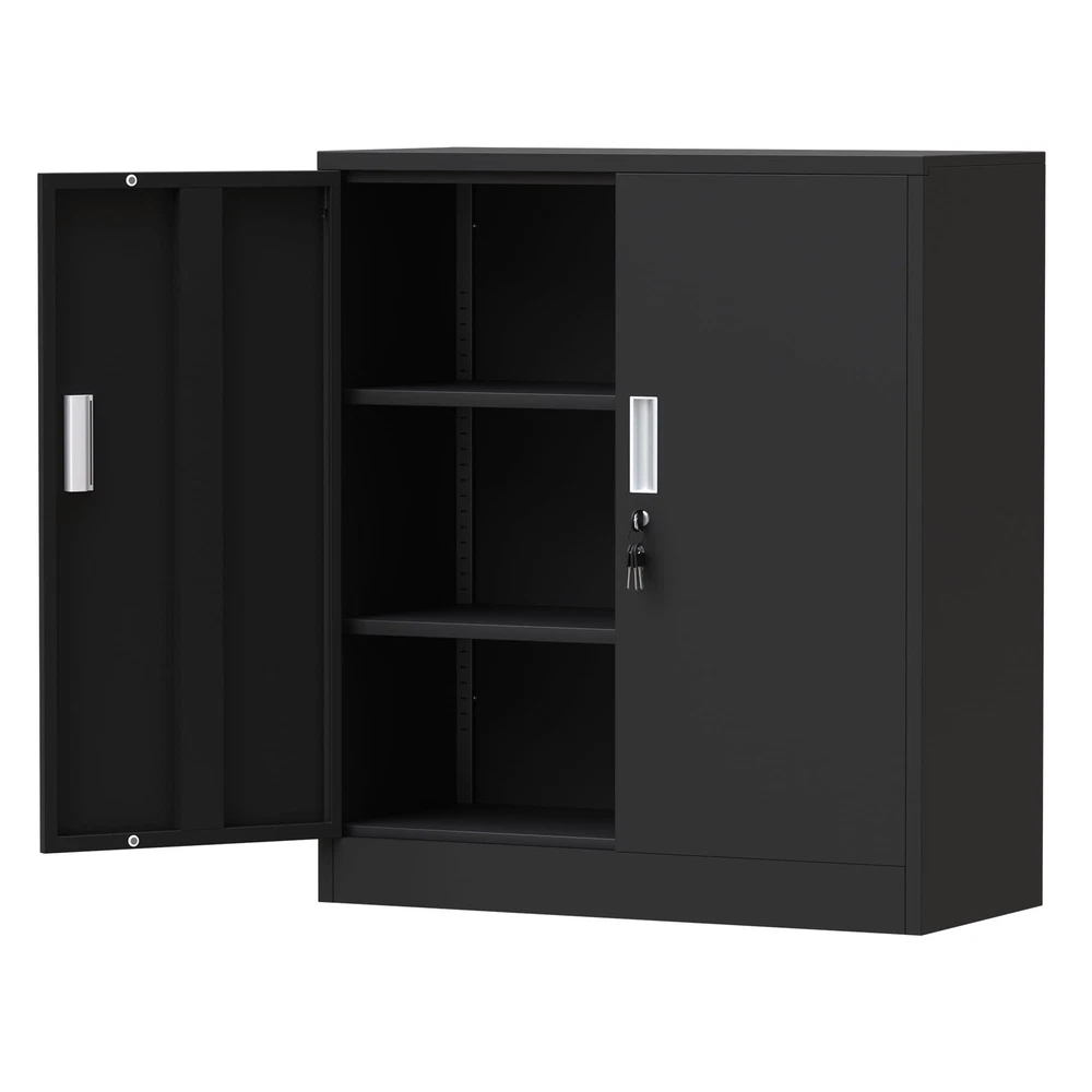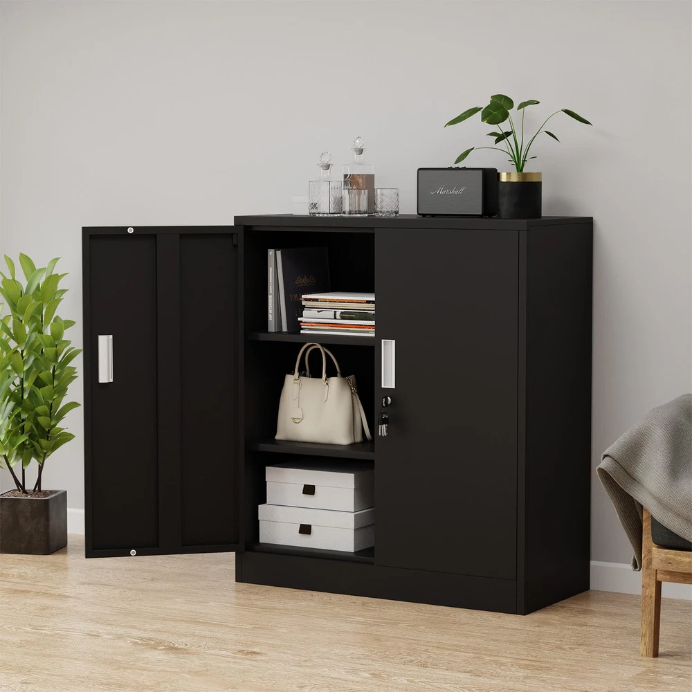 Product Details Material: Alloy Steel Surface finish: Odorless, pollution-free and recyclable powder coating With 2 height adjustable shelves and 1 fixed shelf (3 compartments) Two lockable wing doors with secure locking system and 4 keys Reinforced box construction makes the storage cabinet sturdy and durable Easy-to-clean interior due to smooth compartment floor Product Specifications Product Dimensions: 36.22"H x 31.5"W x 15.75"D Package Dimensions: 39''H x 19''W x 6''D Shelf Size: 31.4''W x 14.2''D x 0.8"H Overall Package Weight: 50 Lbs Overall Product Weight: 46 Lbs In the box 1 lockable metal storage cabinet 2 adjustable shelves and 1 fixed shelf 4 keys 2 Tipover restraint kit 2 Spare parts kit for Installation 1 Assembly Instruction LOCKABLE DOORS - This metal storage cabinet features locking doors with 4 keys, the cabinet is also fitted with door catch to keep the doors closed when it is unlocked ADJUSTABLE SHELVES - The shelves of this metal cabinet can be adjusted in height or detached to meet your variable storage needs, offering you maximum adaptability VERSATILE FUNCTIONALITY - This locking cabinet can be used in home, office, garage, utility room, workshops or anywhere needs to get de-cluttered STRONG STORAGE TOP - The cabinet top is designed with large loading capacity, it is an ideal open storage solution for storing or displaying items from small to large EASY TO ASSEMBLE - This lockable storage cabinet arrives flatpacked and can be built up easily with an included assembly instruction and a step-by-step assembly video STURDY AND DURABLE - Built with powder-coated metal & reinforced construction, this small storage cabinet has been designed to be hard-wearing and scratch-resistant