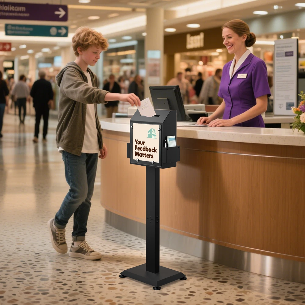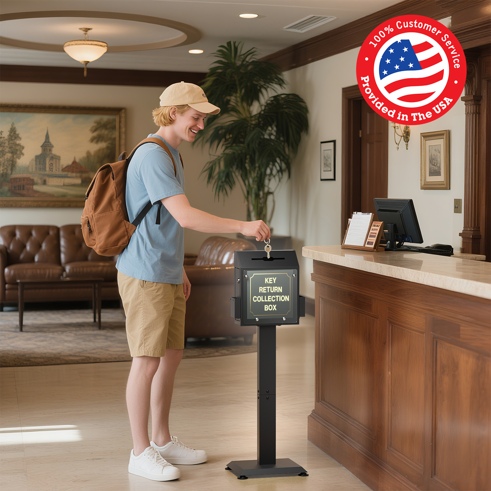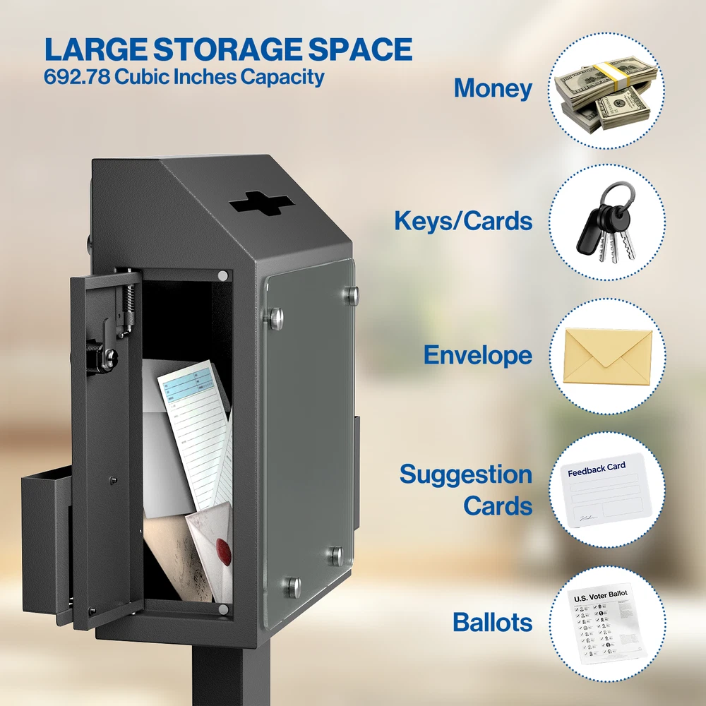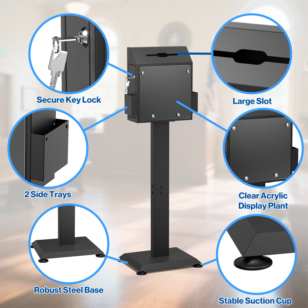 POCHAR Metal Donation Box for Fundraising - Suggestion Box with Stand, Slot & Lock - Locking Offering Boxes for Church, Floor Standing Prayer Voting Collection Ballot Boxes for Charity Election Events About this item FLOOR STANDING SUGGESTION BOX: POCHAR comment box features a robust steel stand and base with suction cups, ensuring the steady that does not shake or move during using. Made from durable cold-rolled steel, this comment box is engineered for long-term in high-traffic environments, unlike fragile acrylic alternatives. DONATION BOX WITH LOCK: This donation box for fundraising features a secure key lock on the side door (with 2 keys), keep the donations, ballots, or interior items security and privacy. And the voting box is equipped with a clear acrylic display plant for posters, announcements, or instructions to encourage participation. LARGE STORAGE SPACE: Standing at 41.7" tall, the offering box has a slot measuring 6.5" x 0.2", accommodating money, ballots, keys, cards or envelopes up to 6" wide. With a spacious storage capacity of 692.78 cubic inches, you won’t need to open it frequently due to fullness. MULTI-PURPOSE: Two side trays hold suggestion cards, questionnaires, brochures, or envelopes for easy access. Ideal as a offering box or prayer request box for churches, wedding card box, lobby or reception suggestion box, voting box for elections or schools, and key return collection box in car rental centers or hotels. HASSLE-FREE ASSEMBLY: Includes clear instructions for quick setup in just four steps. Start collecting feedback, ballots, or donations immediately. Perfect as collection box, raffle ticket box, advice box, complaint box or business card drop box for churches, hospital programs, offices, charity events, election centers, community organizations and public spaces. Check our eBay Store Front for more product listings! POCHAR Sales | eBay Stores Thanks for shopping POCHAR! The actual color of the product may be different from the image you see. This is due to the fact that every computer monitor, laptop, tablet and phone screen has a different capability to display colors and that everyone sees these colors differently. We try to edit our photos to show all of our products as life-like as possible, but please understand the actual color may vary slightly from your monitor.