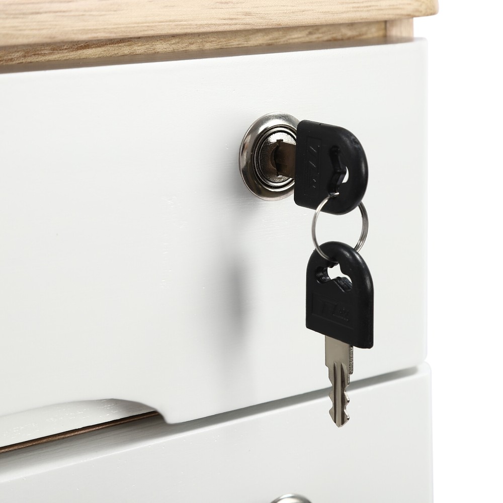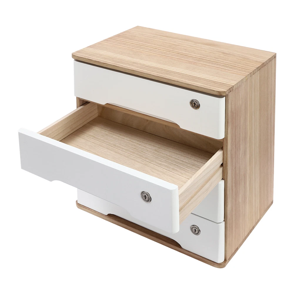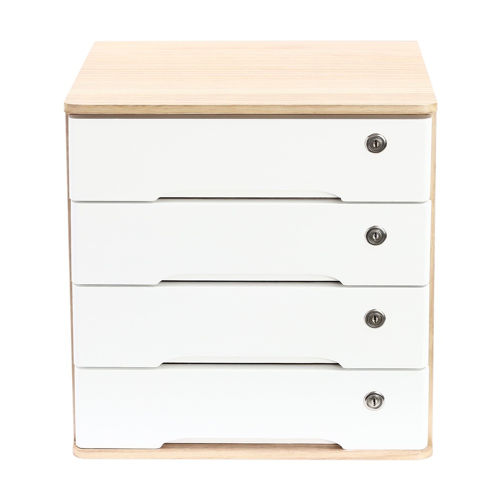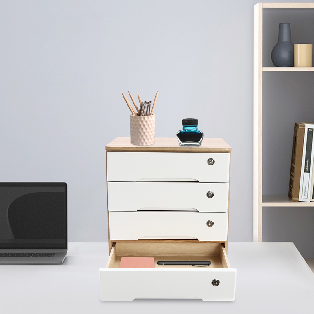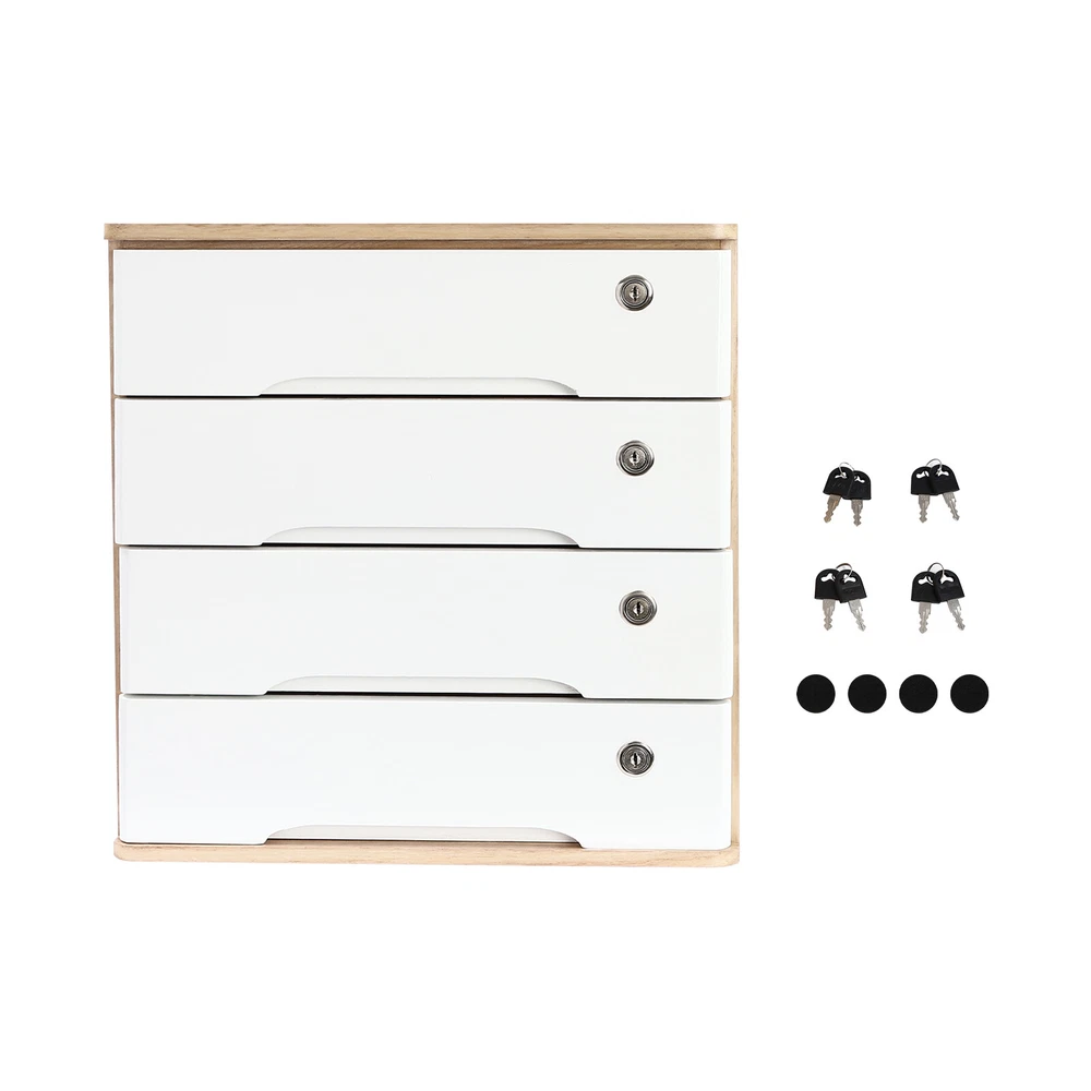 Description Do you feel annoyed by too many items on your desktop that are cluttered and unorganized? Our 4-tier storage cabinet can help you solve this problem. This product is made of high-quality material, which ensures a long service life. The 4 drawers are convenient for you to organize different daily items, and the locking design effectively protects your privacy. It can effectively help you reduce the pressure on your countertop, which is an ideal choice for you. Key Features Good Material: This product is made of high-quality tung wood with a spray painting process, which is hard, strong, anti-corrosion, not easy to deform, and has a long service life. Categorized Storage: The product has 4 drawers, so you can categorize and store your items in different drawers to give your desktop a neat look. In addition, the top can also be used to hold items, allowing you to maximize the use of your space. Protect Your Privacy: This product features the locking design that locks the drawer and can only be opened with the included key to protect your property. Strong Load-bearing Capacity: High-quality material and stable construction give the product a weight capacity of about 66.14 lbs, so you can store items on it with confidence. Save Space: This product is small in size (15.75*11.02*15.94 in), fully utilizing vertical space, thereby reducing the burden on the countertop. Ready to Use: This product does not require assembly, and you can start using it once you receive it, saving the tedious installation process and making it more convenient. Effortless Cleaning: Thanks to the smooth surface and simple construction, you can easily wipe off the dirt on it with a soft cloth. Thoughtful Gift: This is an ideal gift for colleagues, friends, and family to help them organize their belongings and keep their desks tidy. Good Customer Service: We stand behind all our guests and look forward to assisting you with your purchase. It is our pleasure to answer your confusion and questions. The end of the story between us is not "we sell and you buy". Details Comfortable Handles: Each drawer has an ergonomic handle that is not only comfortable but also easy for you to pull the drawer. Smooth Edge: The rounded and smooth edges not only add to the aesthetics of the product but also improve the safety of use. Anti-slip Pad: It can keep the product stable and less likely to slip off while you use it. Application This product can be used in an office, study, bedroom, dresser, kitchen, etc. It is suitable for organizing documents, files, pens, notebooks, handy stickers, remote controls, staplers, cosmetics, greeting cards, tickets, business cards, stationery, jewelry, hair accessories, and so on. Specification Color: Wood Color + White Shape: Rectangle Style: Modern Material: Tung Wood Process: Spray Paint Assembly Required: No Number of Tiers: 4 Number of Locks: 4 Number of Keys: 8 Max. Load Capacity: About 30kg/ 66.14 lbs Gross Weight: 6kg/ 13.23 lbs Package Size: 45.5*45*33 cm/ 17.91*17.72*12.99 in Product Size: 40*28*40.5 cm/ 15.75*11.02*15.94 in Package Included 1* 4-Tier Storage Cabinet 8* Keys 4* Anti-slip Pads Notes Please allow the slight color difference caused by the shooting light and the 1-3 cm error due to manual measurement, and make sure you do not mind before ordering.