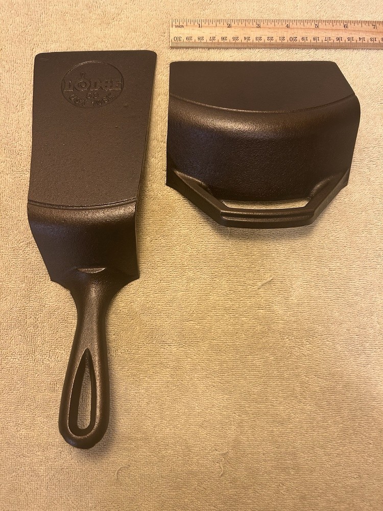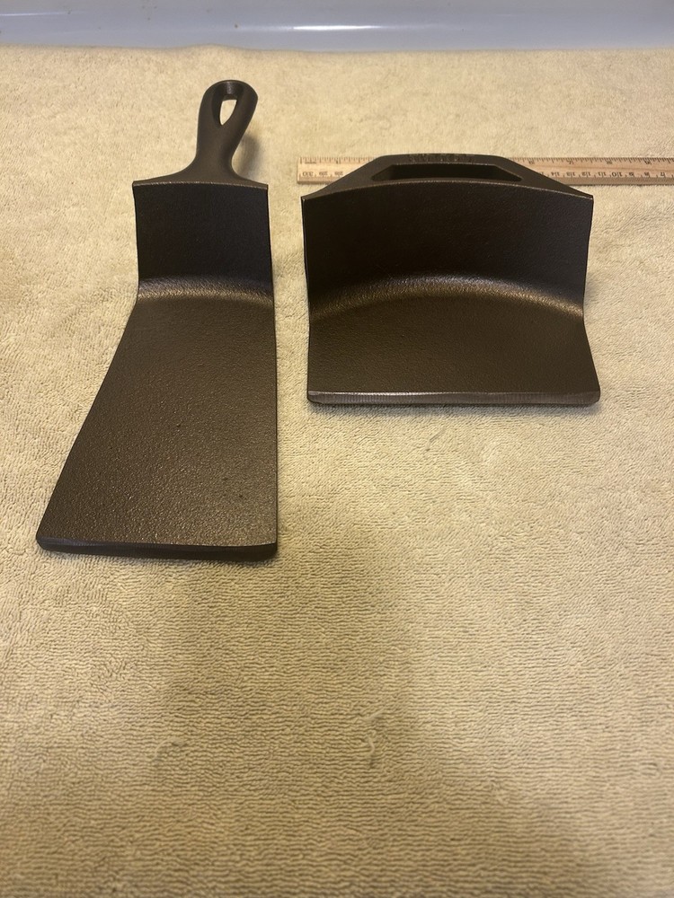 Handcrafted Lodge cast iron spatula and scraper made from a refurbished Lodge 10SK cast iron skillet. Cleaned, seasoned, and ready for use