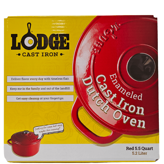Product details The Lodge 5.5 Quart Enameled Cast Iron Dutch Oven makes it easy to gather people around the table. Enameled cast iron can be used to broil, braise, bake, or roast in the oven up to 500 degrees Fahrenheit or to sauté, fry, or simmer on any stovetop. Plus, it can be used to marinate and refrigerate food. Lodge enameled cast iron is built to cook and look great for generations, so you can serve memories at every meal. Since 1896, Lodge Cast Iron has been making heirloom-quality skillets, pans, dutch ovens, bakeware, and grilling gear, bringing professional chefs, home-cooks, and outdoors folk everything they need to make incredible meals. We’re proud to be a family-owned company with a strong commitment to quality, values, and integrity. As the original, Lodge proudly set the standard in cookware that can go anywhere and do anything. Stainless steel knob and loop handles for great control Lodge 5.5 quart enameled Dutch oven Smooth glass surface won't react to ingredients