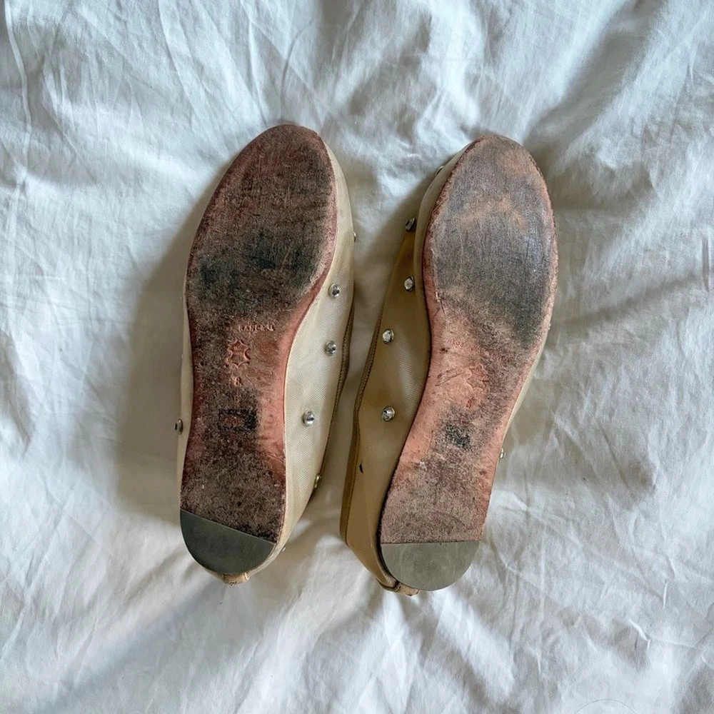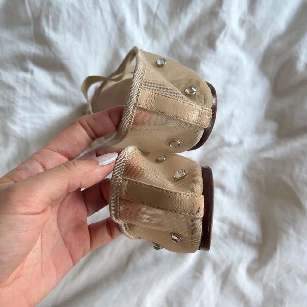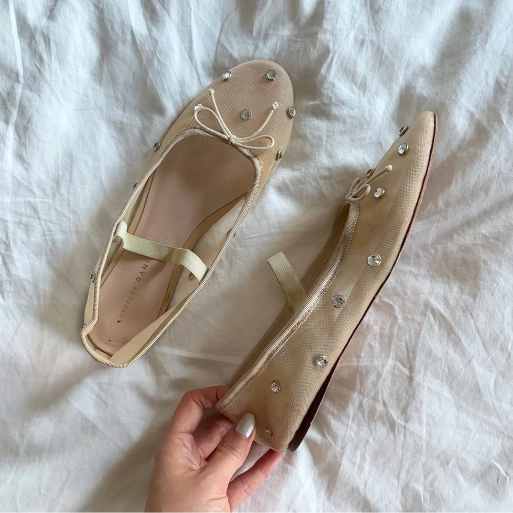 Loeffler Randall soft ballet flat in caramel mesh with clear crystal embellishment, an elastic bridge strap, and bow detail. Features a padded footbed with gold stamped logo and an almond toe. Size 8. Worn but in great condition, no noticeable flaws.