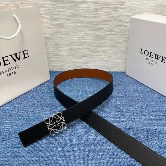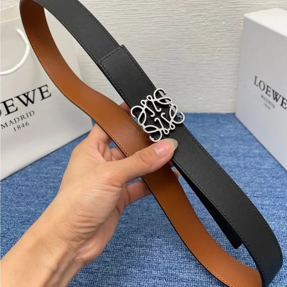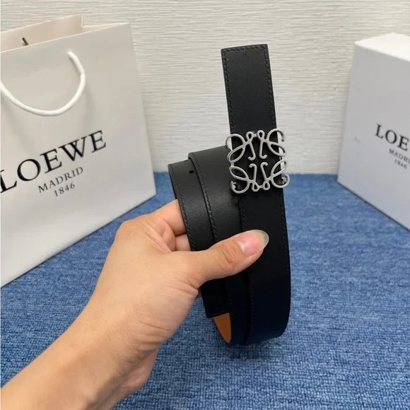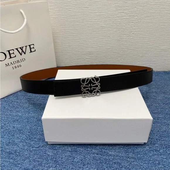Elegant Loewe belt. Black exterior with brown interior. Features a silver buckle.
