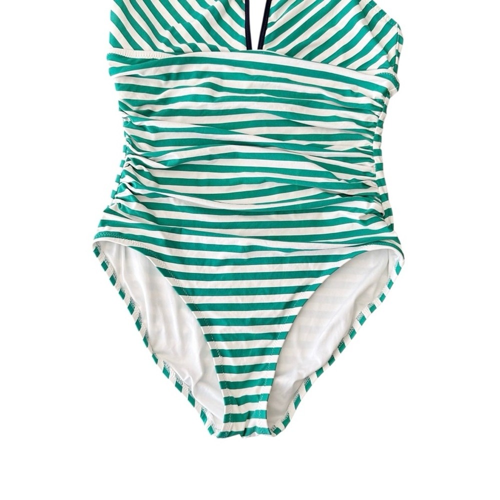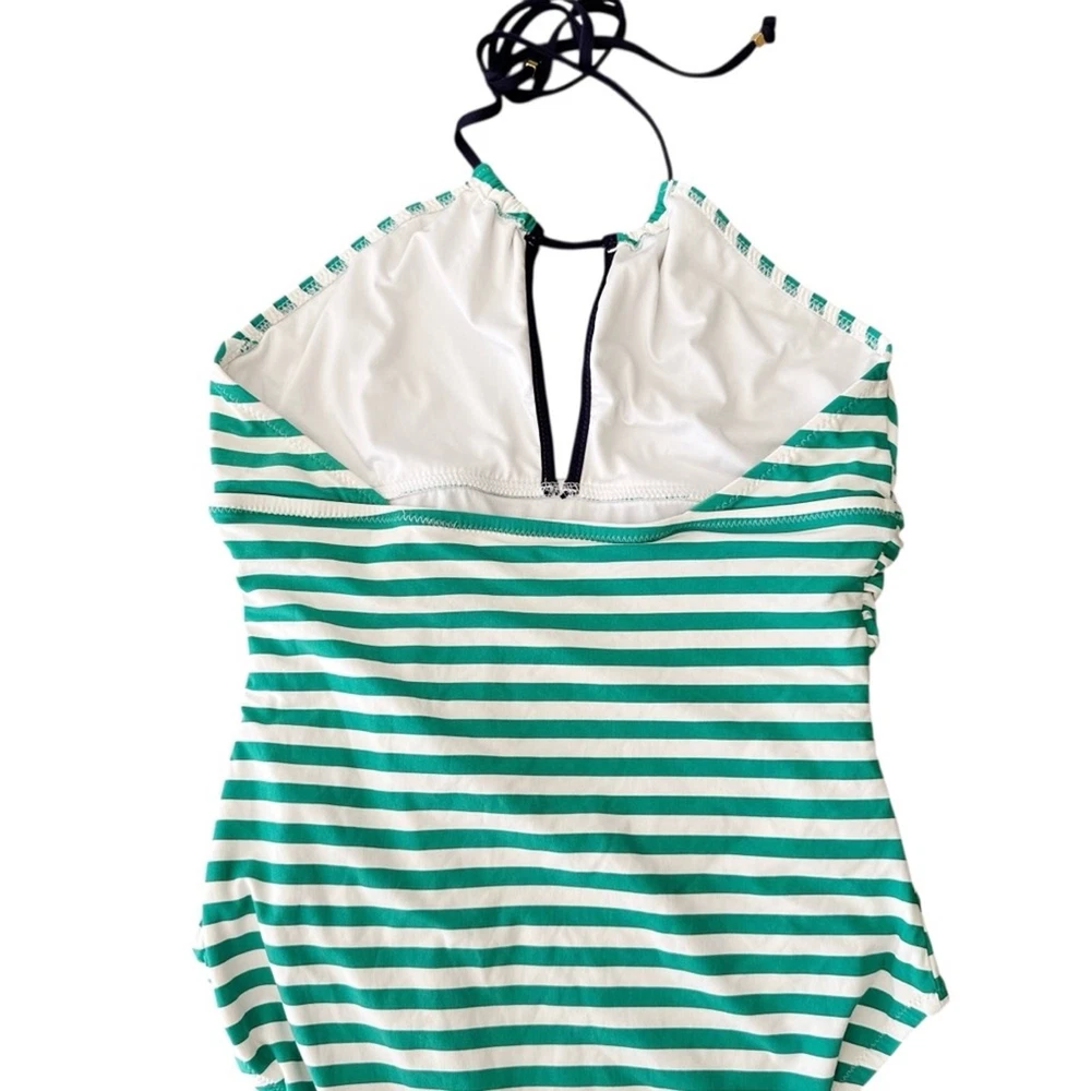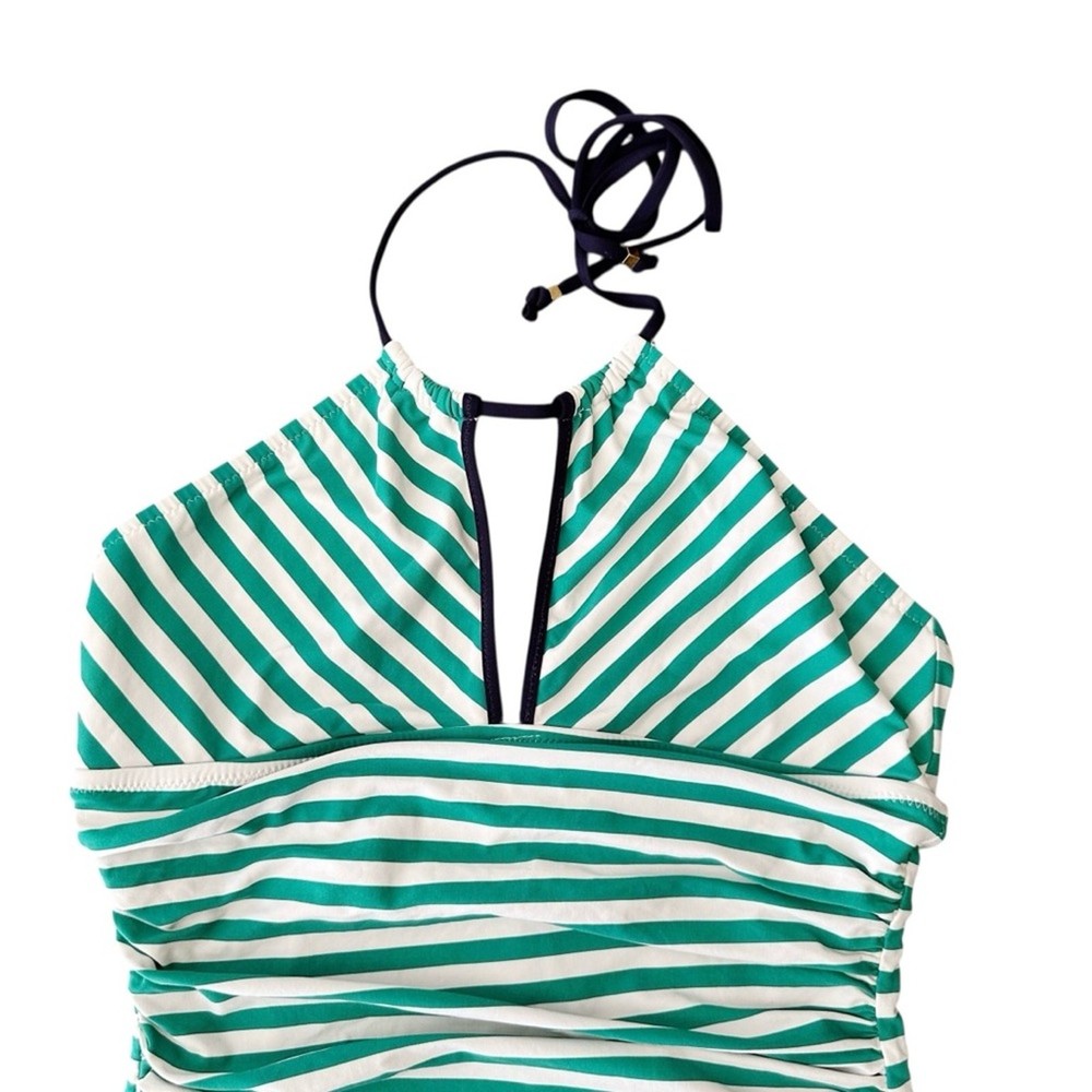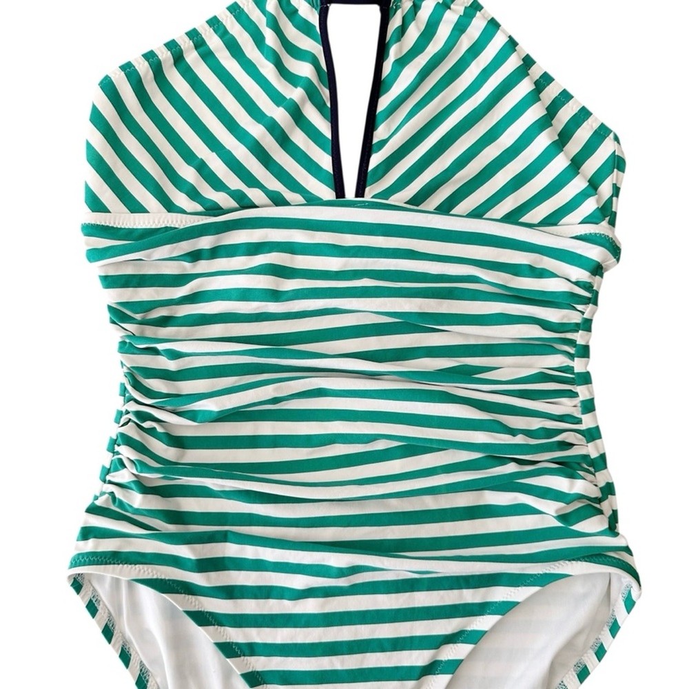 Loft Beach Striped High Neck Halter Slimming One Piece Swimsuit Ties at Neck Halter Style Full Coverage Ruching in front Size: 12 Excellent pre owned condition, no flaws, see photos