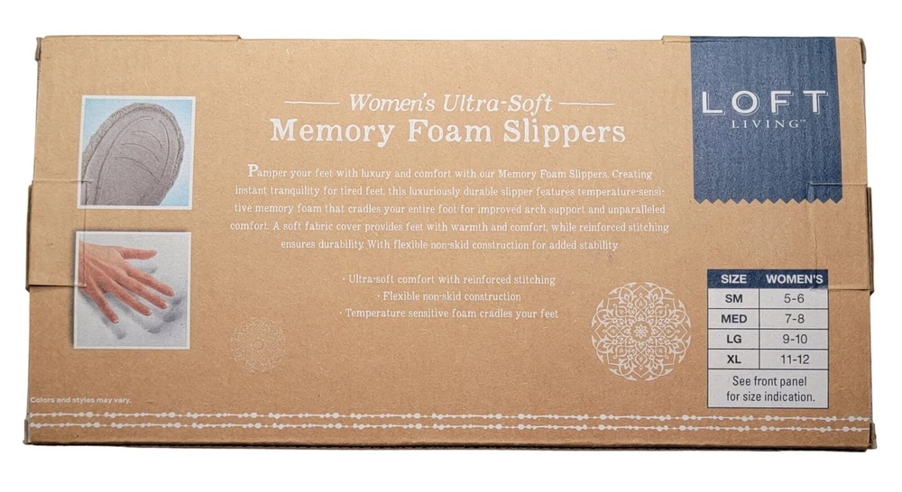 Slip into ultimate comfort with Loft Living's Women's Memory Foam Slippers. These medium size 7-8 slippers feature ultra soft faux fur and a soft foam cushion for a luxurious feel. They come in a stylish blue color, made from a cozy polyester blend. • Loft brand memory foam slippers • Size: Medium, fits 7-8 • Ultra soft faux fur and foam • Stylish blue color • Made from cozy polyester blend Features: • Memory Foam, Ultra Soft Size: Womens Medium, 7-8 Condition: New With Box NWB Please review all photos and descriptions closely before purchase, thank you! Smoke free workspace Please read the description for further details and measurements, Thank you!
