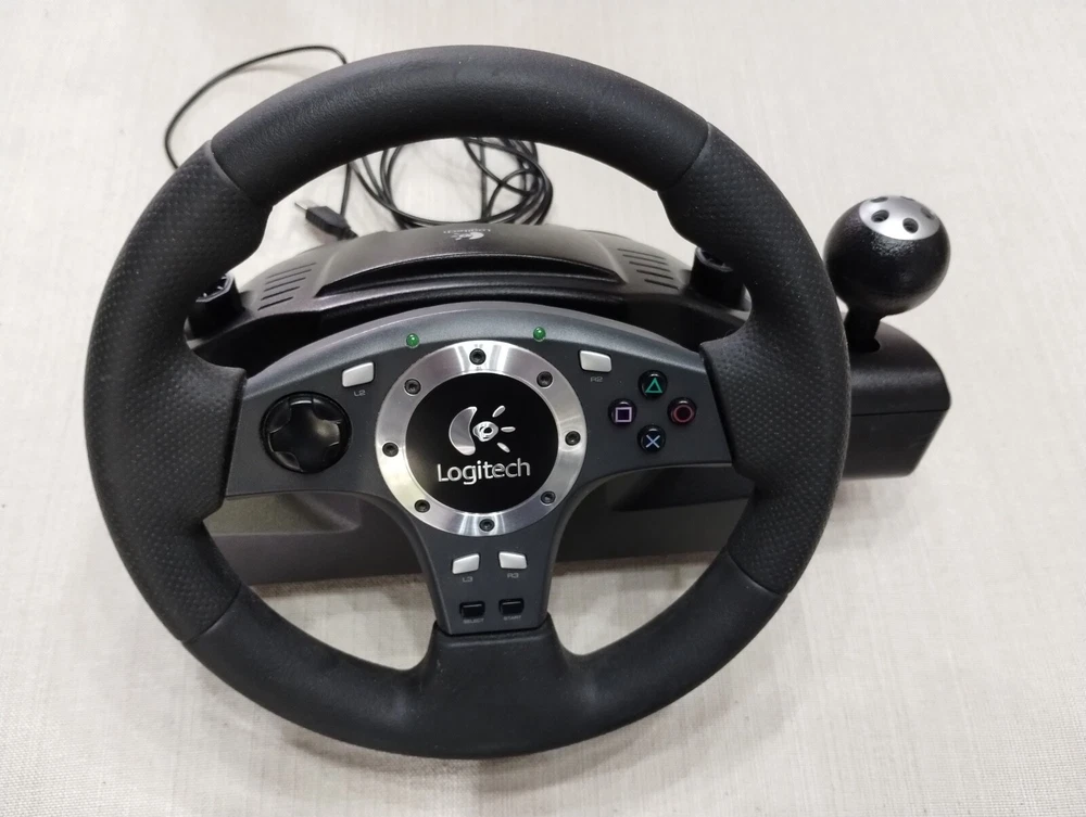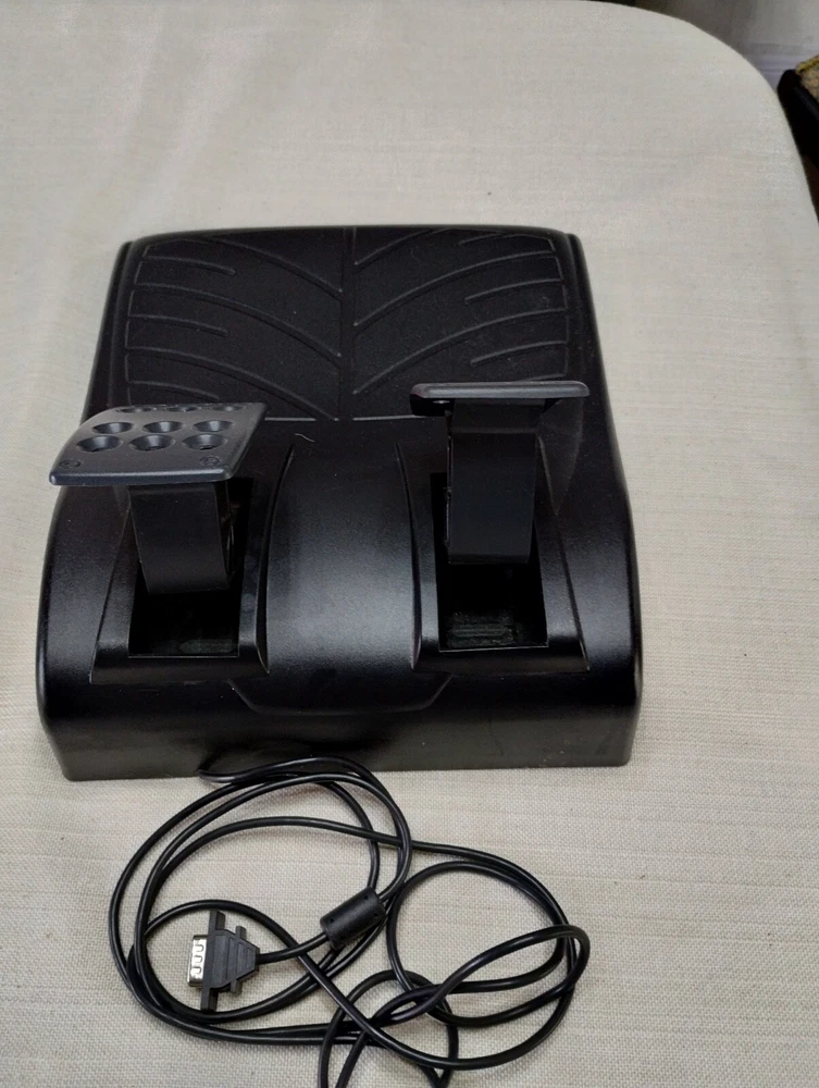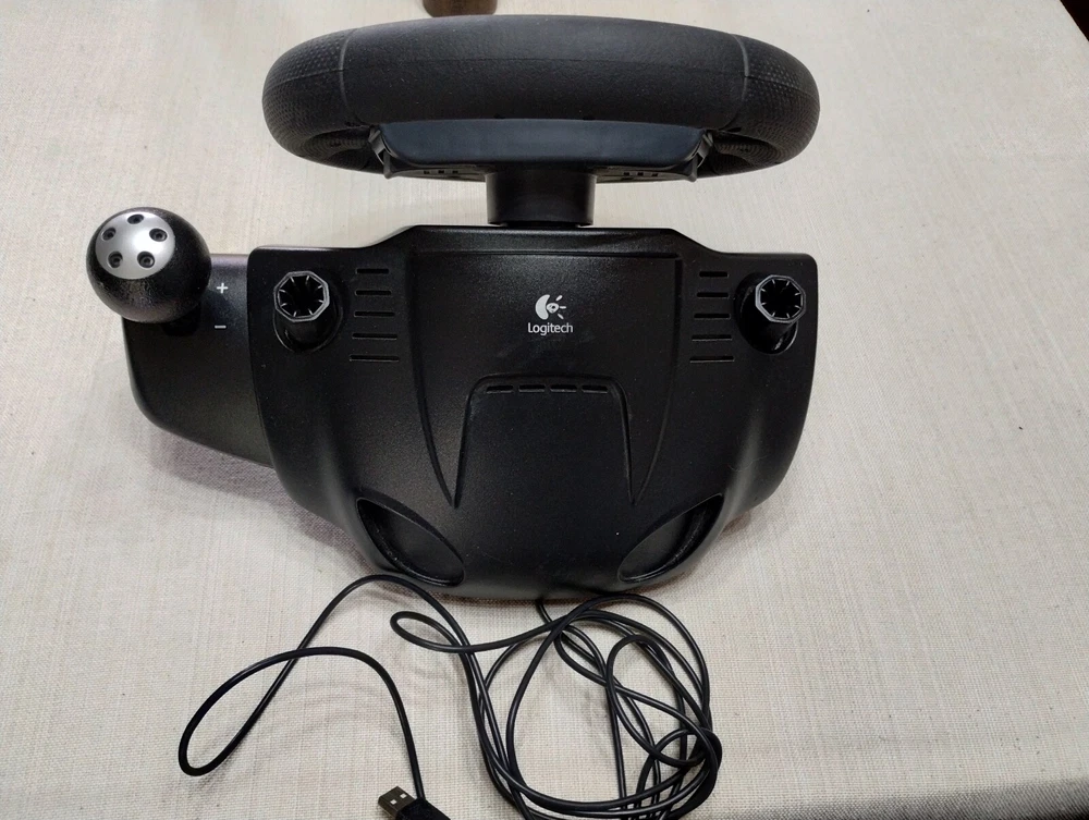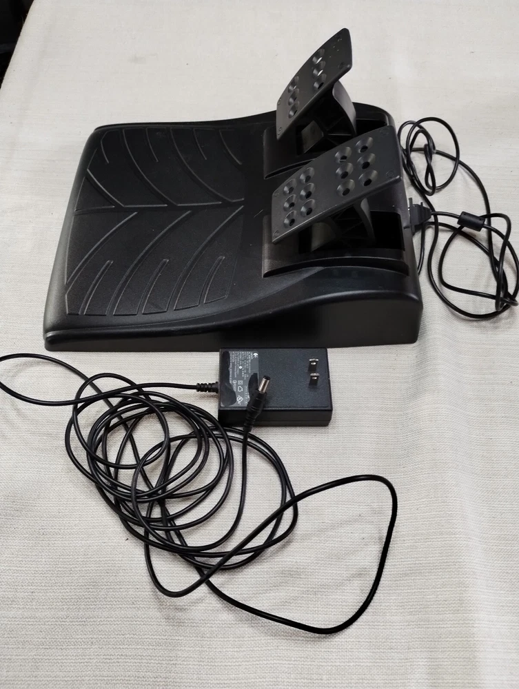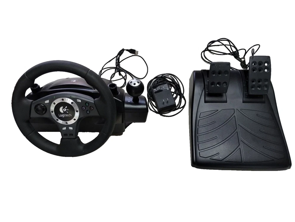 Logitech Driving Force Pro Steering Racing Wheel, and Pedals, with all Cords. Model # E-UJ11, works on pc PS2 and ps3. Works great.