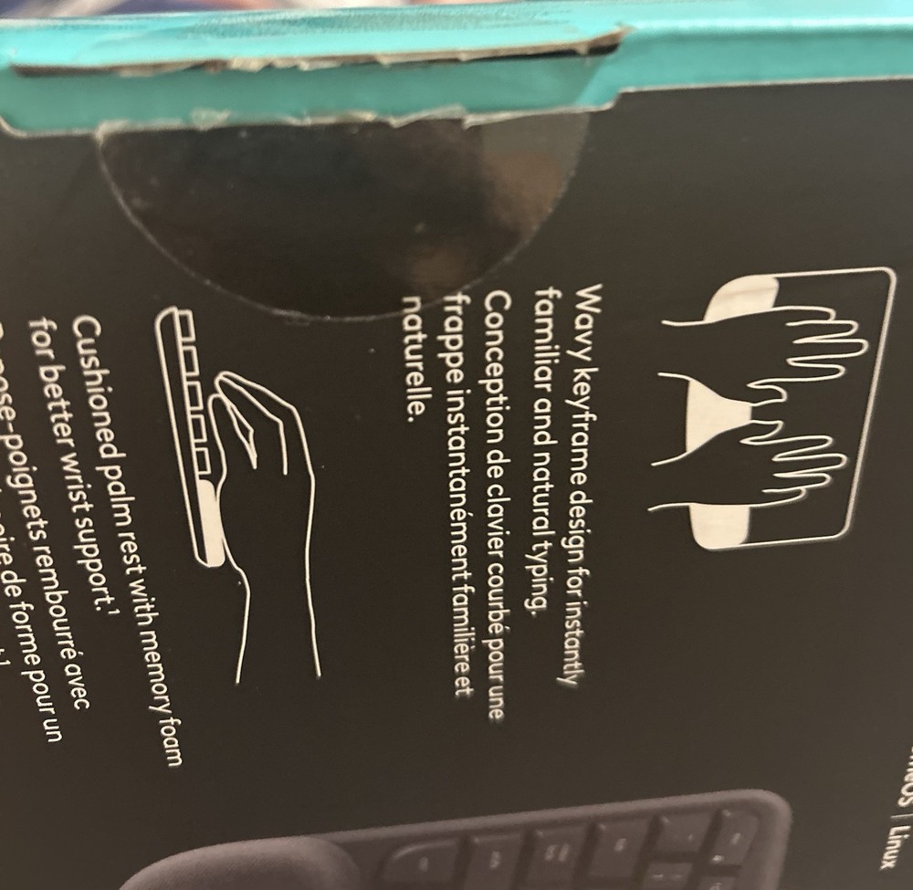 Wireless ergonomic keyboard and mouse shaped for day-long comfort. Brand new. Box has been opened but keyboard and mouse was never taken out of box.