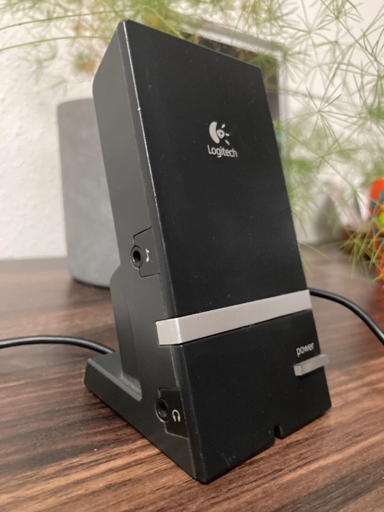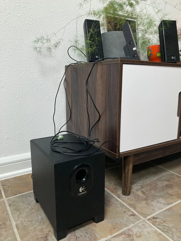Pump up the volume with this set of Logitech X-240 Speakers. Accepting offers. 2.1 channel surround/satellite system comes with a subwoofer and supports THX and Dolby Digital surround sound formats. Plug the headphone jack into your projector (as shown) for an immersive movie experience. Rectangular-shape, black crystal material speakers function with a wide range of brands and models, making them versatile. Easy to set up and compatible with any 3.5mm jack. Plug into your laptop or MacBook’s headphone port or to your PC for the ultimate gaming experience. Bluetooth dongle included as shown in photos. (Compatible with iPhone) -Wired speakers -RMS power of 50 W -Audio inputs for AUX and a 3.5 mm jack. -Adjustable subwoofer power -Additional port for headphones with easy volume control and hideaway cellphone cradle Disclaimer: Used speakers and woofer, small crinkle at the base of subwoofer cone. Does not affect sound quality. Detachable wired speakers will come with subwoofer in padded box for safety.