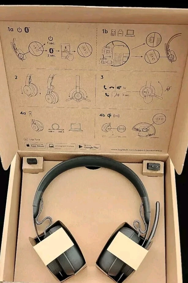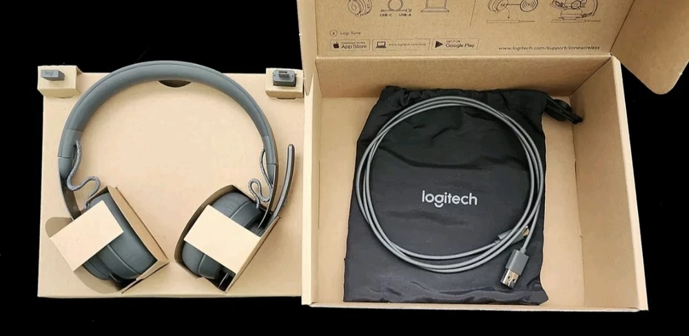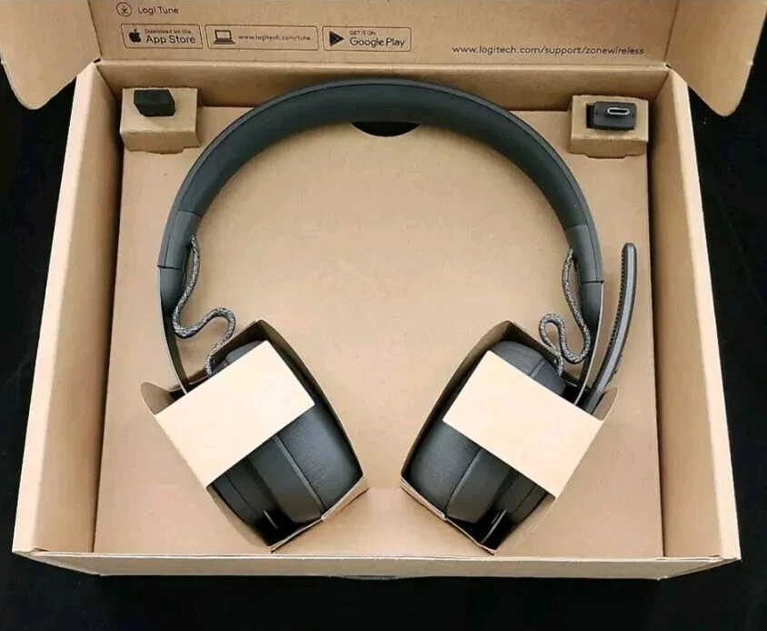 Logitech Zone Wireless 981-000853 Bluetooth Headset Team Version Brand: Logitech Model Name: Logitech Zone Form Factor: On Ear Noise Control: Active Noise Cancellation Model/ Part Number: 981-000853 Wireless Version: Zone 900 Team version Connectivity Technology: Wireless Bluetooth 5.0,USB-A,USB-C Wireless Communication Technology: Bluetooth Logi Tune: Yes Yes ANC: Yes Qi Charging: Yes Audio Driver Size: 1.3 in (32 mm) Noise cancelling mic: 2 Omni-directional, MEMS CONDITION : ITEM IS "NEW*- OPEN BOX PLEASE CHECK PHOTOS CAREFULLY AND MESSAGE US WITH ANY QUESTIONS. OVERVIEW Bluetooth headset designed to help you work from anywhere with exceptional sound, flip-to-mute mic, and Qi wireless charging. Open workspaces are great for collaboration, but not so great when the noise around you Makes it hard to concentrate. Active noise cancellation substantially reduces unwanted ambient sound, so you can get focused and stay focused. Great for music and talking with immersive sound for listening to music and a noise-canceling mic that ensures that your voice is heard on the other end of a call not the noise around you. Intuitive and simple controls to adjust volume , play and pause music, start and end calls, flip-to-mute the microphone, power on/off, active noise cancellation, and Bluetooth pairing. Also supports wireless Qi charging. DESIGNED FOR RELIABLE COMFORT Zone Wireless is designed for every workday. The silicone-padded headband is lightweight and provides just the right clamping force for a fit that’s so comfortable you might forget you’re wearing a high-performance headset. Soft leatherette ear pads are cushiony and breathable, so your ears don’t get hot. ONE UNIFYING + AUDIO RECEIVER Use Zone Wireless headset with multiple devices. This single receiver plugs into the USB-A port on your computer and provides a reliable connection up to 33 ft (10 m) away from mic and keyboards, and up to 99 ft (30 m) away from the headset. With no need to ever unplug the receiver, it never gets misplaced or lost. No more choosing between your headset, mouse or other peripherals— now you can use them all simultaneously. FULL CONTROL WITH LOGI TUNE Open the Logi Tune mobile app on your smartphone or Tune Desktop on your computer to easily setup, control, and customize your Zone Wireless headset. From the elegantly intuitive dashboard, confidently manage mute, view charging status, modulate sidetone controls, and tweak the 5-band EQ sliders (or choose one of the custom presets) * DIMENSIONS * Headset Height: 6.88 in (174.7 mm) Width: 6.96 in (176.7 mm) Depth: 2.78 in (70.7 mm) Weight: 6.38 oz (180.8 g) Ear pad dimensions Height: 2.78 in (70.7 mm) Width: 2.78 in (70.7 mm) Depth: 0.65 in (16.4 mm) Zone Wireless Receiver Height: 0.85 in (21.5 mm) Width: 0.54 in (13.6 mm) Depth: 0.24 in (6 mm) NOTE * The adapter is only compatible with Logitech Zone Wireless Bluetooth Receiver. * * TECHNICAL SPECS * Microphone Type: Omni-directional dual MEMS mic arraY Frequency Response: 85 ~ 20KHz @-3dB (MEMS mic freq resp) Speakers Frequency response (music mode): 30 ~ 13KHz @ -10dB Frequency response (talk mode): 100 ~ 8KHz per TIA920 Audio compliance: Compliant to EN 50332 Battery Built-in battery (Lithium ion) Battery life (talk time): 14 hrs (ANC on), 15 hrs (ANC off) Battery life (listening time): 14 hrs (ANC on), 16 hrs (ANC off) Charging Qi Wireless charging enabled * Qi wireless charger sold separately * USB-A to C charging cable: 4.26 ft (130 cm) *Available only for Zone Wireless* Wireless Bluetooth version: 5.0 Wireless range: Up to 100 ft /30 m (open field line of sight) ** COMPATIBILITY ** Works with common calling applications across almost all platforms and operating systems. Works with Windows, Mac, or Chrome-based computers via USB-C, USB-A, Bluetooth and iOS or Android Bluetooth enabled devices. INCLUDED IN THE BOX Wireless headset USB-A receiver USB-C adapte rCharging cable Travel Bag User documentation