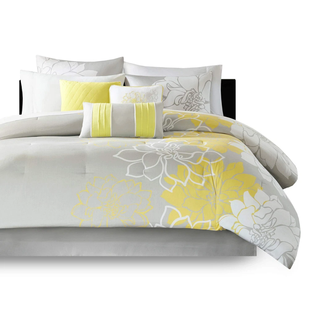 The Lola Comforter Set transforms your bedroom into a beautiful and graceful space. A gorgeous floral print pops against the solid cotton sateen comforter and shams (1 for Twin/Twin XL Sizes) for a stunning transitional look. Three decorative pillows with embroidered details and fabric manipulation add texture and dimension to the bed. A solid bed skirt completes the look with sophistication. This bedding set is also OEKO-TEX certified, meaning it is free of any harmful substances or chemicals for your comfort and wellness. The items in the set may arrive in a rolled or compressed packaging, which will need to be fluffed up or steam ironed before use to smooth out the wrinkles. This bedding set is available in 4 different colorways: Aqua: soft white and aqua hue pops against taupe grey ground; Yellow: soft white and yellow hue pops against taupe grey ground; Grey/Peach: soft white and peach hue pops against grey ground; Purple: soft white and purple hue pops against taupe grey ground. The Lola Comforter Set brings beauty and grace to your bedroom. A large scale printed floral motif is displayed on the cotton sateen comforter and shams for a chic transitional look. Cotton cover is Oeko-Tex certified to be free of any chemicals and harmful substance paired with hypoallergenic filling for a perfect all season bedding. Set includes: 1 Comforter: 104"W x 92"L, 1 Decorative Pillow: 18"W x 18"L, 1 Bedskirt: 78"W x 80"L + 15"D, 1 Decorative Pillow: 12"W x 20"L, 1 Decorative Pillow: 16"W x 16"L, 2 King Shams: 20"W x 36"L + 2"D Care instructions: machine washable