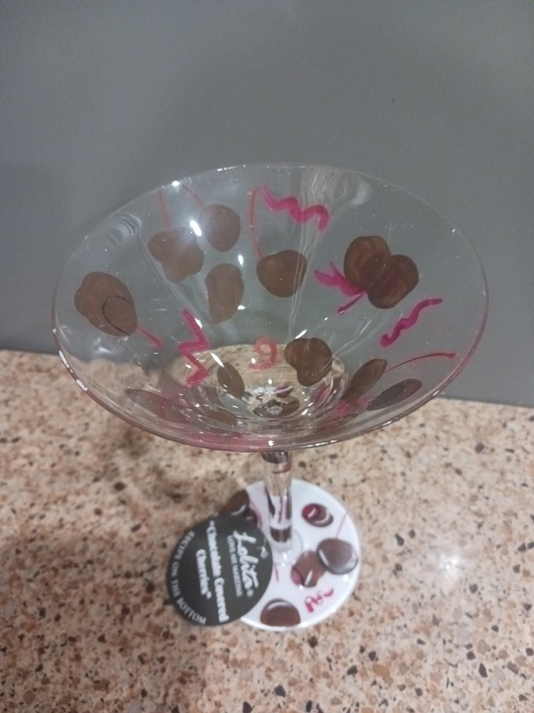 The Lolita Love MY Martini CHOCOLATE COVERED CHERRIES Martini Glass is a modern, round glassware item designed for serving one person. Made in China, this novelty martini glass features a clear color with a unique chocolate-covered cherries pattern, adding a fun and stylish touch to your home bar collection. Perfect for mixing and serving your favorite cocktails in a visually appealing manner, this glass serves both practical and decorative purposes for any kitchen or dining space.