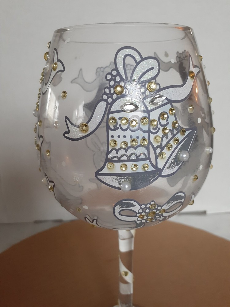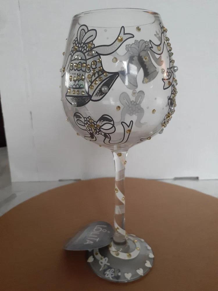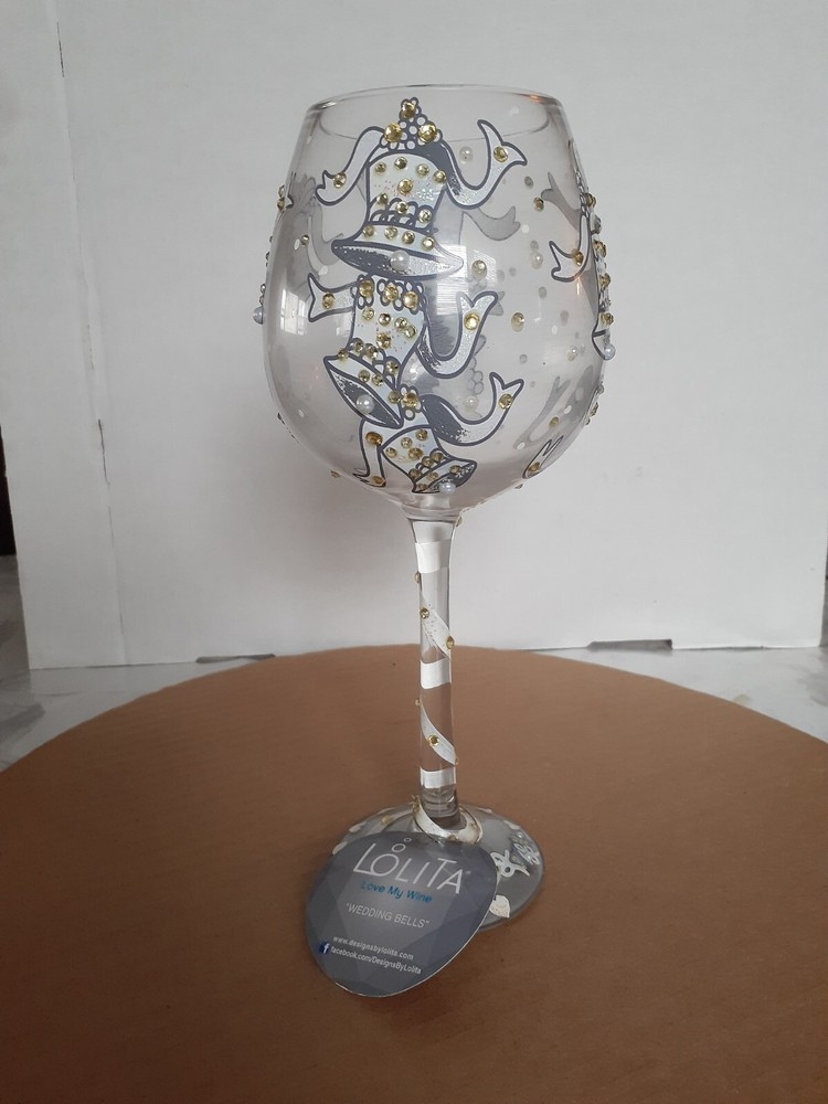 This beautiful Lolita "Wedding Bells" Love My Wine glass is perfect for any occasion, with a charming wedding bells theme that is perfect for a new bride and groom to inspire feelings of love and joy. The glass is made of high-quality materials, including hand-painted glass and a sturdy base that can hold up to 15 oz of liquid. The round shape and classic style of this wine glass make it perfect for adults, and it comes with a protective case to ensure that it arrives in perfect condition. With careful care and hand washing, this glass will be a cherished part of any collection. Add it to your home or give it as a gift to someone special.