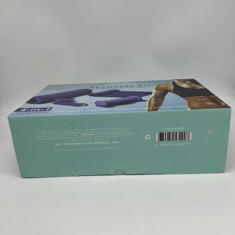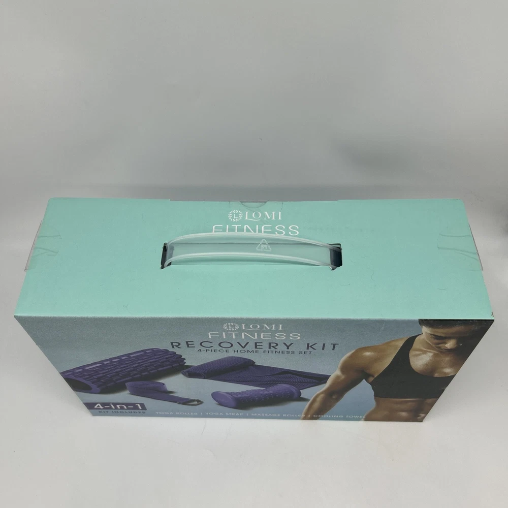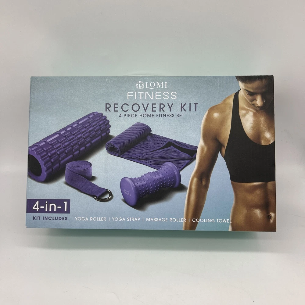Lomi Fitness Recovery Kit 4-Piece Home Fitness Set New Purple Includes: yoga roller, yoga strap, message roller, & cooling towel