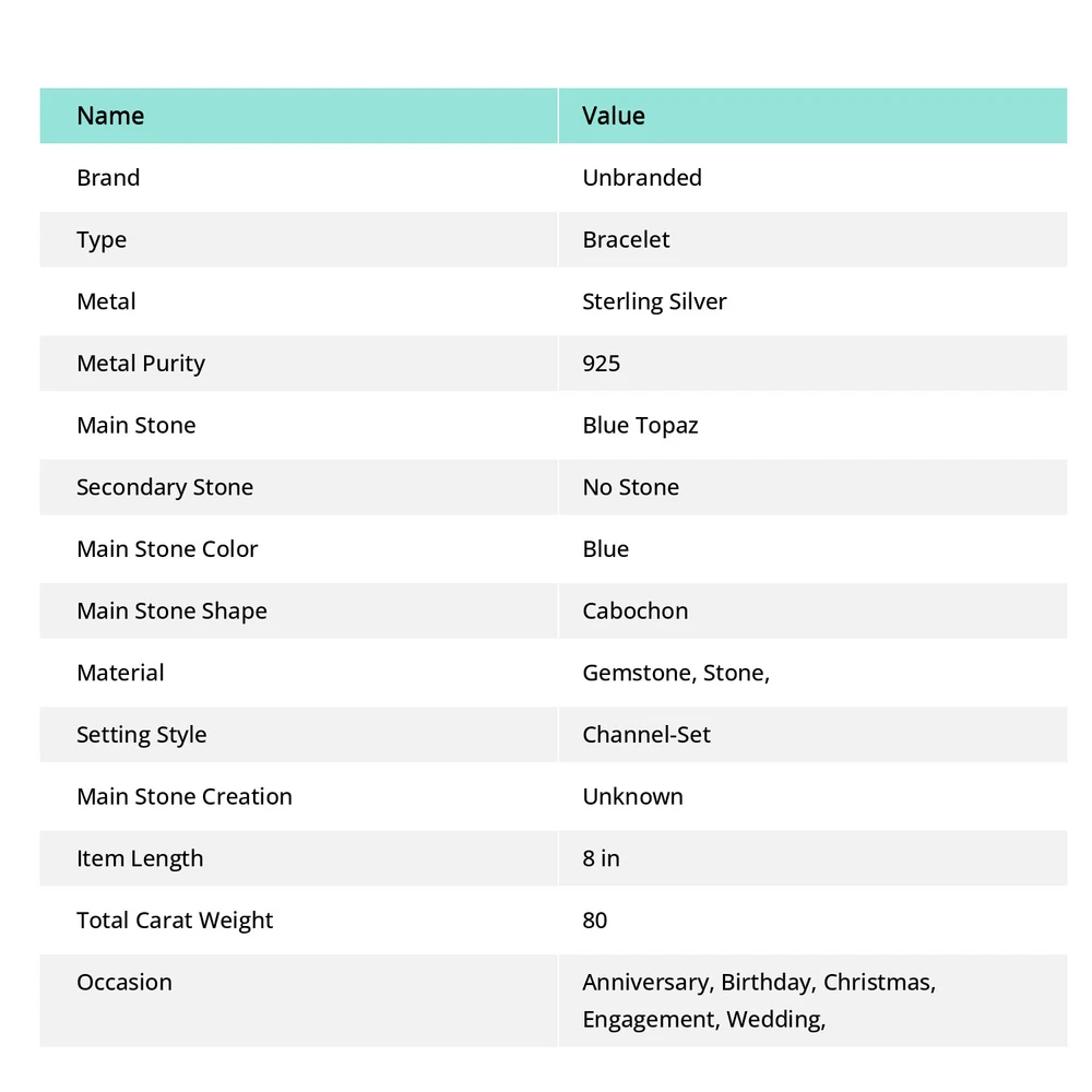 hirajewels London Blue Topaz Gemstone Handmade 925 Sterling Silver Jewelry Bracelet 7-8" j7 Country/Region of Manufacture : India Material : Gemstone Stone Theme : Beauty Brand : Unbranded Shape : Cabochon Certification : dose not apply Base Metal : Silver Diamond Color Grade : dose not apply Collection : dose not apply Color : Blue Main Stone : Blue Topaz Main Stone Creation : Unknown Main Stone Shape : Cabochon Main Stone Treatment : Not Enhanced Metal : Sterling Silver Occasion : Anniversary Birthday Christmas Engagement Wedding Secondary Stone : No Stone Style : Chain Type : Bracelet Metal Purity : 925 Chain Type : Round Link Pattern : Traditional Number of Diamonds : As seen in picture Closure : Toggle Gemstone Clarity Grade : Eye Clean Features : Engraved Number of Gemstones : As Seen In Picture Seller Warranty : Yes Cut Grade : Good Charm Type : Traditional Country of Origin : India Diamond Clarity Grade : Flawless (FL) Setting Style : Channel-Set Era : Undated Colored Diamond Intensity : Fancy Main Stone Color : Blue Item Length : 8 in Total Carat Weight : 80 Listed Using: Jumbo Lister