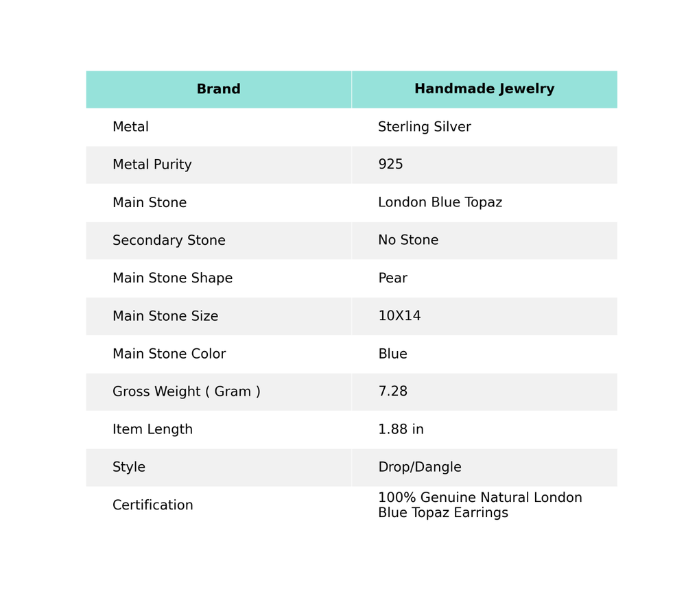 handmade_jewelry1 Pear LONDON BLUE TOPAZ Stone 925 Silver Dangling Bezel Engagement Boho Earrings Base Metal : Sterling Silver Metal : Sterling Silver Metal Purity : 925 Main Stone : London Blue Topaz Secondary Stone : No Stone Main Stone Creation : Main Stone Treatment : Not Enhanced Certification : I guranteed authenticity of Earrings. Features and further details We Are Selling Fashion Jewelry Since 1973 Additional Features: First See All Details items Specified Also Buy Items Details: 925 Sterling handmade_jewelry1 Package Includes: Poly Wrap Packing Contact us Payment eBay Payment Accept Return 30 Days Free Return Accept Shipping 14-30 Days India Post International Feedback I Hope I received 5-Star rating If your Any Question Also Please Contact me Than Any Negative Comment option Select Disclaimer Every Piece of Jewelry Tells a Story