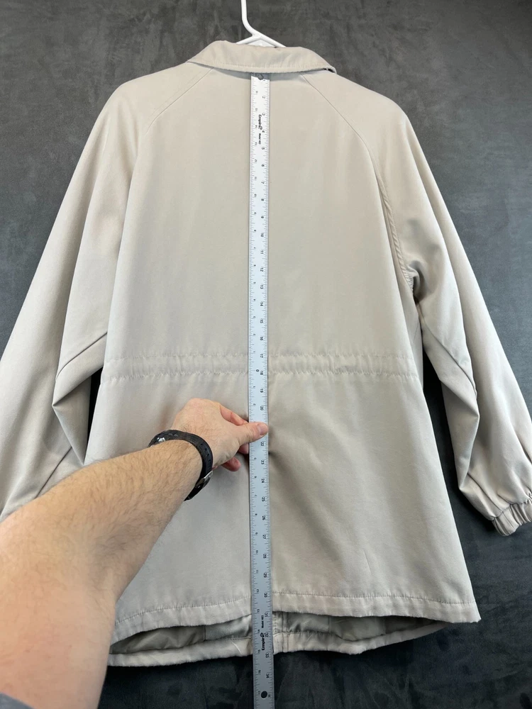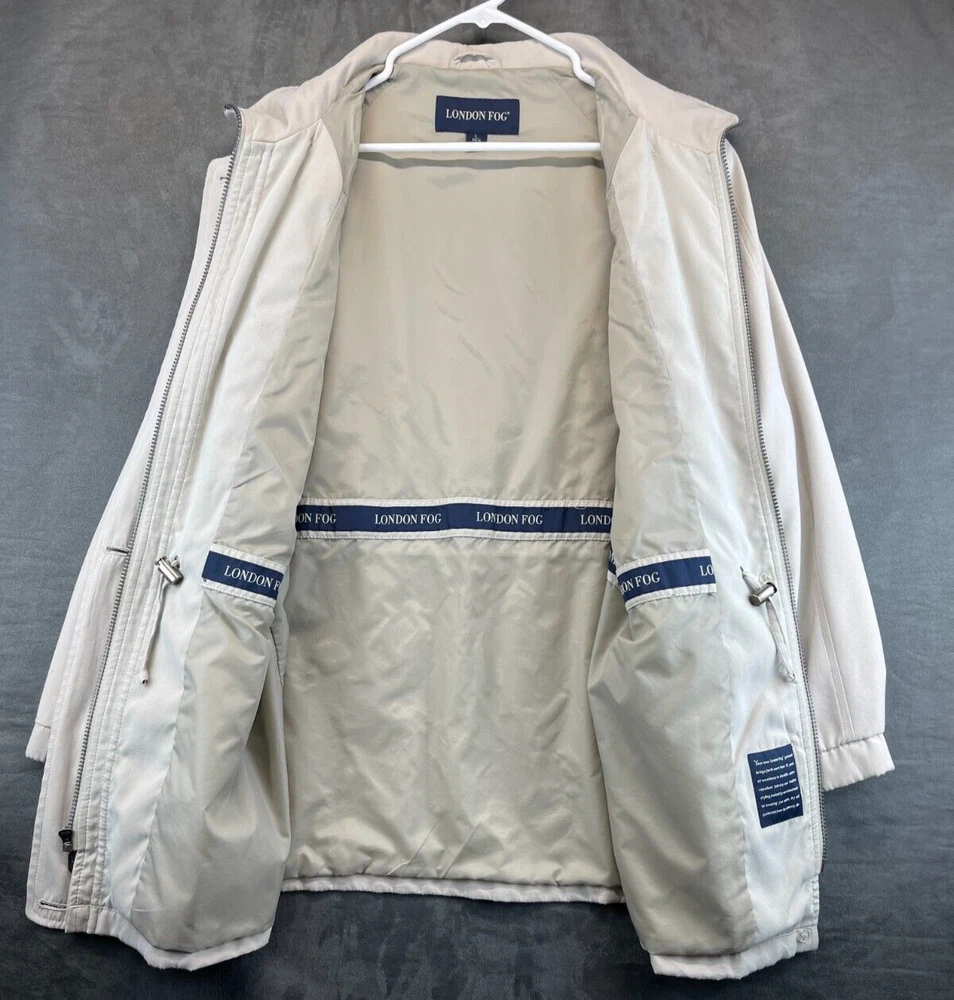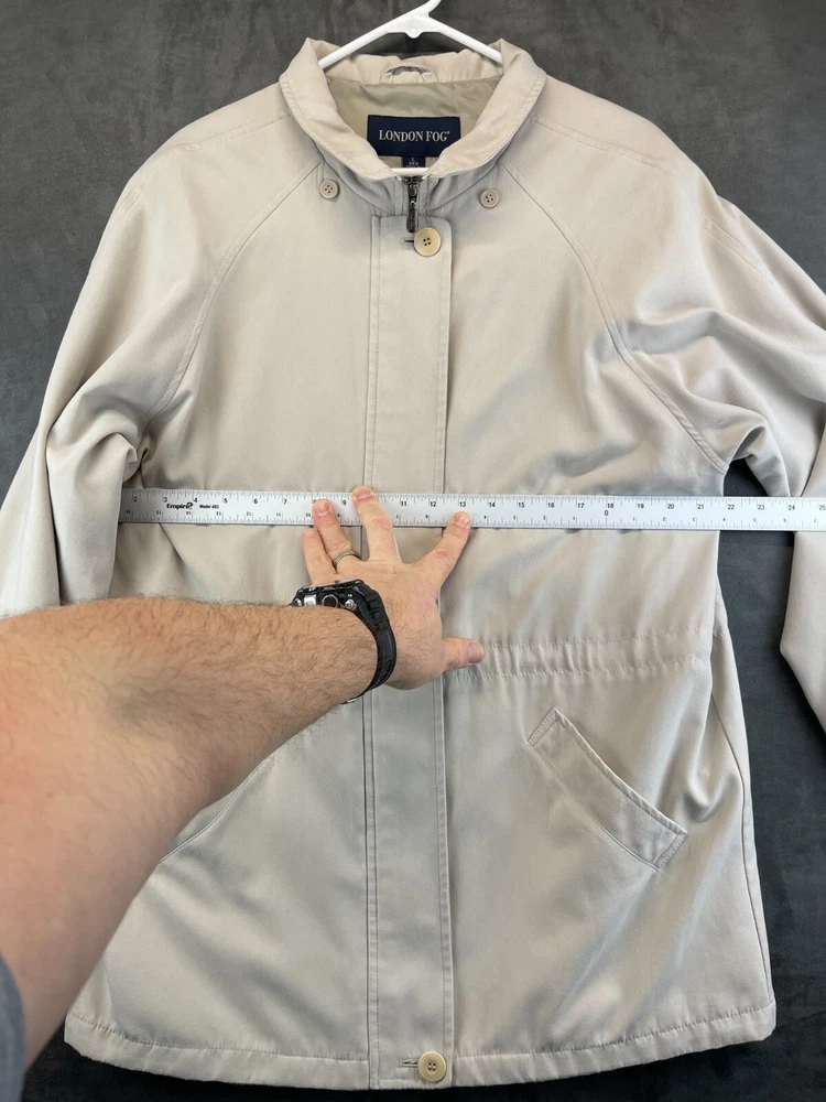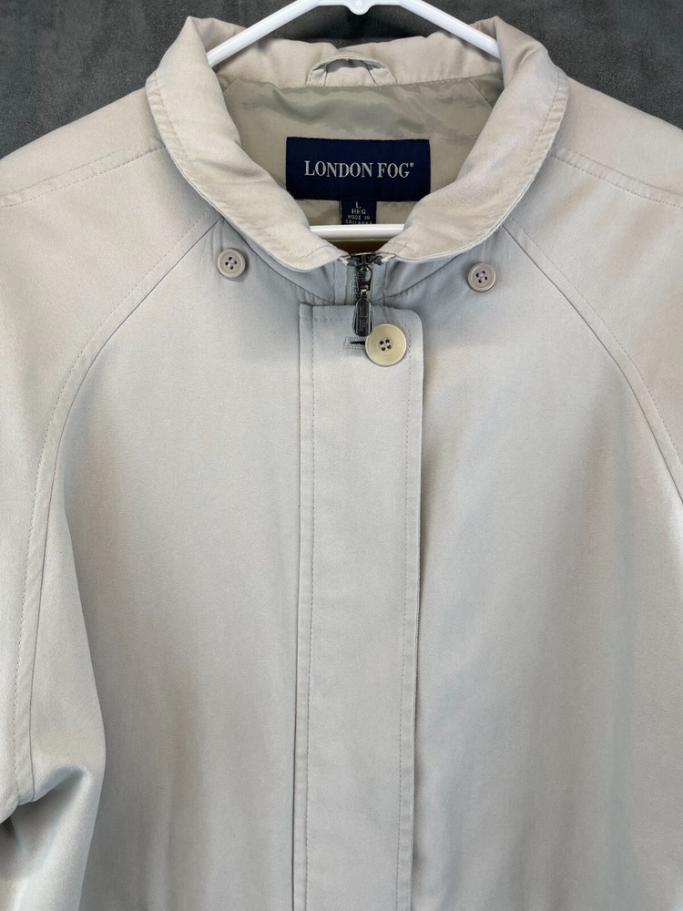 This London Fog 3/4 Length Jacket for men in size Large is designed in a beige color with a full zip closure. Made of polyester softshell fabric with a nylon lining, it features a spread collar and is water-resistant. The jacket also includes button and zipper accents, suitable for travel, parties, formal events, or business occasions in the fall, winter, or spring seasons. Very good preowned condition with normal preowned wear. Please see all photos; specifically for measurements. For clothing specifically, see photos for all measurements and/or any issues if applicable. Pay close attention to the measurements as the size of the garment may quite possibly be different than the actual measurement(s) due to washing, shrinkage, or stretching as these are used clothes. The size in the title is the size on the tag of the garment. See photos for measurements of actual measurements as they may differ. ALWAYS CHECK THE MEASUREMENTS IN THE PHOTOS. This will remove any questions on measurements as well as always cover the possibility of human error in the listing(s) in the case of a typo or oversight. All clothing and shoes have been washed/cleaned, and are cleaned and stored in a smoke free environment. However, please keep in mind that these are preowned items and there is always a possibility of there being preowned dirt, dust, or stray hairs present. I do my best to clean these items with hair collecting products in the dryer after being washed, and by hand with shoes. If shoe trees appear in the photos, they are for photography purposes only to illustrate how the shoes look filled out, and are not included. I am available for questions. I accept or negotiate reasonable offers. Have an amazing day. Thank you.
