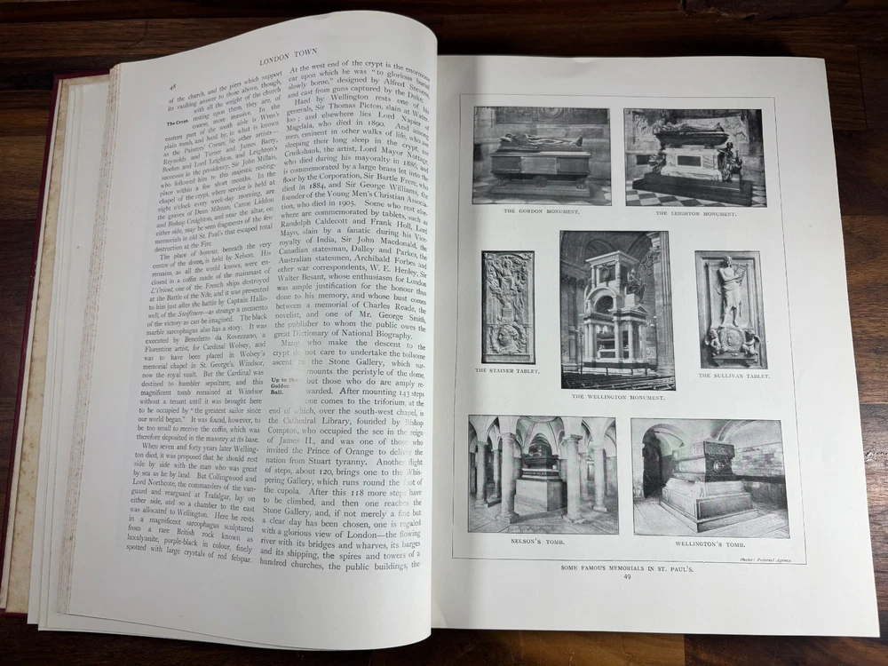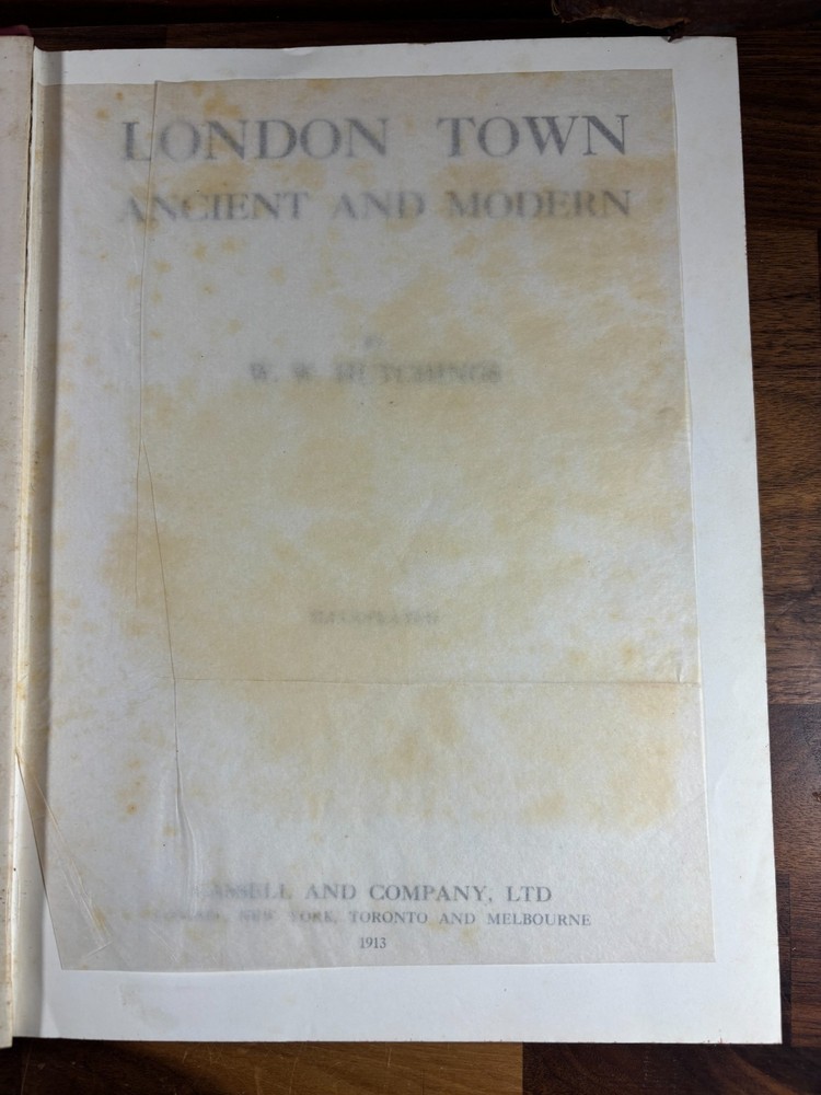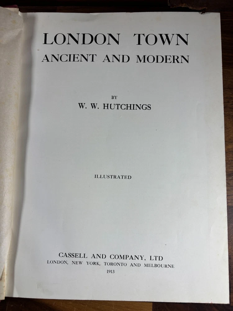 Item Description An original 1913 hardback edition of London Town: Ancient and Modern by W. W. Hutchings , published by Cassell and Company . Bound in its original red cloth , this illustrated volume presents a richly detailed portrait of London as it stood in the years immediately before the First World War a city balancing its ancient past with rapid modern change. Book Details Title: London Town: Ancient and Modern Author: W. W. Hutchings Publisher: Cassell and Company, Ltd Year: 1913 Binding: Hardcover, original red cloth Illustrations: Illustrated (in-text) Language: English Condition Original red cloth binding present Inside text is complete and whole General age-related wear Spine and boards intact Pages complete Small scratches and signs of wearing along the sides of the cover and spine. Two small dents on the top of the covers. Please review photos carefully. History of the Book London Town: Ancient and Modern was published in 1913 , at the very end of the Edwardian era. It belongs to a tradition of lavishly illustrated “heritage” books produced for the educated general reader — works that combined history, architecture, social commentary, and visual material. This volume is closely related to Hutchings’ earlier and larger work London Town: Past and Present (1909), but issued here as a single, accessible volume . It captures London just before the dramatic transformations brought about by World War I , making it a valuable snapshot of the city’s streets, institutions, and daily life at a pivotal historical moment. Cassell books of this type were intended to be both informative and handsome , suitable for personal libraries and gift-giving — which is why surviving copies in original cloth are now sought after by collectors of London history and Edwardian publishing. About the Author W. W. Hutchings was an early-20th-century British writer known for producing well-researched, readable historical and topographical works , particularly focused on London. Rather than writing strictly academic history, Hutchings specialised in bringing the story of the city to life for ordinary readers blending historical facts with anecdote, observation, and visual material. His work reflects a strong Edwardian interest in civic identity, heritage, and the idea of London as both an ancient and modern world capital. Ideal For Collectors of antiquarian or Edwardian books Readers interested in London history Historians of pre-World War I Britain Decorative or reference libraries Dimensions: Weight - 1.29KG Height - 29cm Width - 21.5cm Thickness - 2cm